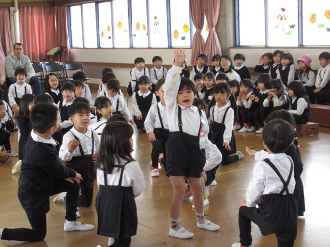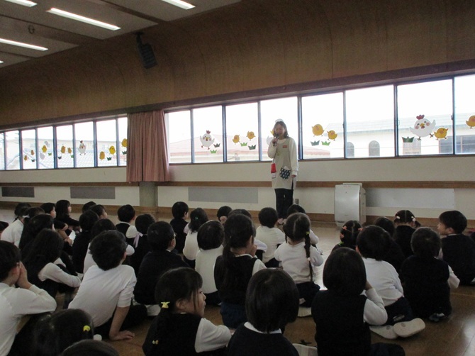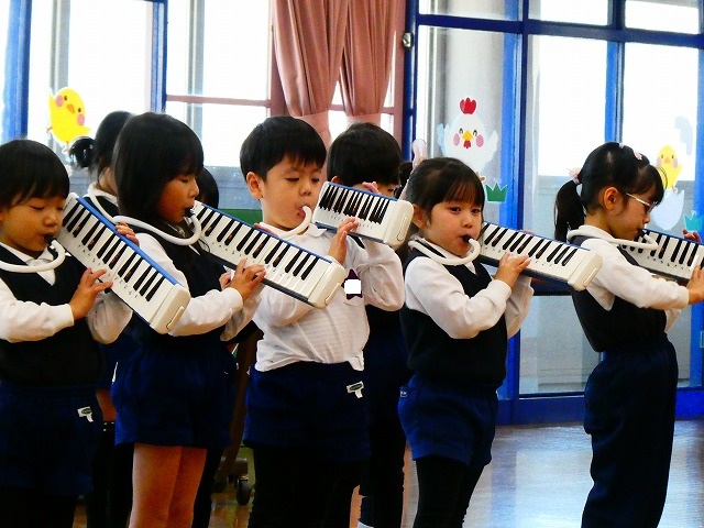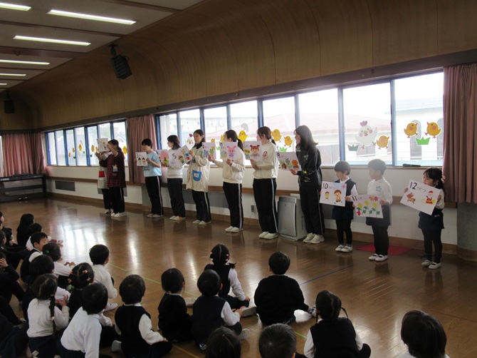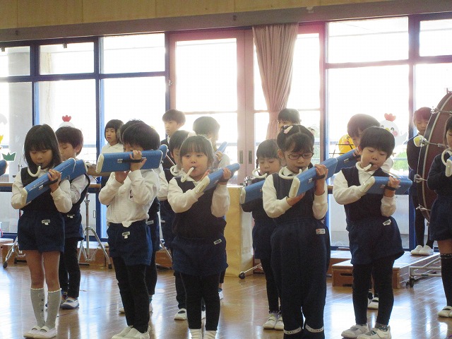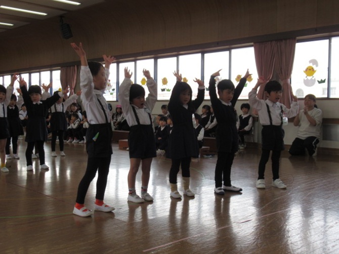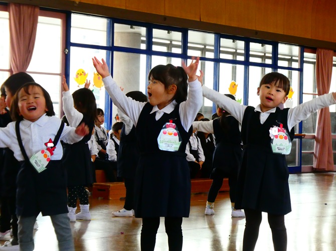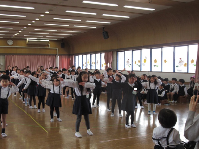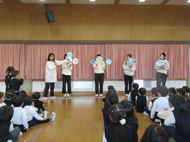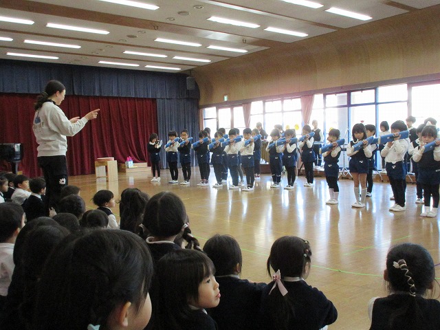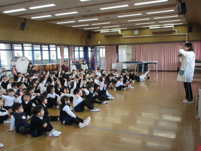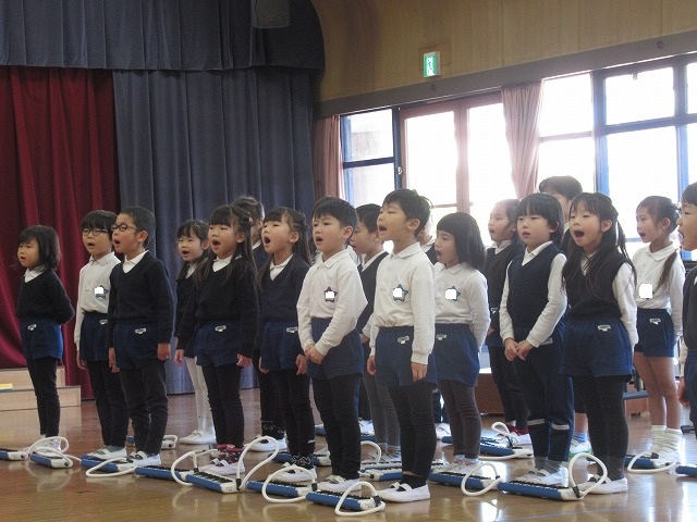 みんなでホールに集まり、あお組さんの音楽会の曲を聞いたり楽しかったことや頑張ったことなど、2学期を振り返って冬休みを楽しく過ごすための「冬休みのお約束」をしました。