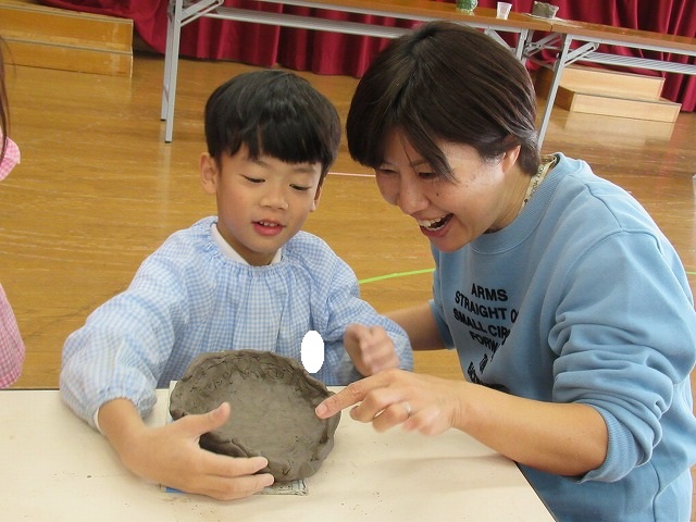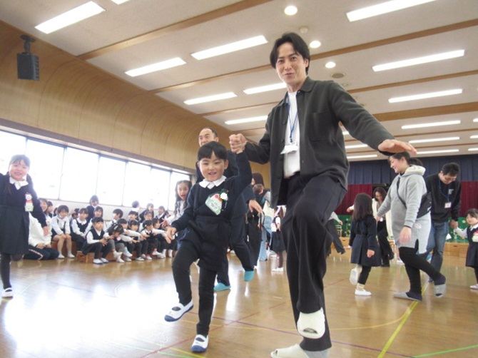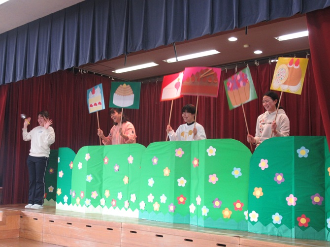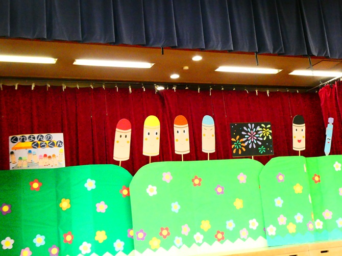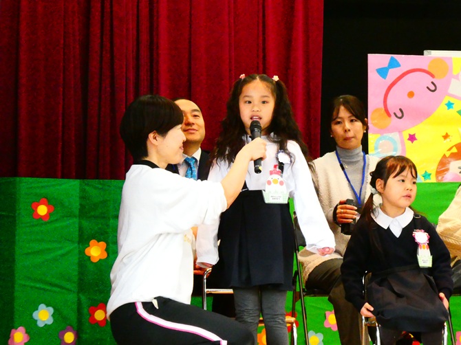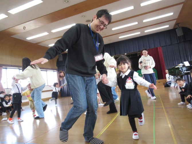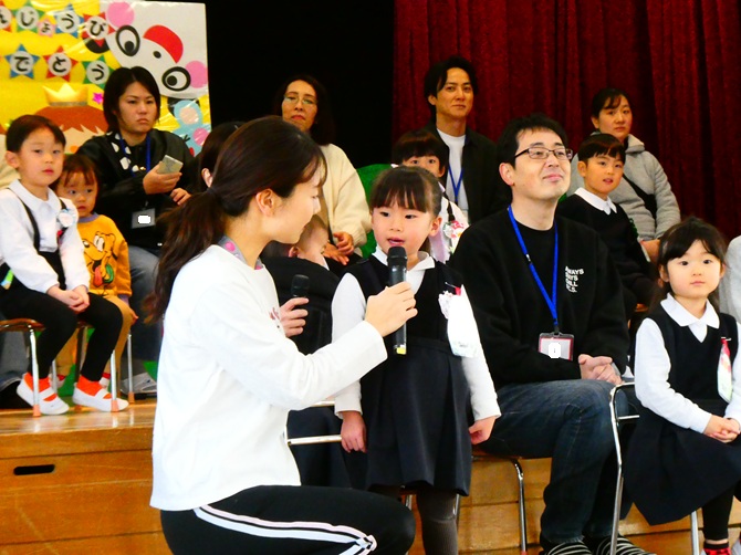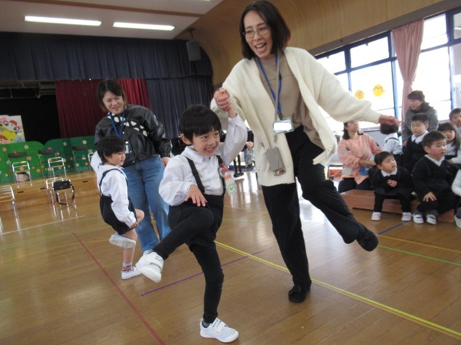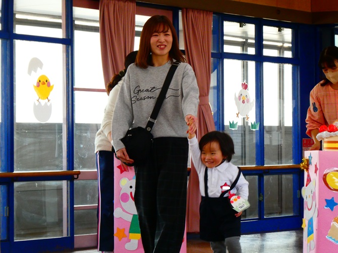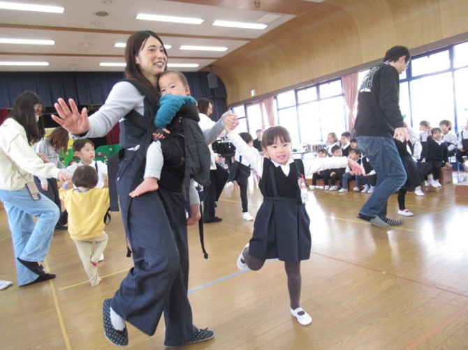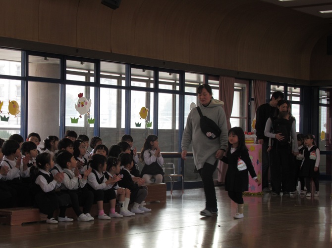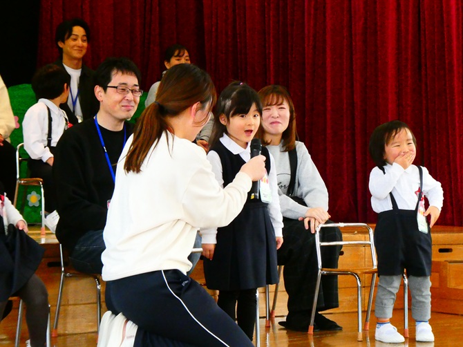 各学年の素敵なお遊戯のプレゼントに、お家の方とふれあい遊びやペープサートを見て、