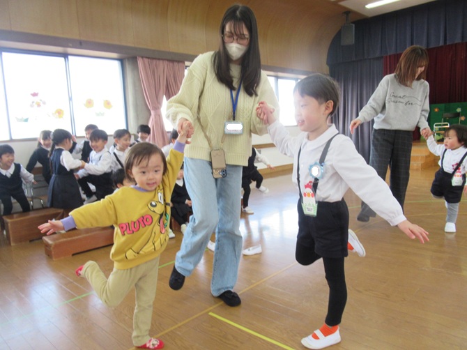 始業日は、ホールに全園児で集まり、「あけましておめでとうございます!」と元気に新年のご挨拶をしました。