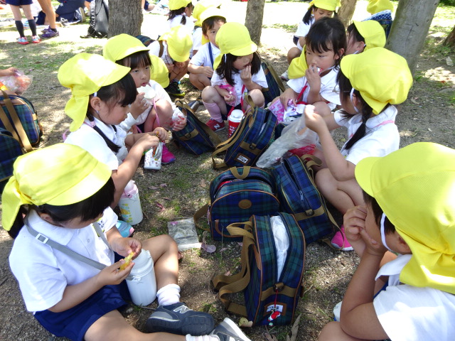 館内を頑張って歩いた後は待ちに待ったお昼の時間。シートを敷いて、おにぎりにおやつ「いっただーきまーす!」