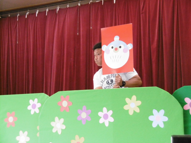 お誕生日会にいつもお祝いに来てくれるケロちゃんとゲームをしたり、副園長乾先生のお話「しらゆきひめ」を見たりと、楽しいお誕生日会でした。