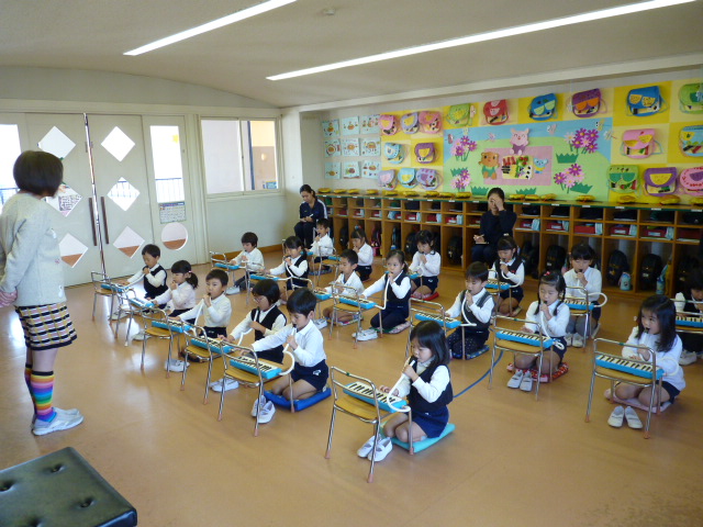 年長あお組ではピアノの音を聞いて音階をあてる「音あて遊び」や鍵盤ハーモニカで「メリーさんのひつじ」の練習をしました。鼓隊の練習をみていただいたり、色々な歌を聞いていただきました。