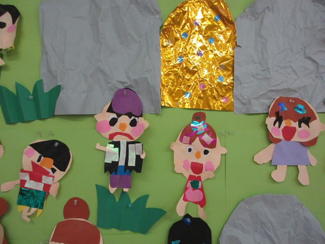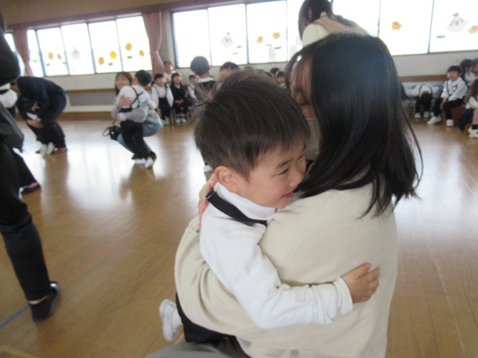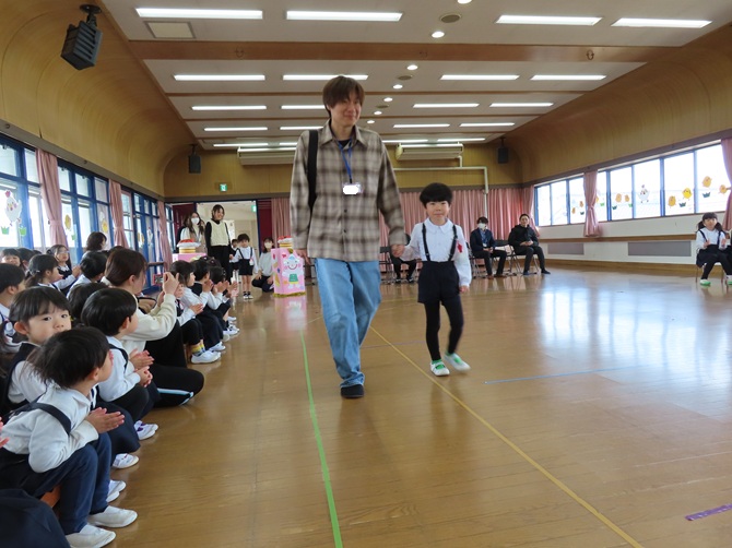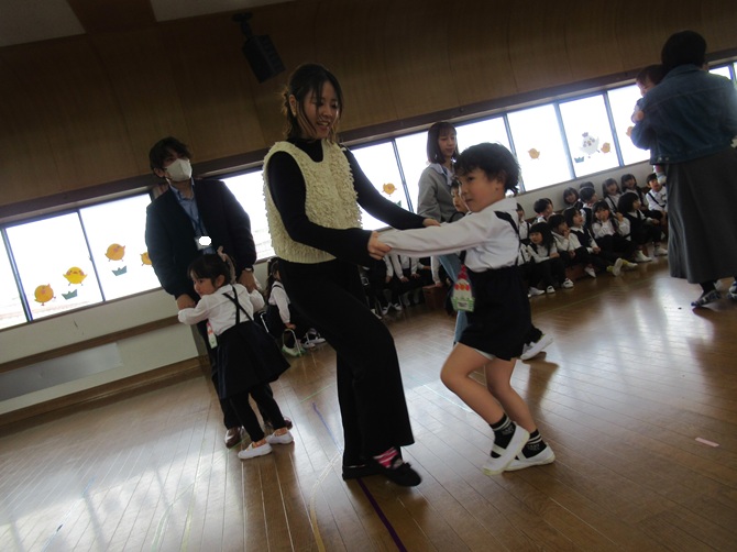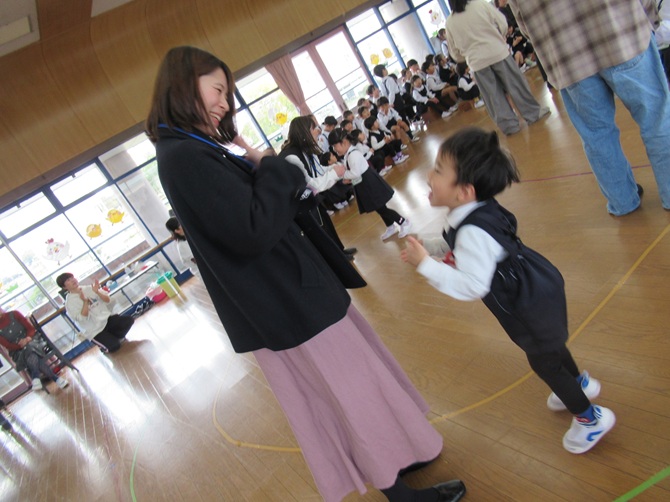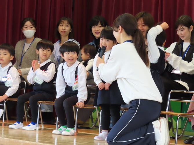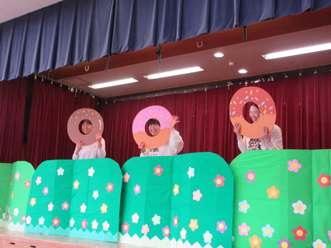 各学年の素敵なお遊戯のプレゼントに、お家の方とふれ合い遊びやペープサートを見て