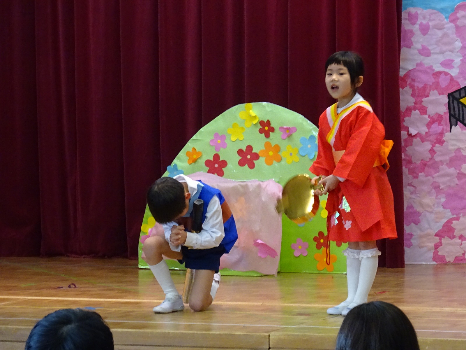 副園長、乾恵子先生からのお話しのプレゼントは『さるかにものがたり』で、さるくんがカニさんに柿を投げつけるシーンでは「あ~」とカニさんを同情する声が子どもたちから漏れていました。