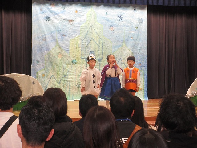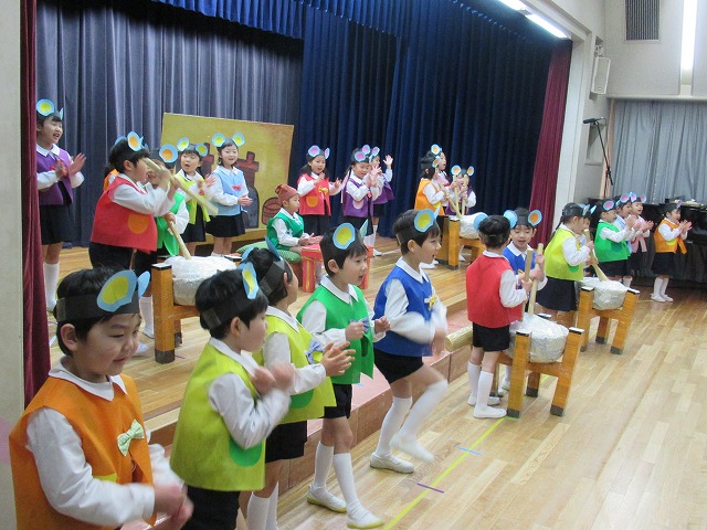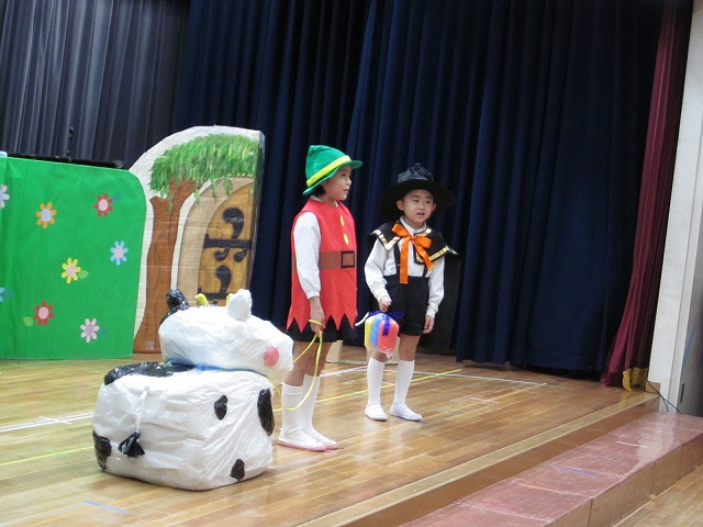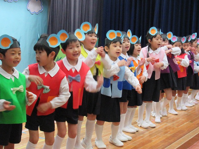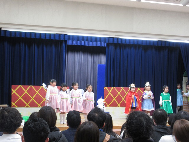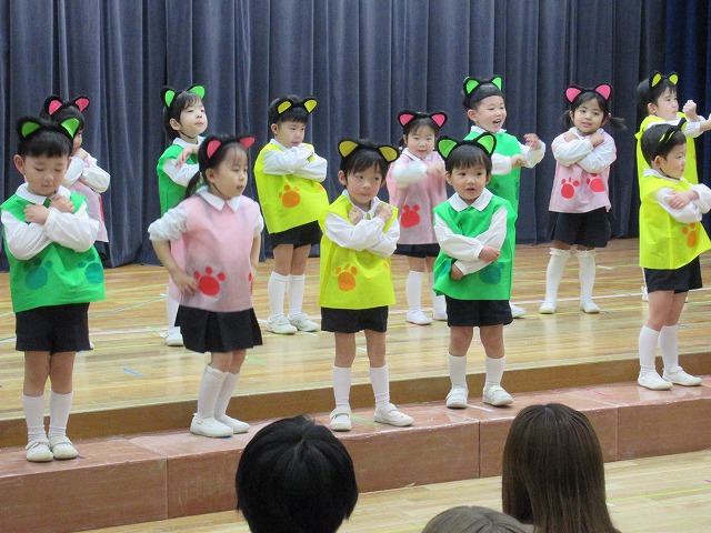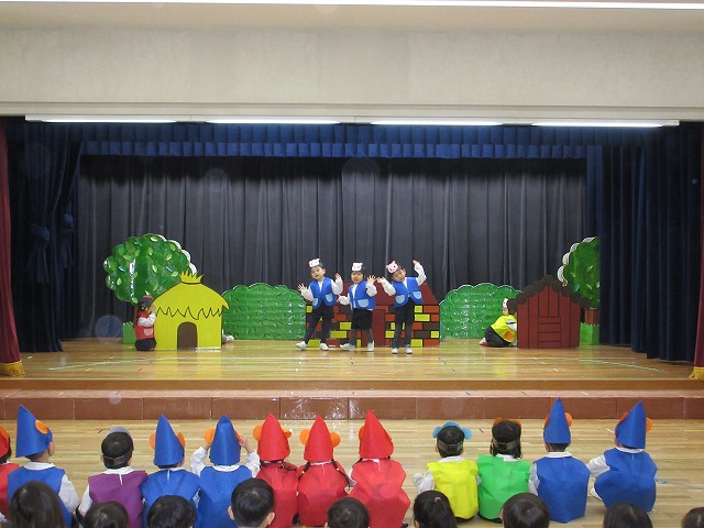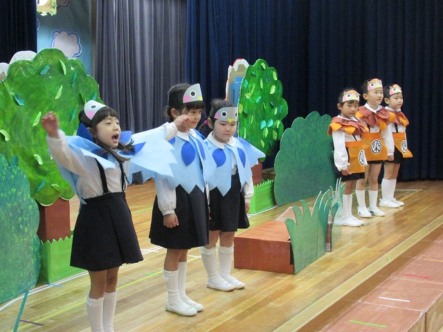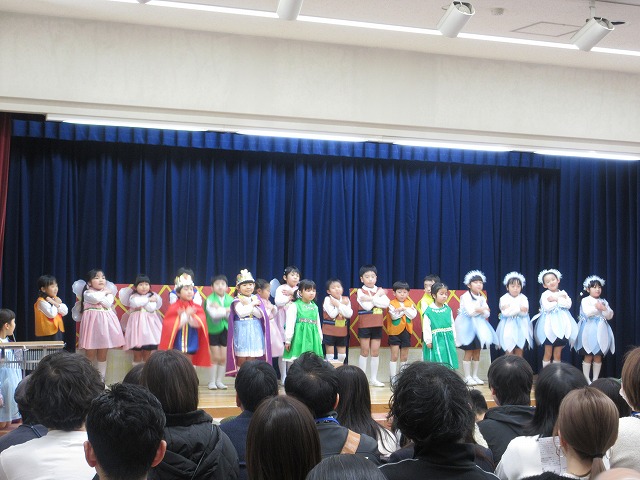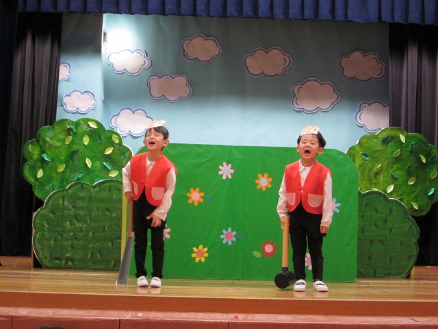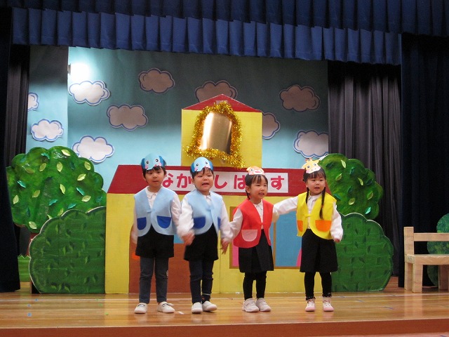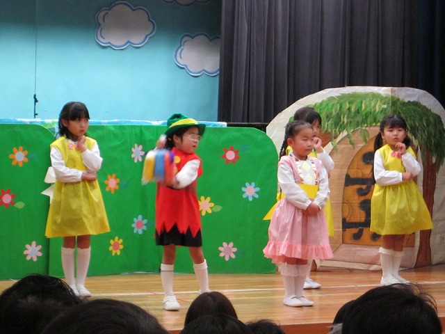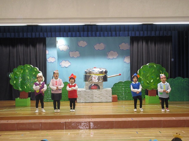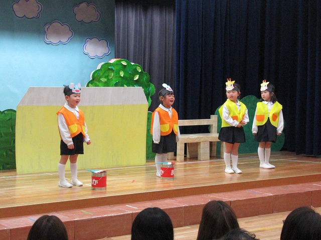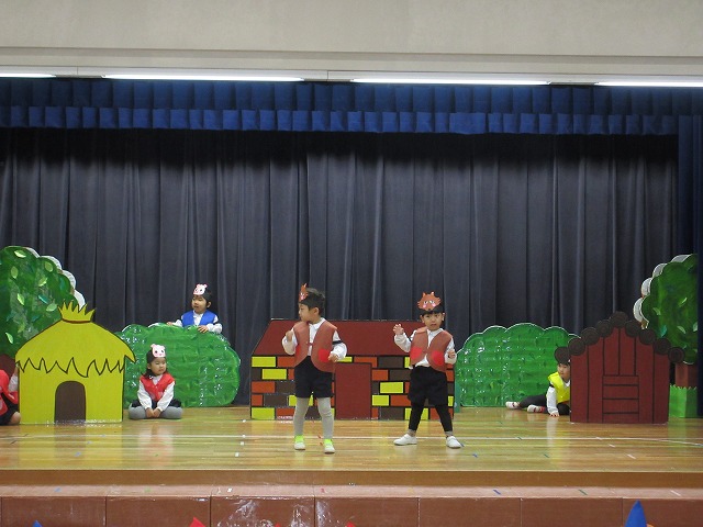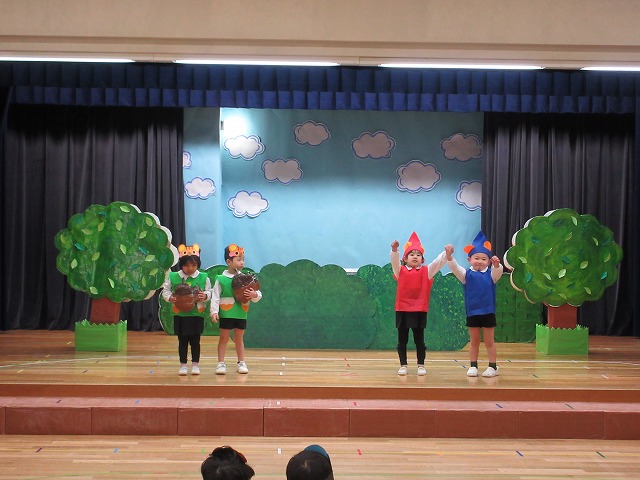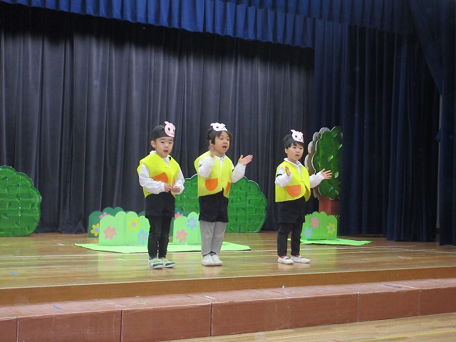 大勢のお客さんにちょっぴりドキドキしながらもおともだちと一緒に劇やおゆうぎ、歌など頑張りました。