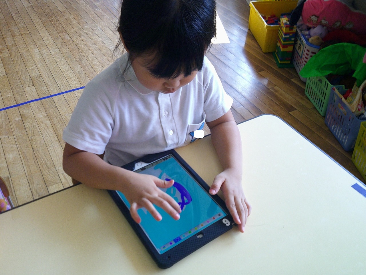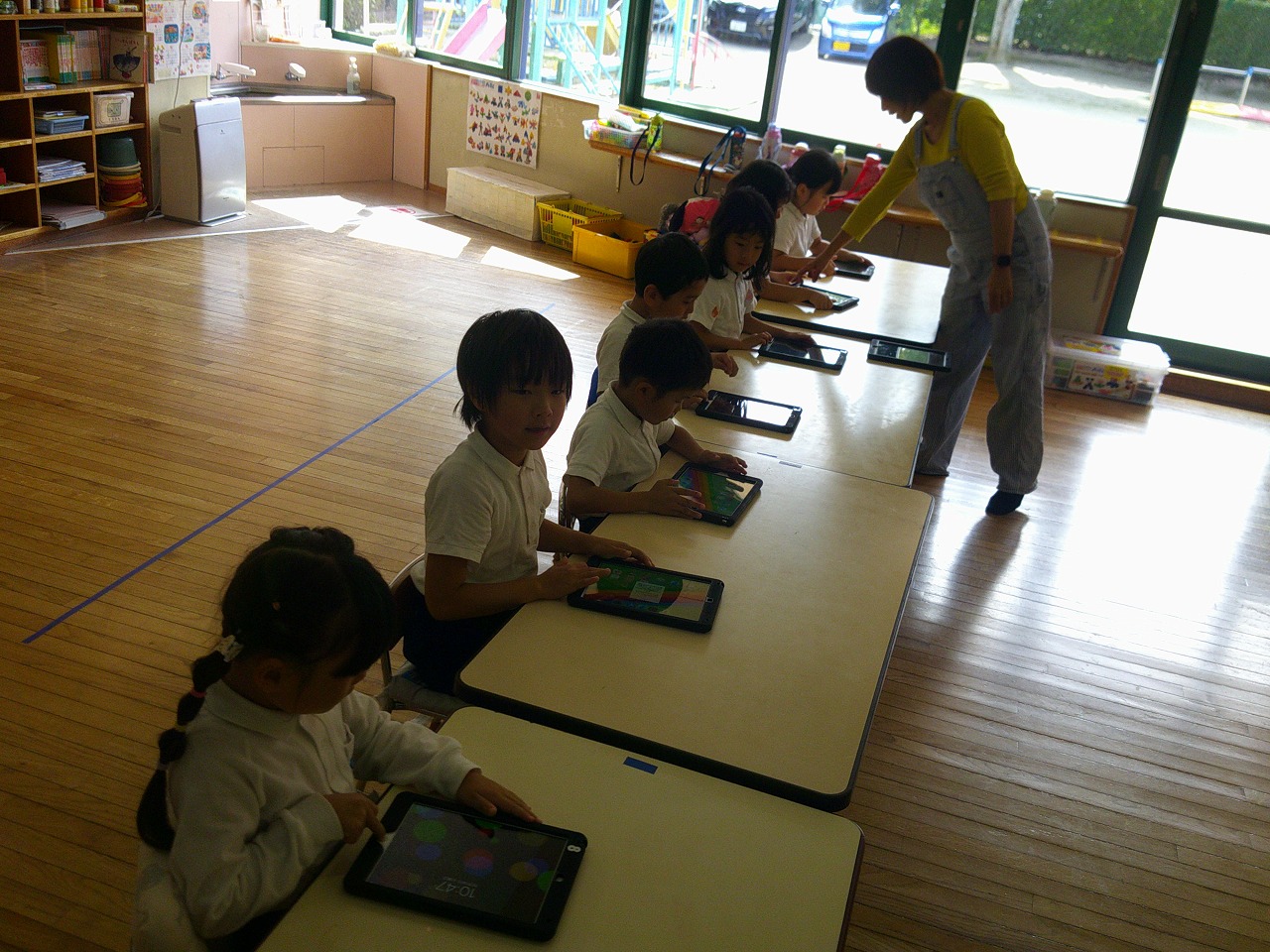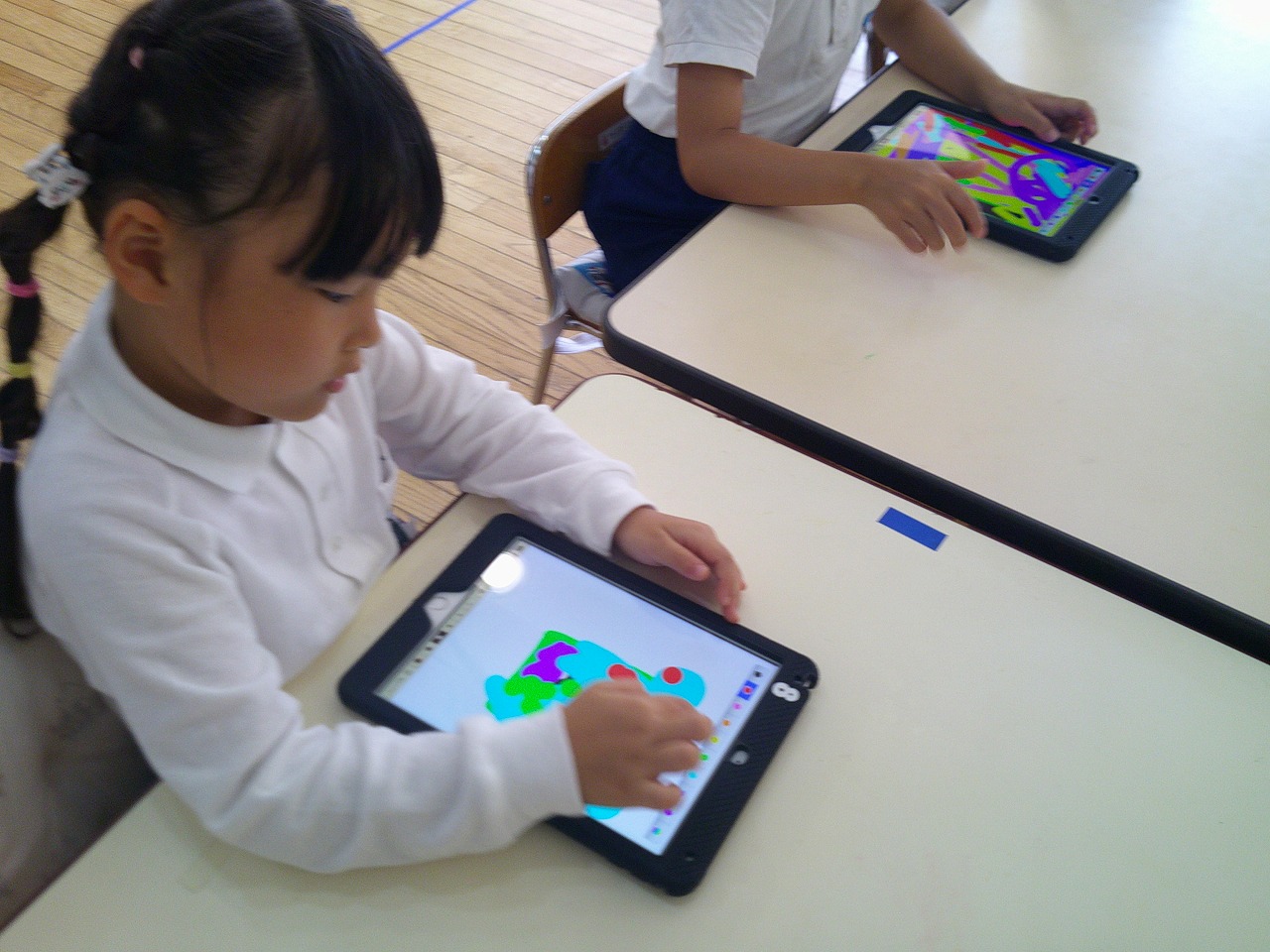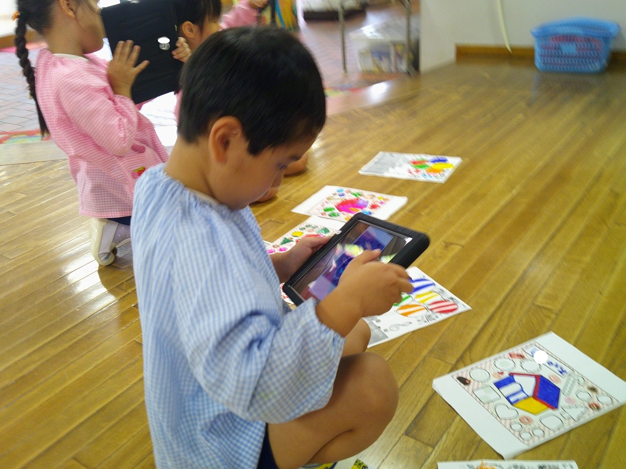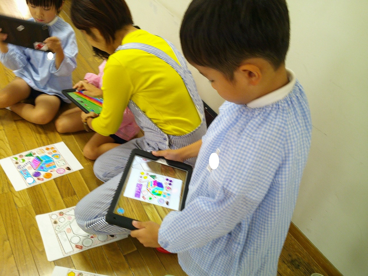 はじめはiPadを使いません。カラフルなマジックペンを準備してお絵かきを楽しみました。7つのふうせんとお菓子の家の塗り絵をしました。机の上を汚さないよう紙をひいたりスモックに着替えたり自分たちで準備をして制作をはじめました。1色だけでなく、色を重ねて混ぜたり柄をつけたり、塗り残しをうまく利用してパターンをつくったり様々な工夫が見られました。いろんな顔を描いたり、お友だちと見せ合いながら楽しい雰囲気で色がどんどん塗られていきます。