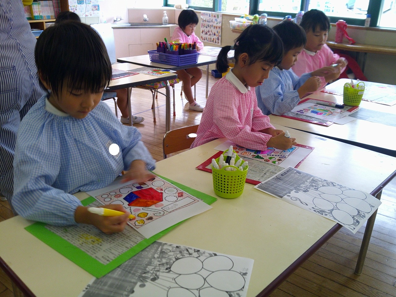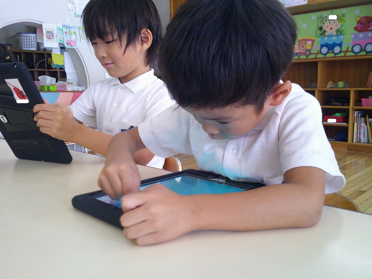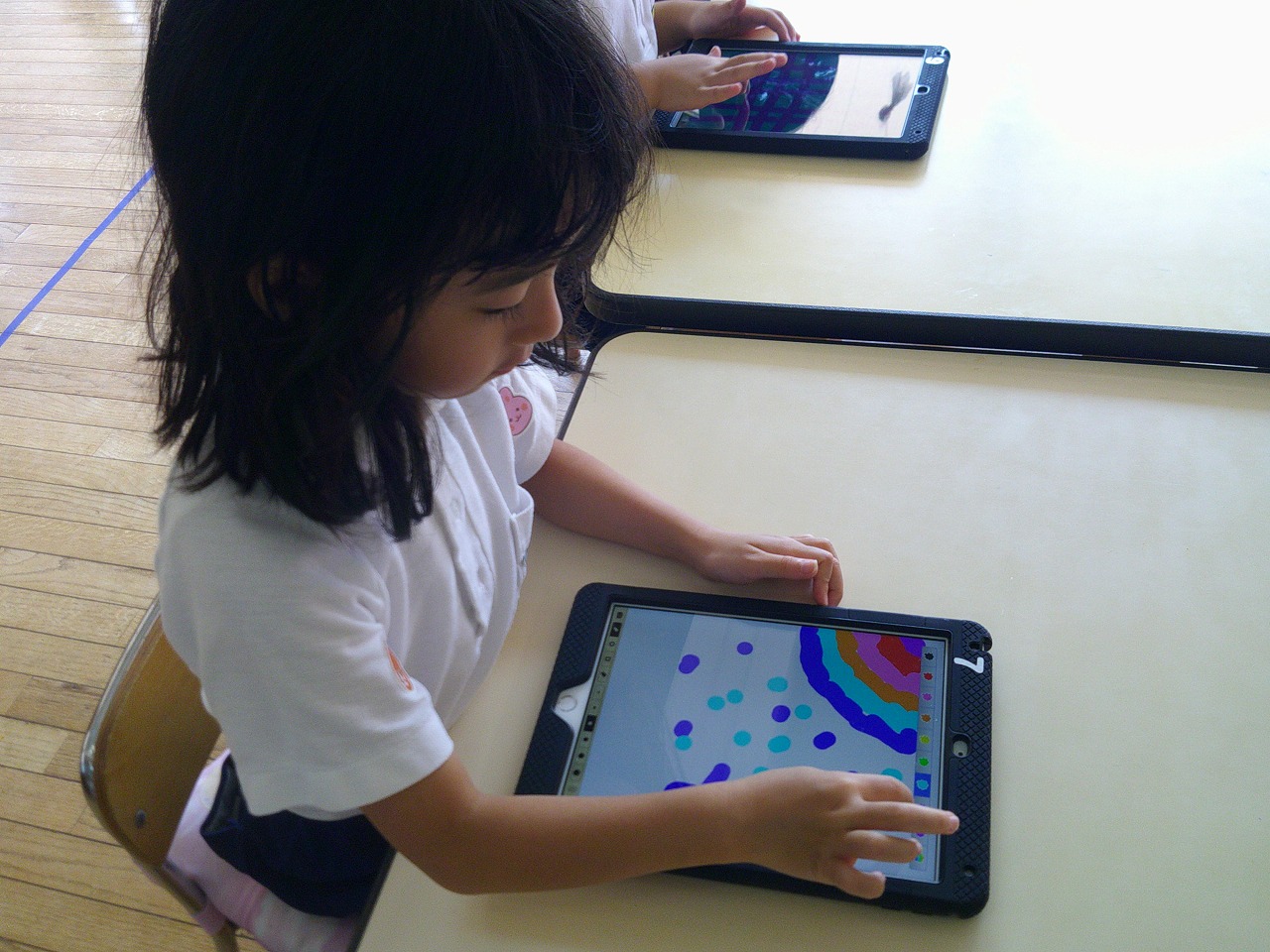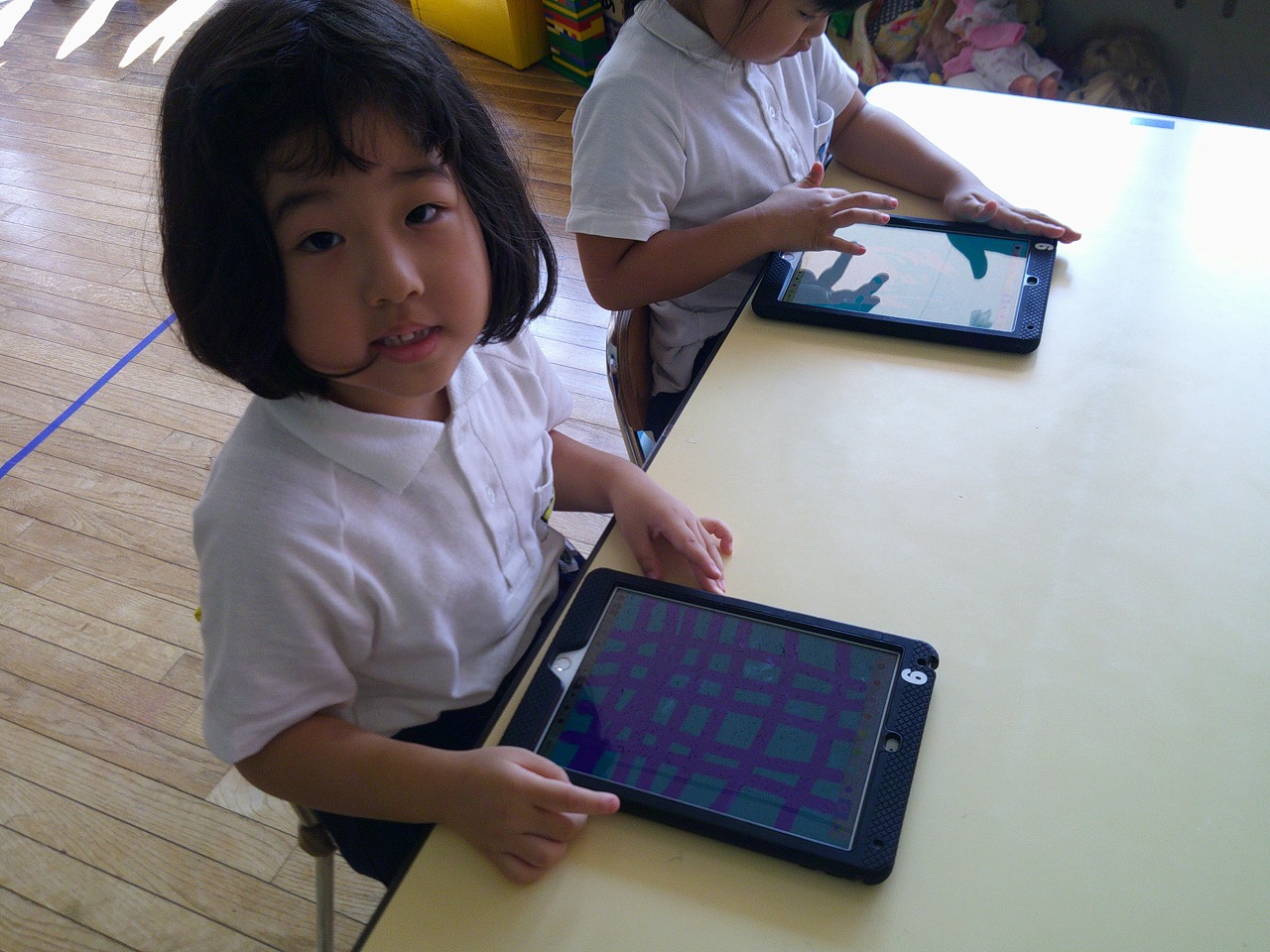 はじめはiPadを使いません。カラフルなマジックペンを準備してお絵かきを楽しみました。7つのふうせんとお菓子の家の塗り絵をしました。机の上を汚さないよう紙をひいたりスモックに着替えたり自分たちで準備をして制作をはじめました。1色だけでなく、色を重ねて混ぜたり柄をつけたり、塗り残しをうまく利用してパターンをつくったり様々な工夫が見られました。いろんな顔を描いたり、お友だちと見せ合いながら楽しい雰囲気で色がどんどん塗られていきます。
