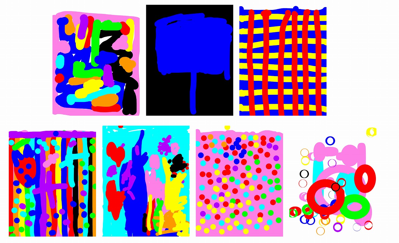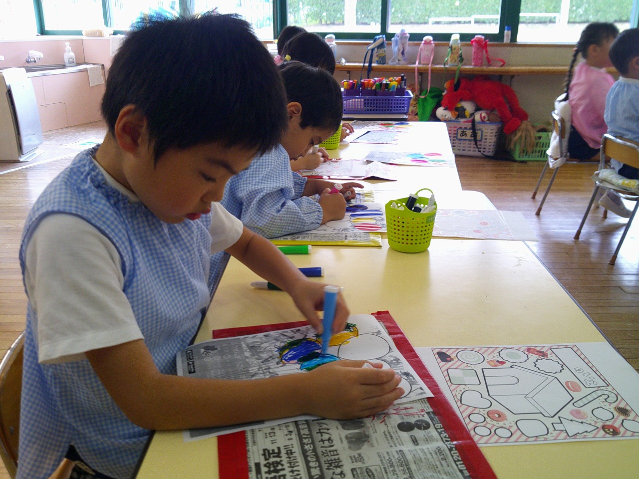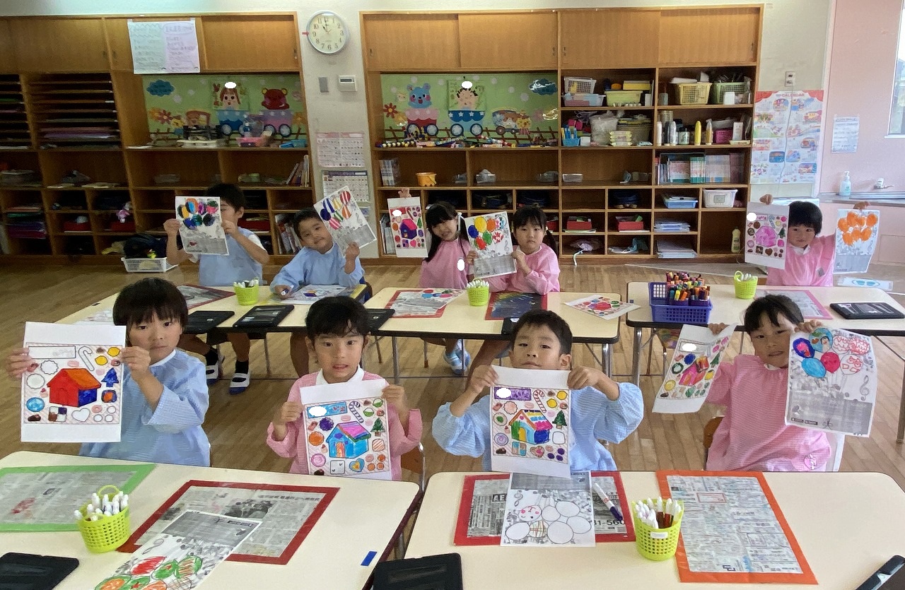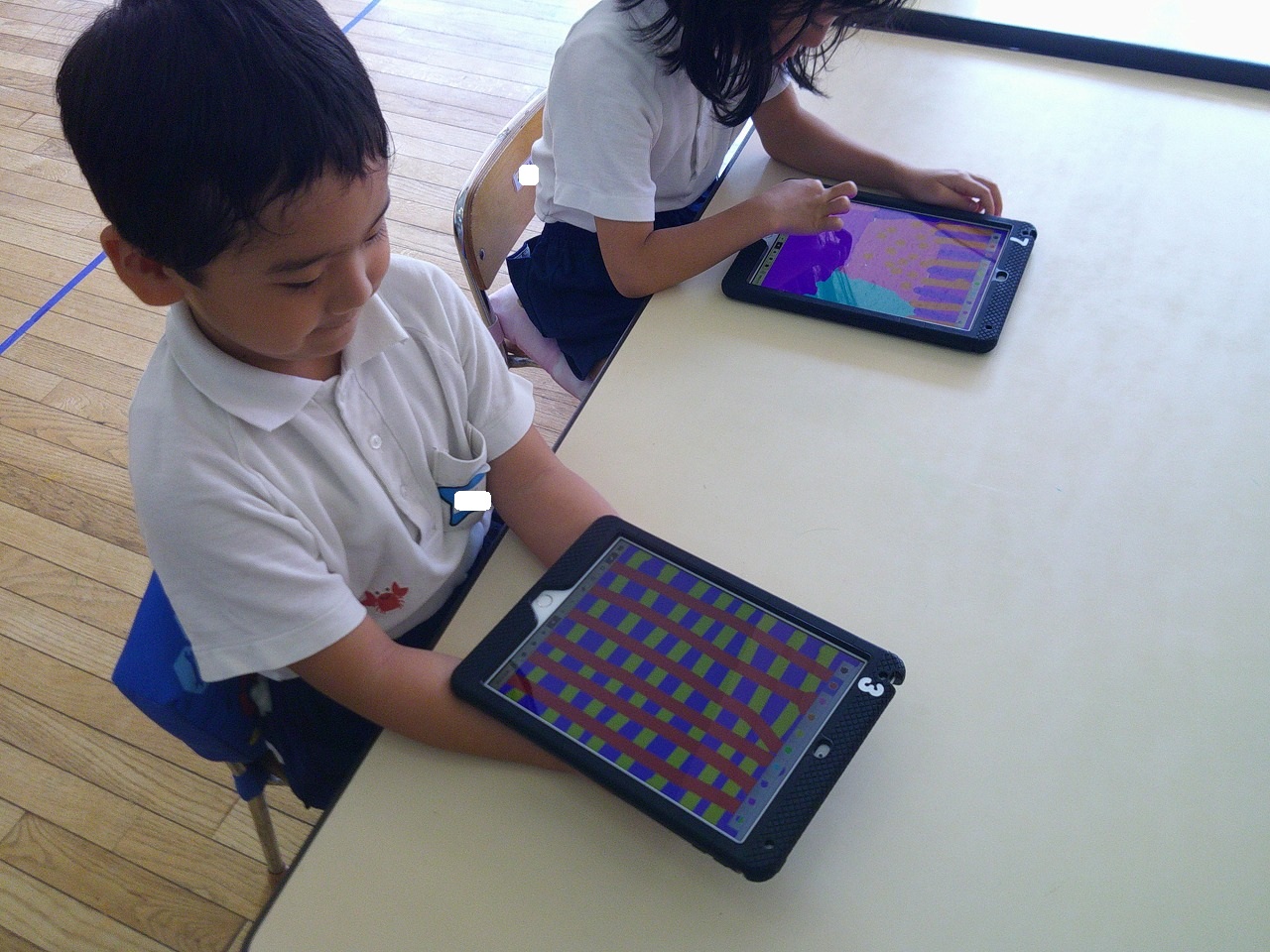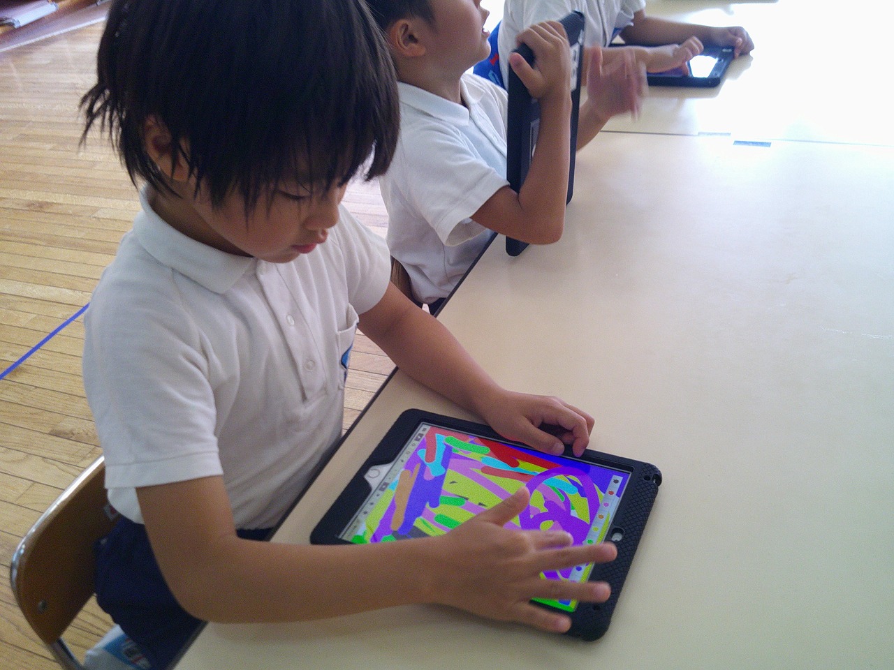 はじめはiPadを使いません。カラフルなマジックペンを準備してお絵かきを楽しみました。7つのふうせんとお菓子の家の塗り絵をしました。机の上を汚さないよう紙をひいたりスモックに着替えたり自分たちで準備をして制作をはじめました。1色だけでなく、色を重ねて混ぜたり柄をつけたり、塗り残しをうまく利用してパターンをつくったり様々な工夫が見られました。いろんな顔を描いたり、お友だちと見せ合いながら楽しい雰囲気で色がどんどん塗られていきます。