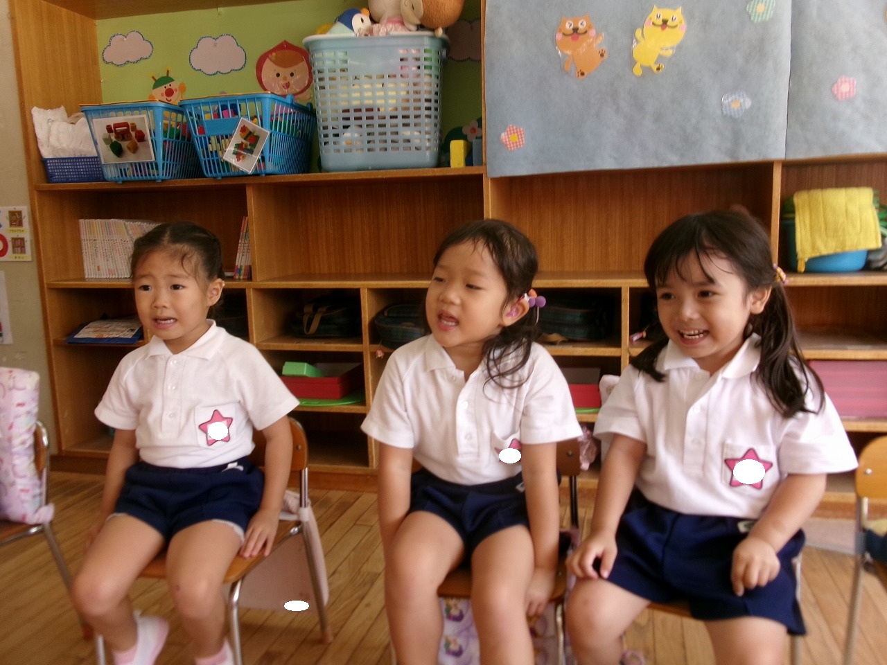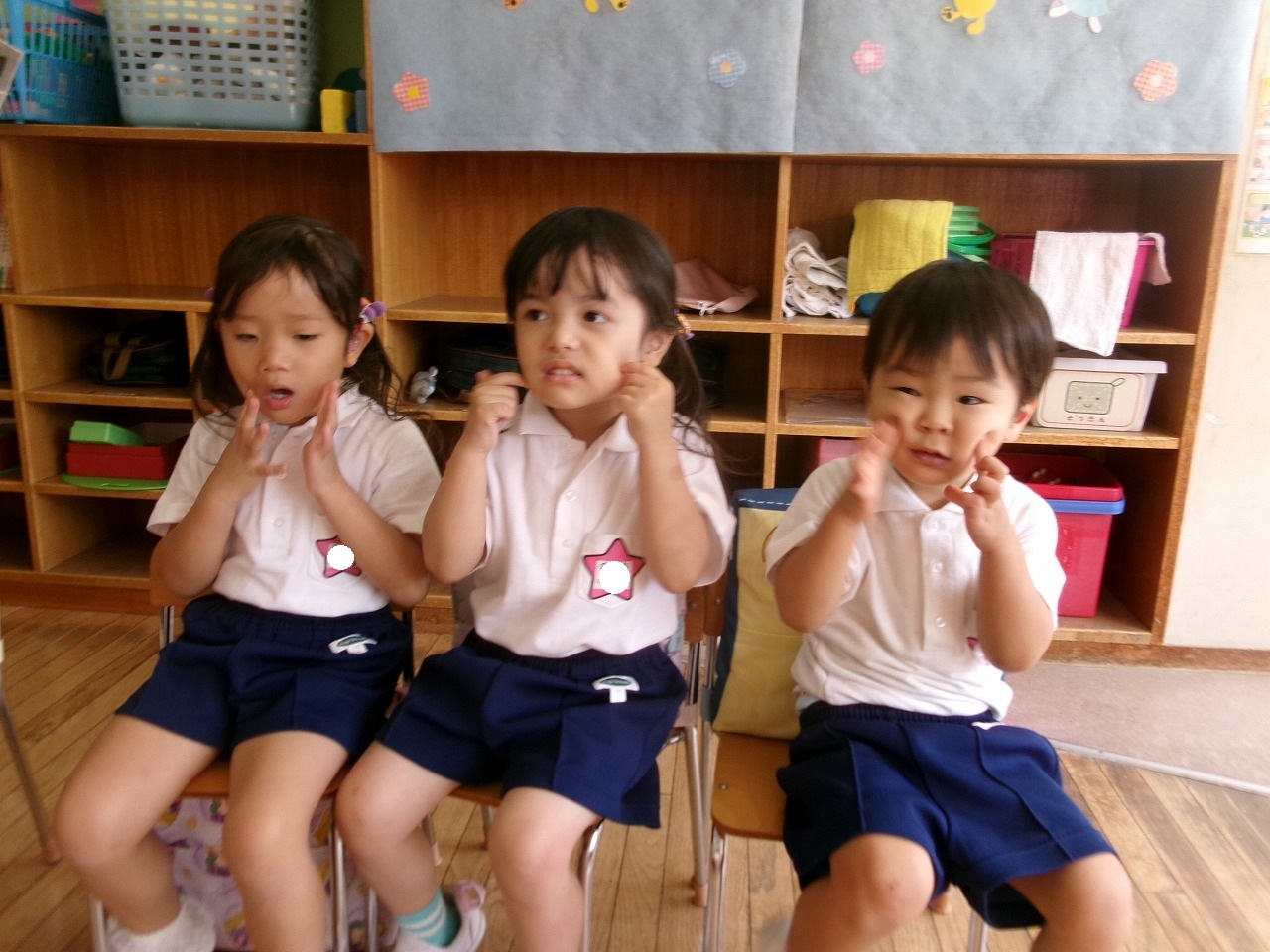 「ほっぺたクルクルマッサージをしましょうね。くるくるー」の声に合わせてほっぺを柔らかくした後、たくさんほっぺに空気をためて大きく息を吐きだして、お歌を元気に歌う準備もしました。それから「あらどこだ?」のお歌を元気に歌いました。