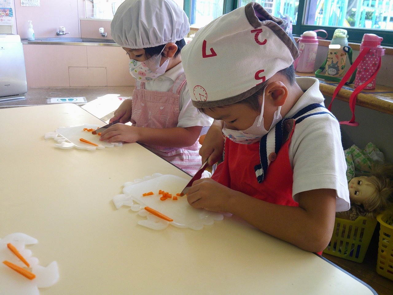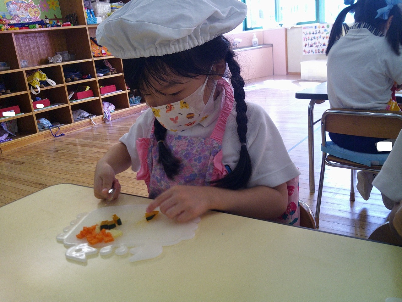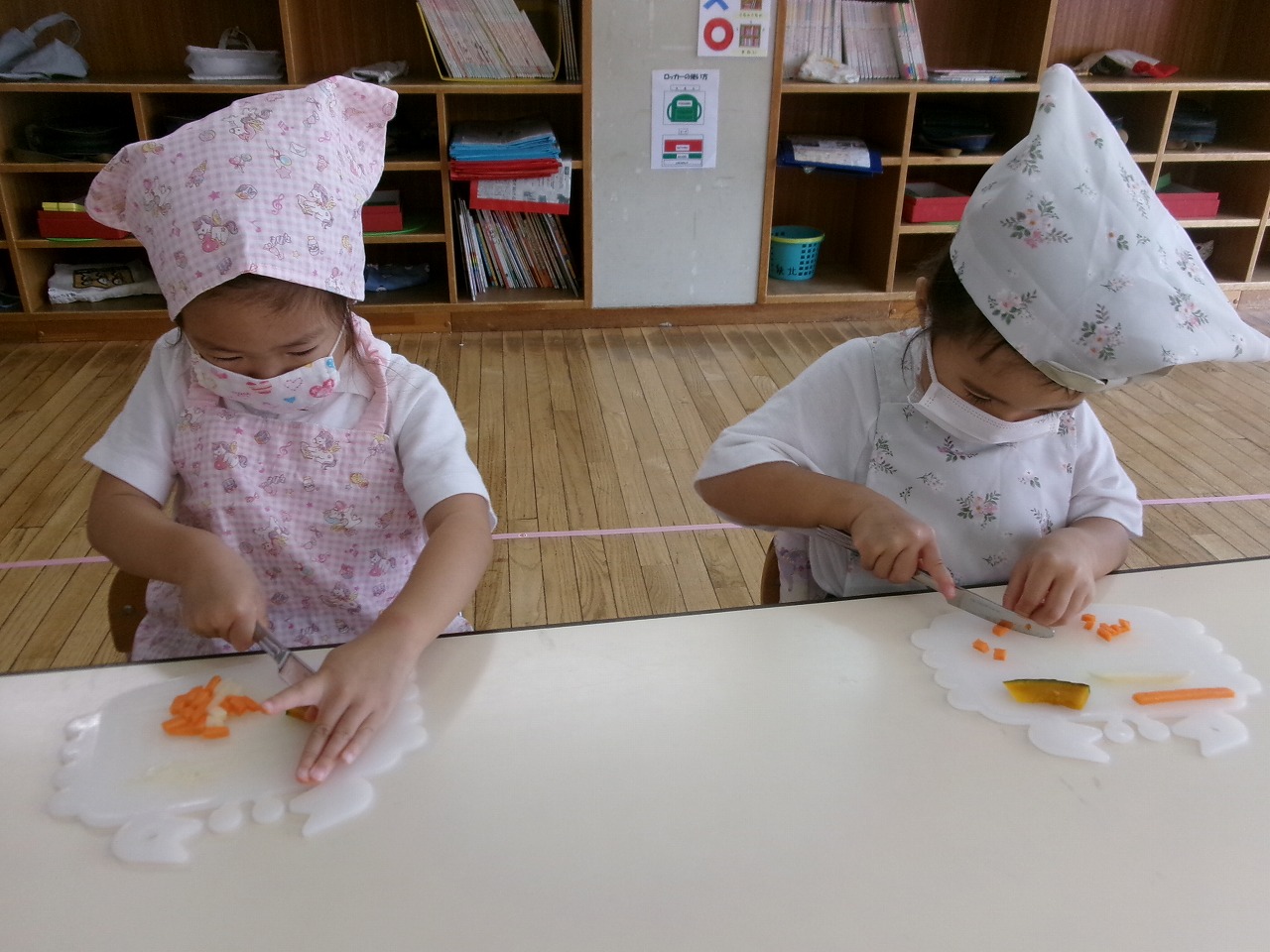 「この大きさだったら食べやすいね!」とトントン野菜を切って「おいしくな~れ」とおまじないもかけながら楽しくクッキングをしていました。