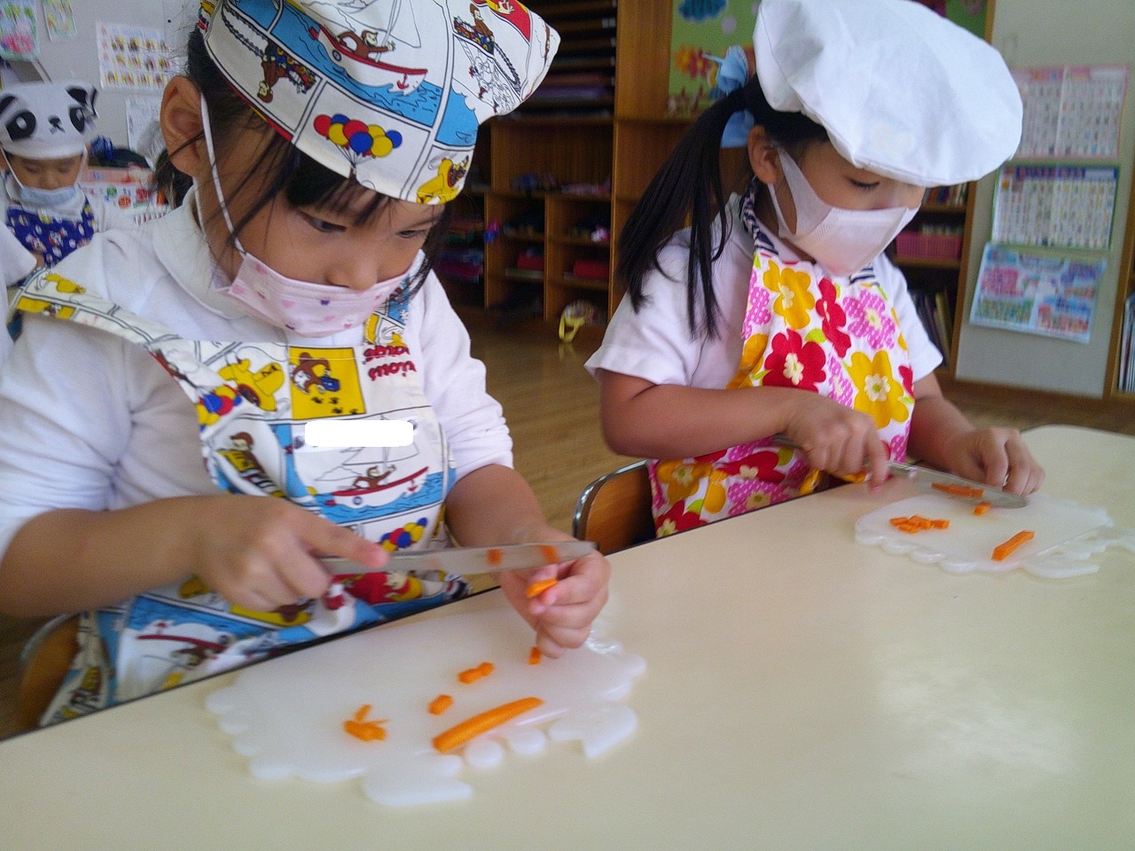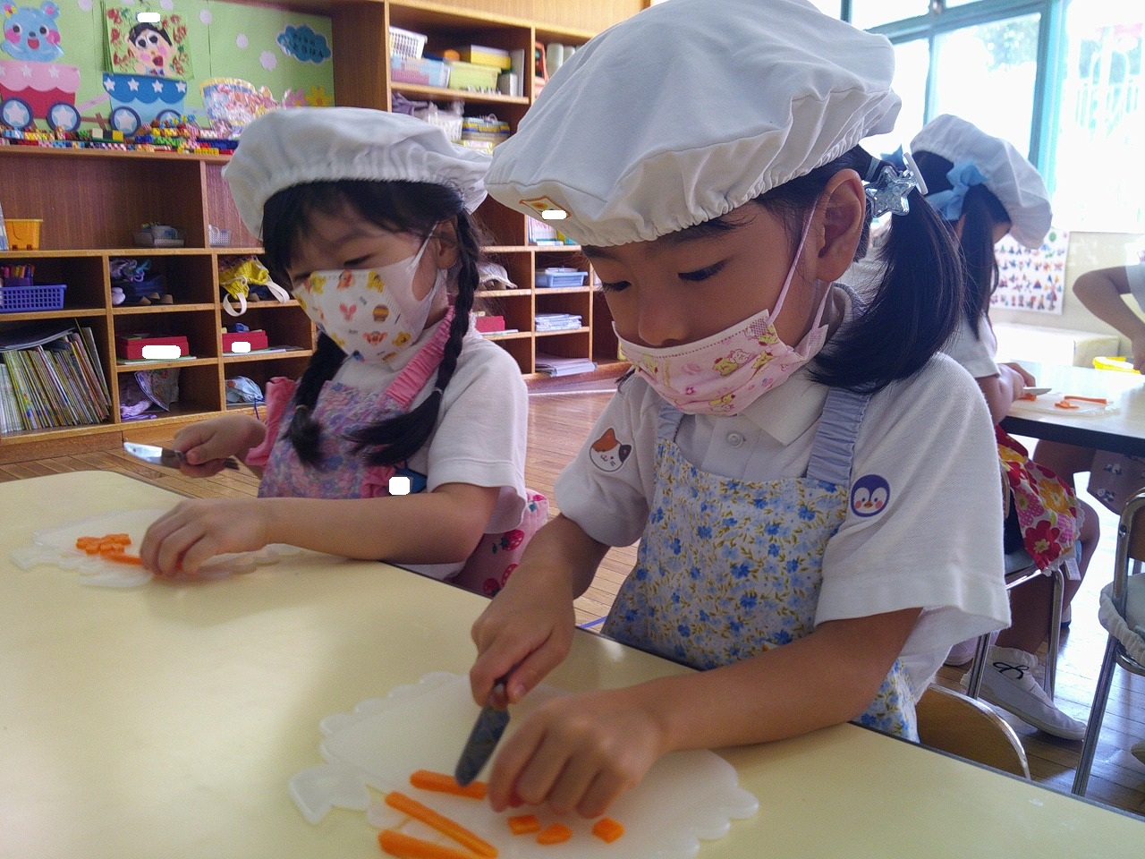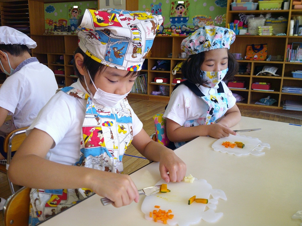「この大きさだったら食べやすいね!」とトントン野菜を切って「おいしくな~れ」とおまじないもかけながら楽しくクッキングをしていました。