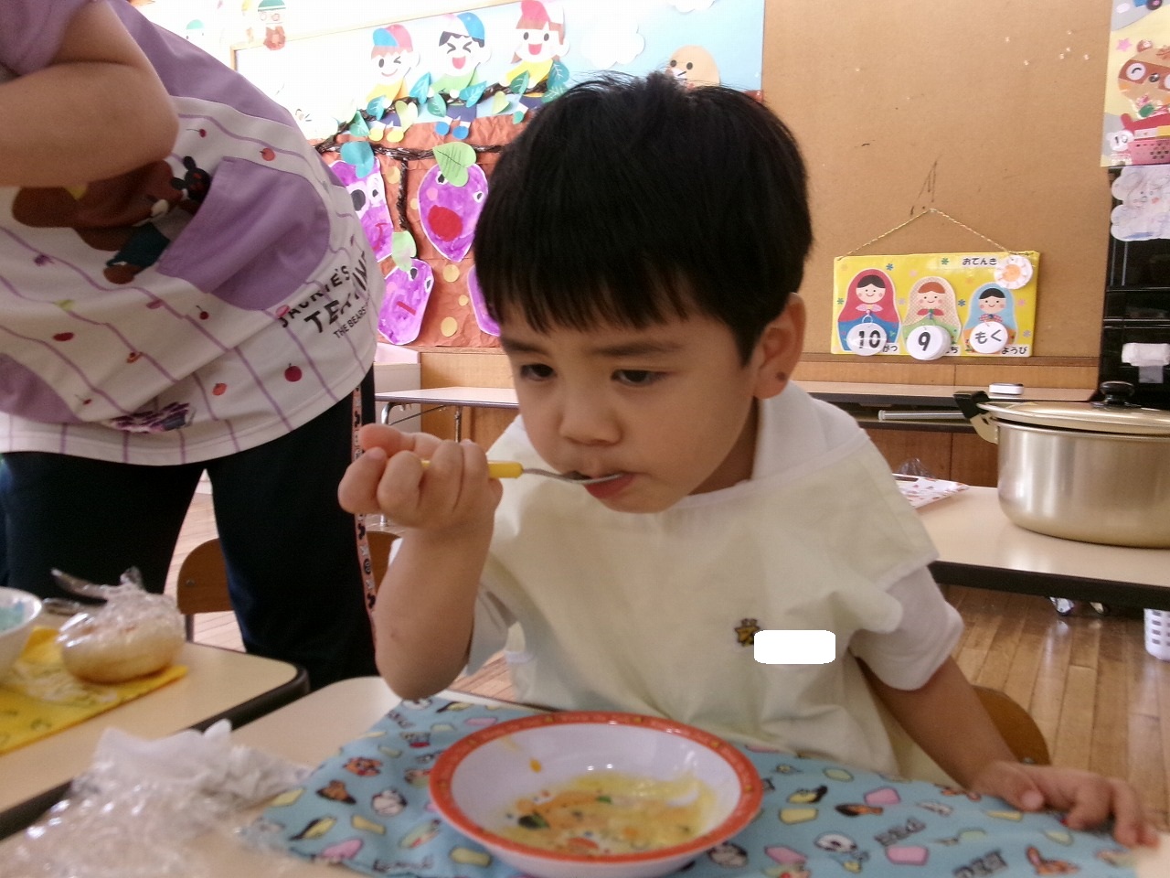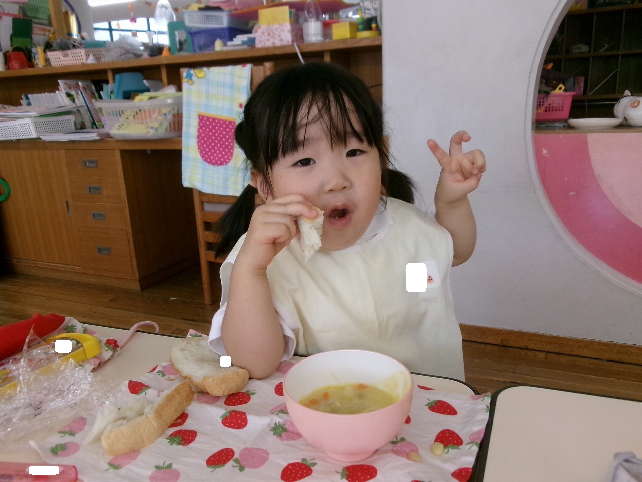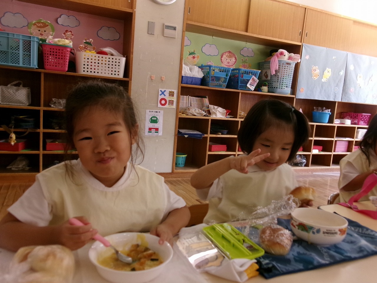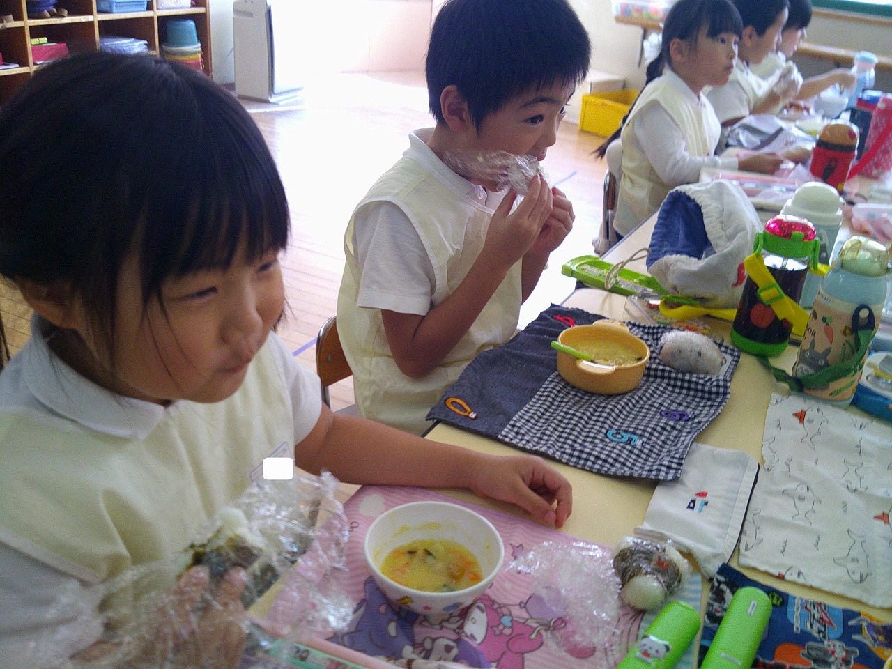 「おいし~!!」と具沢山なシチューを美味しく食べ、お家から持ってきたパンやおにぎりもにこにこで嬉しそうに食べている子ども達でした。
