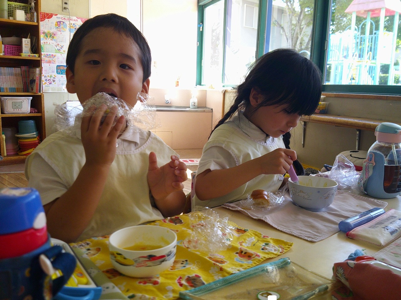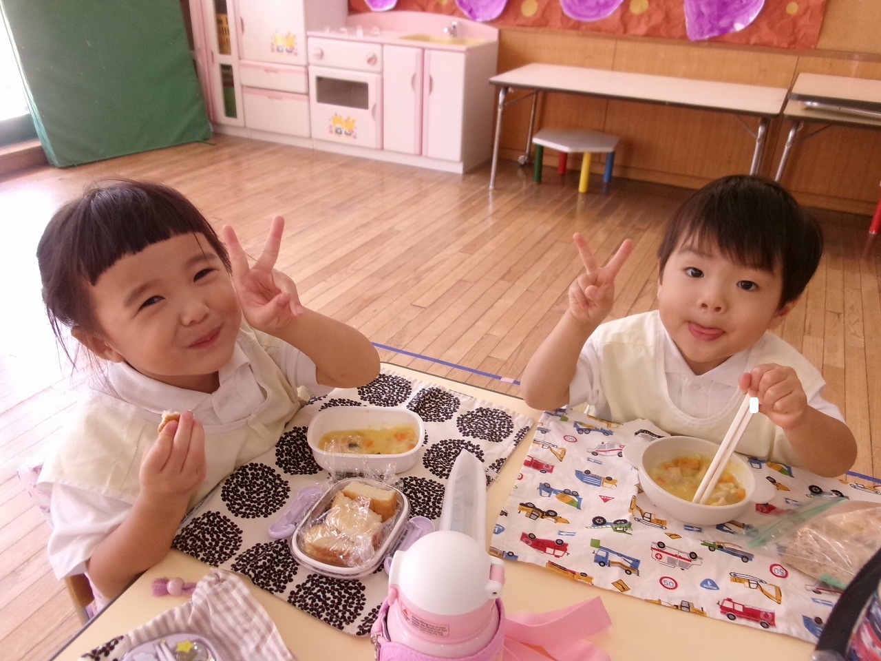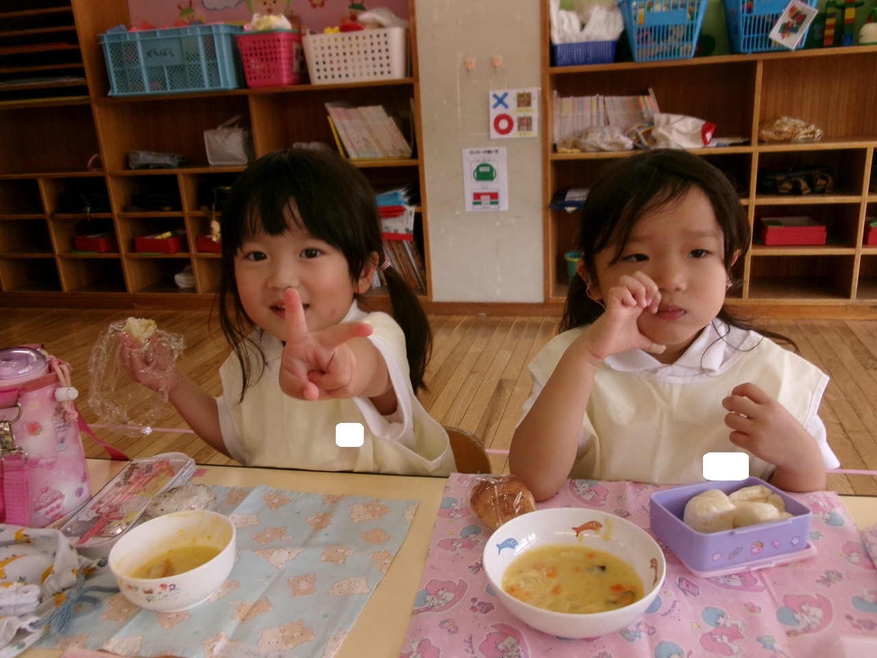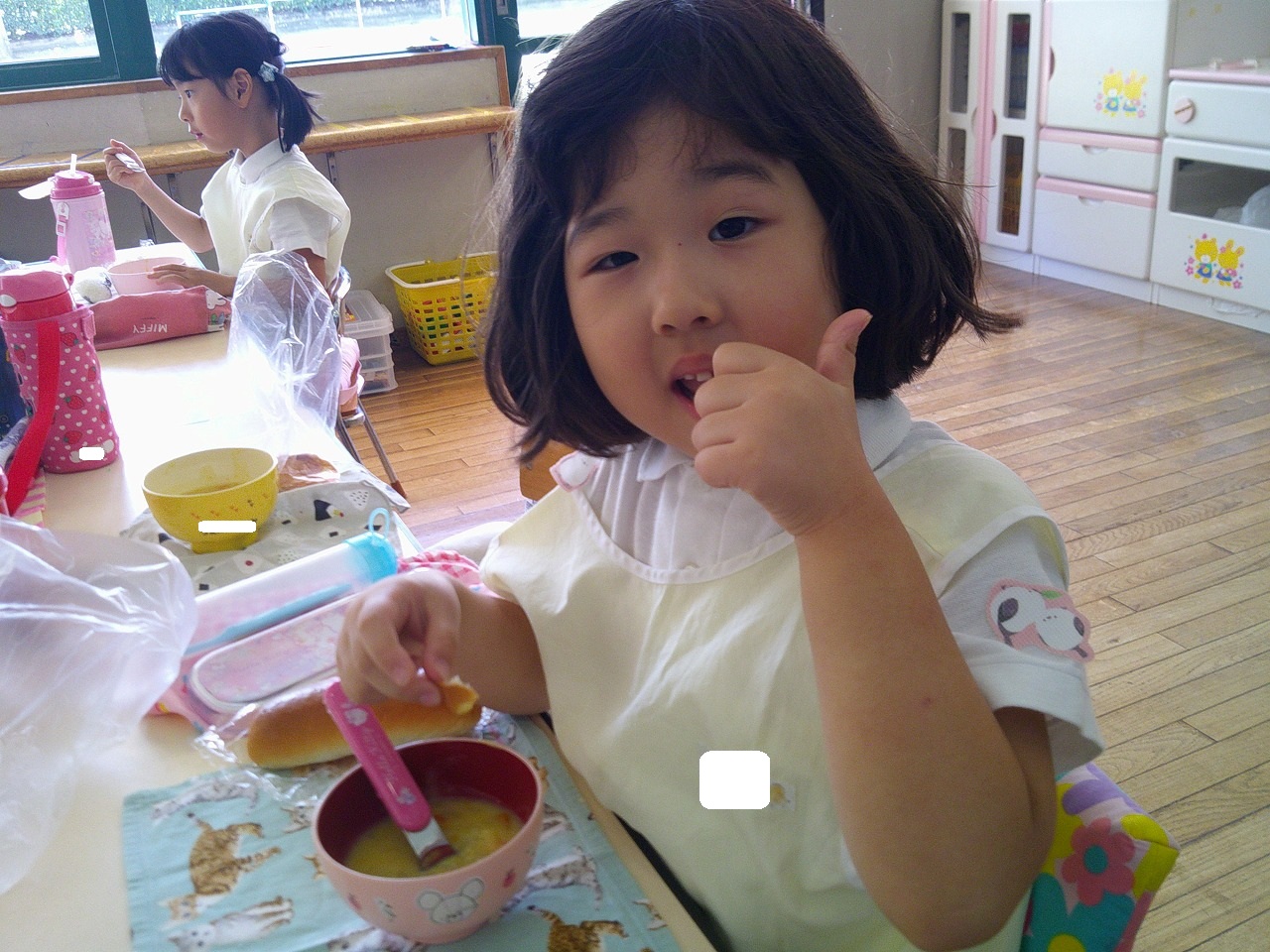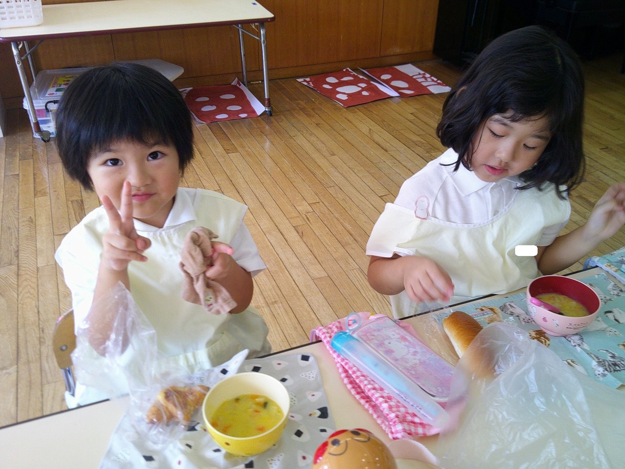 「おいし~!!」と具沢山なシチューを美味しく食べ、お家から持ってきたパンやおにぎりもにこにこで嬉しそうに食べている子ども達でした。