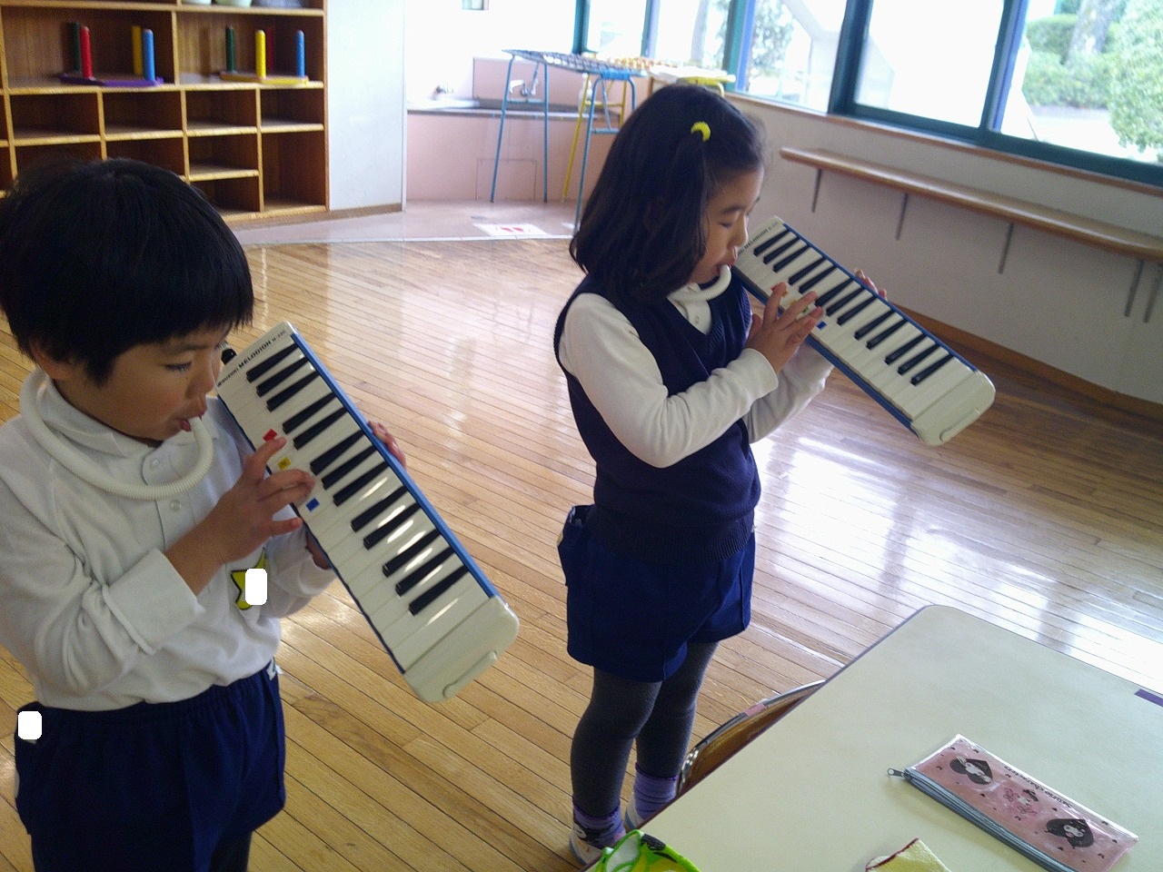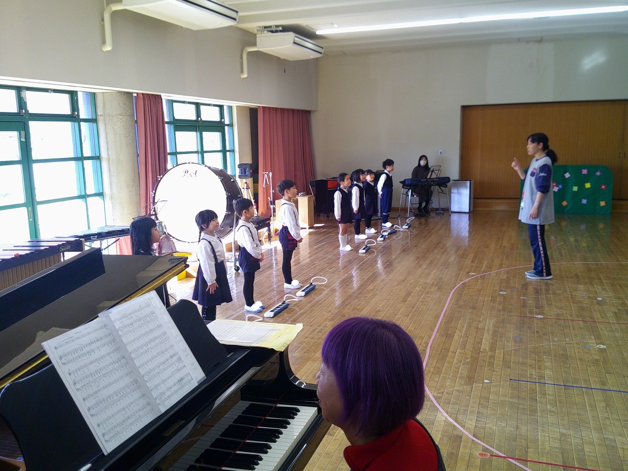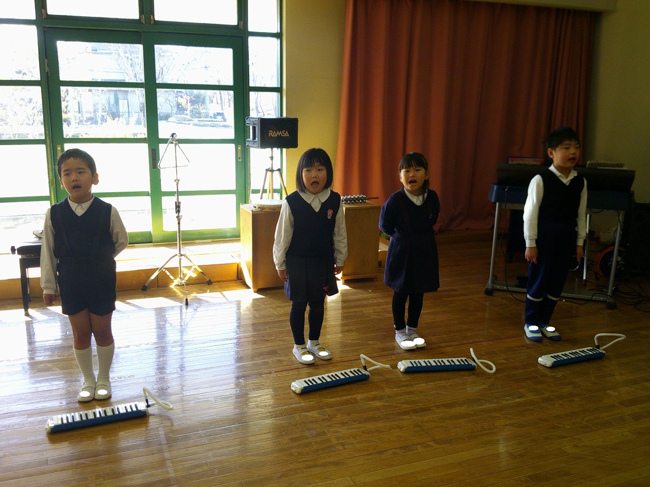 年中は鍵盤ハーモニカで「キラキラ星」の演奏や,、楽器でいろんなリズムを曲に合わせて演奏しています。