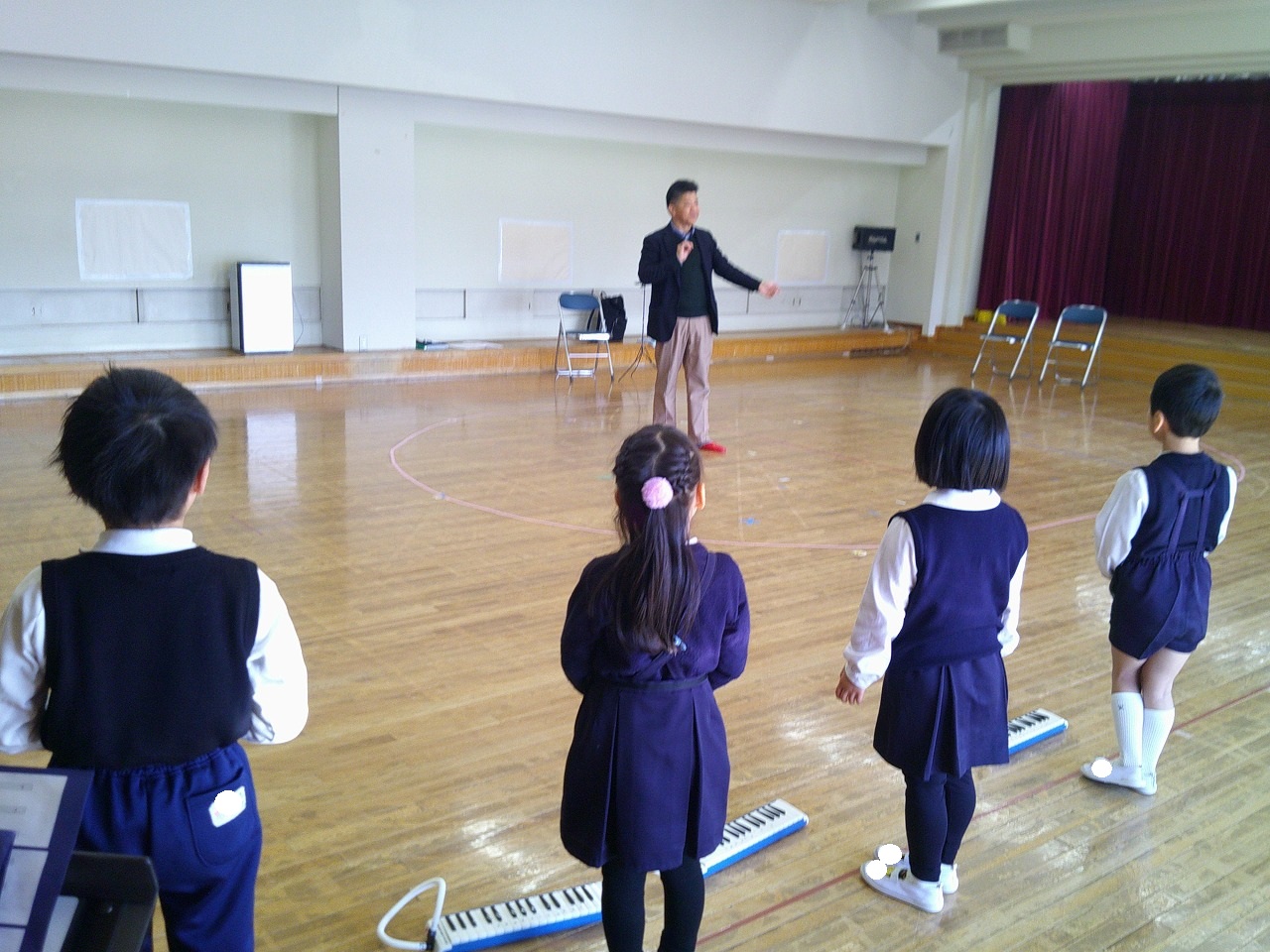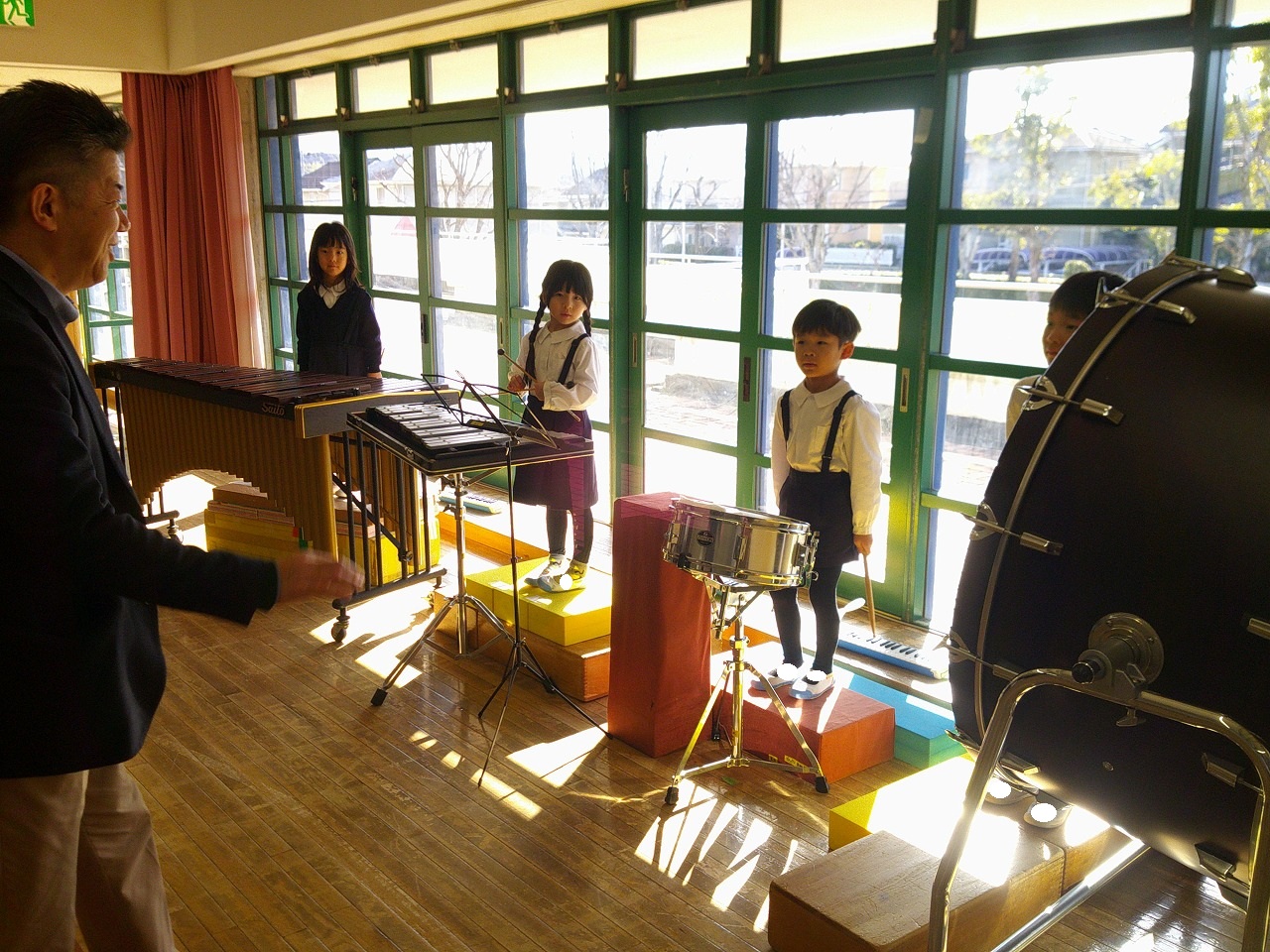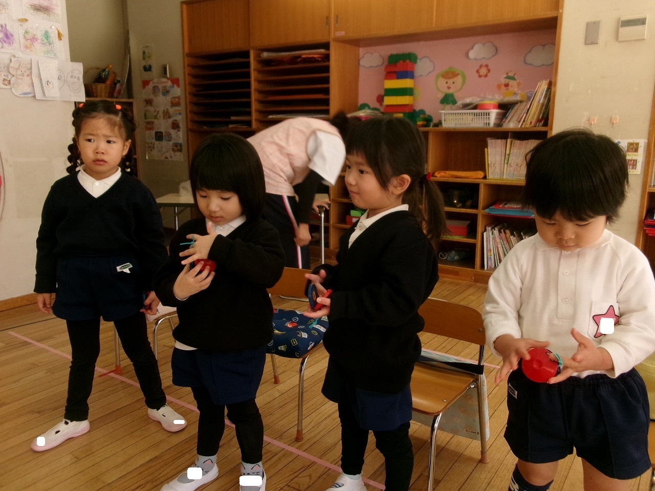 年中は鍵盤ハーモニカで「キラキラ星」の演奏や,、楽器でいろんなリズムを曲に合わせて演奏しています。