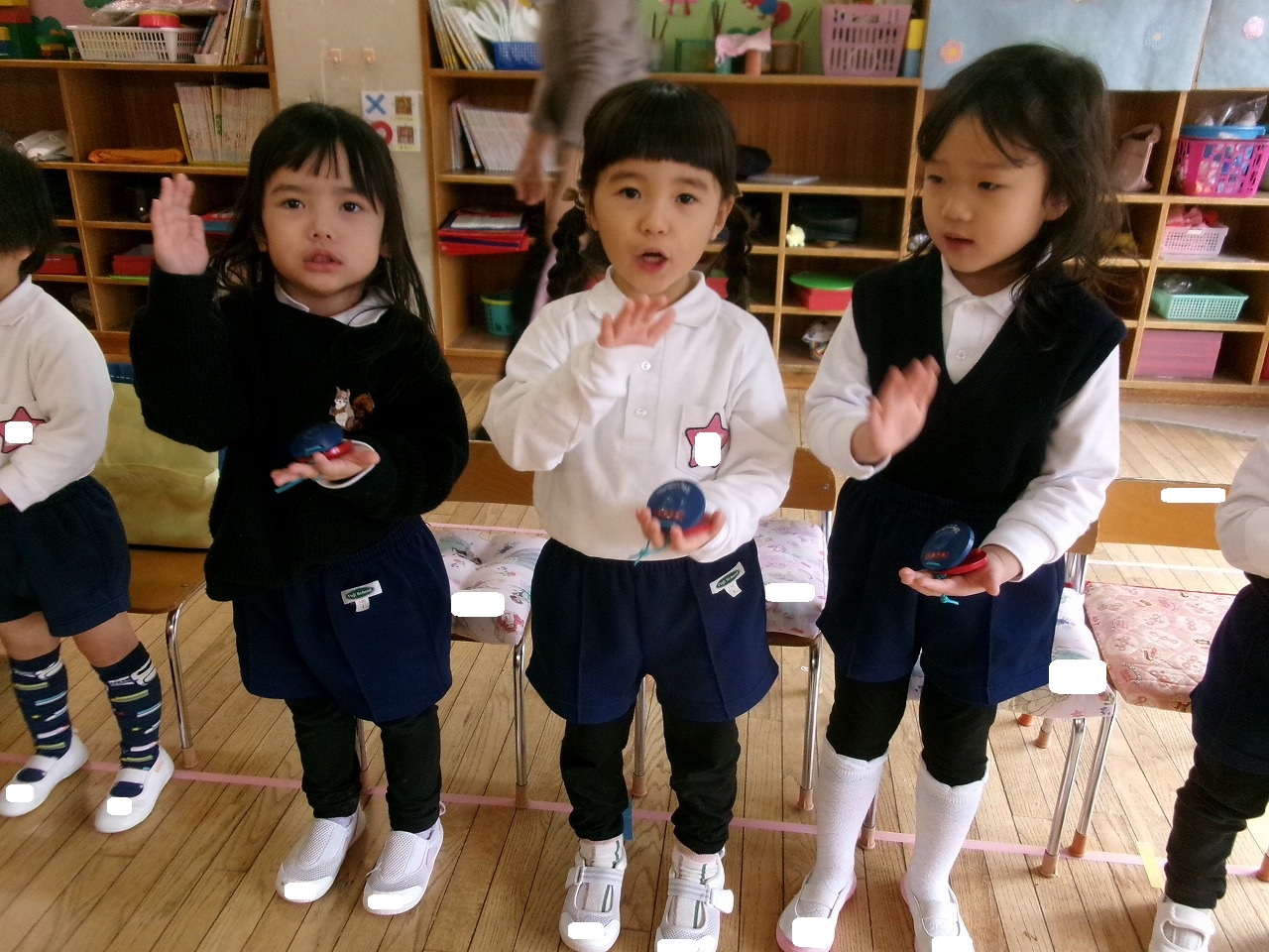 年少もひとりひとり歌を歌ったり、カスタネットや鈴などの楽器の演奏にも取り組んでいます。