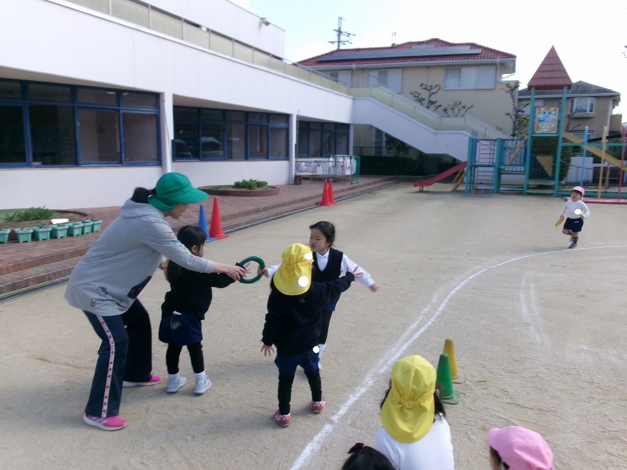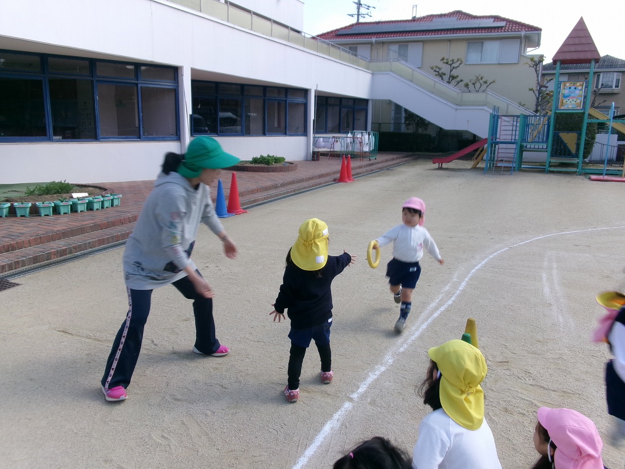 ぽかぽかとお日様の日差しが気持ちよく、お外遊びも楽しく満喫できた今週、あやめぐみももぐみで一緒にリレーをしたり、体操をしたり、元気いっぱい遊びました。