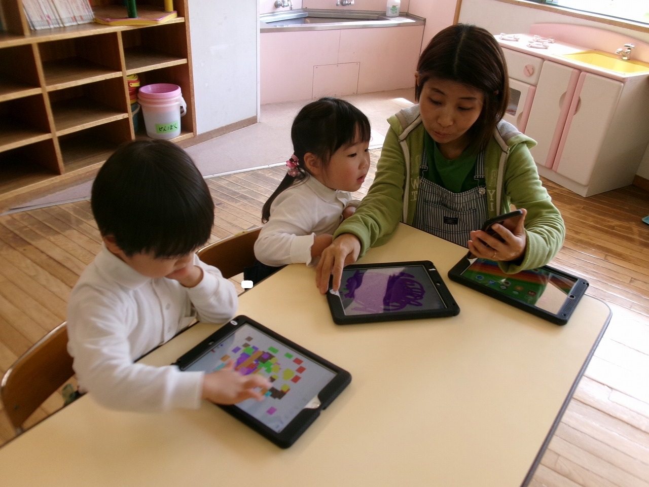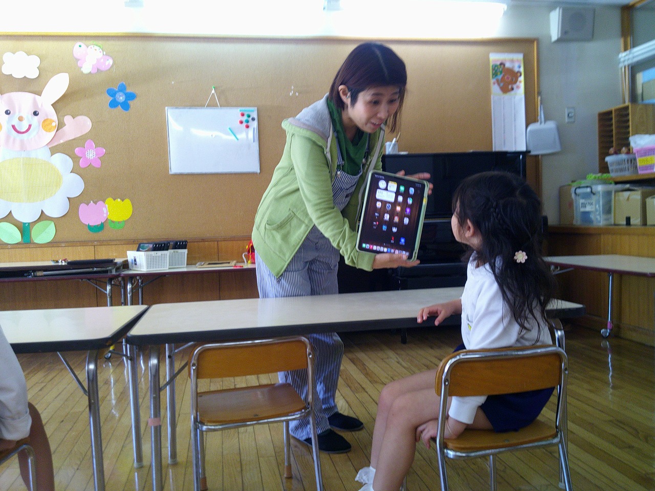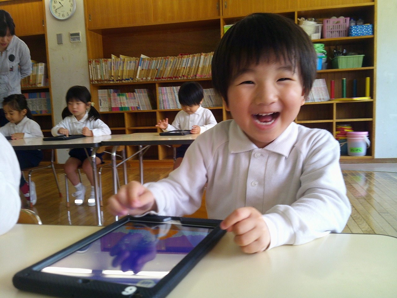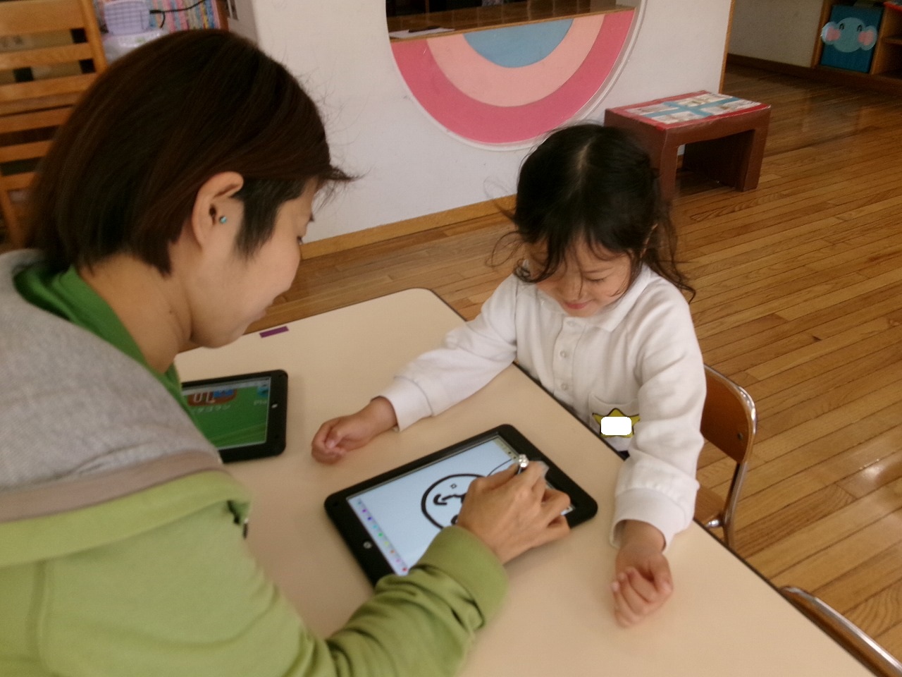 今日はまず、iPadが壊れやすい大切な機械であることを伝え、使い方のお約束を確認した後、「じゃぶじゃぶ」という水遊びのアプリを使って画面の触り方を練習しました。はじめは強く押しすぎて動かなかったり、そっと触れすぎて反応しなかったりする様子も見られましたが、遊びを通して少しずつコツをつかみ、指先を上手に使えるようになっていきました。