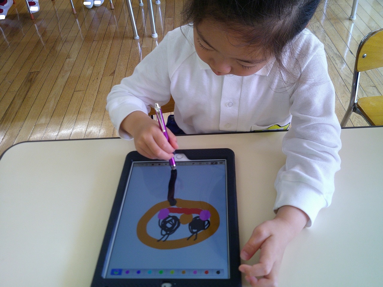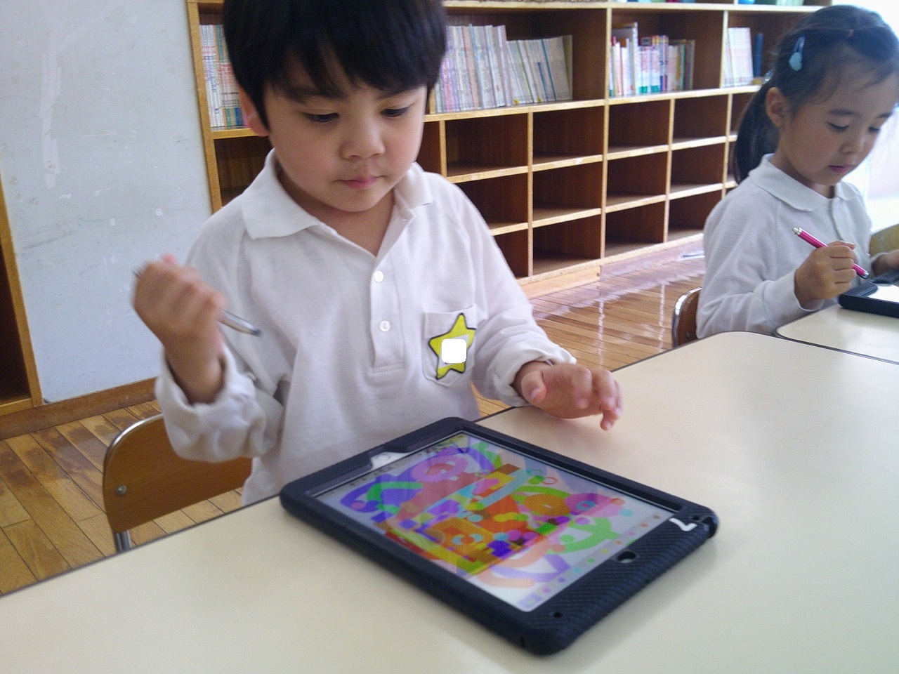 続いて、先生が手品でタッチペンを取り出すと、まるで画面から道具が出てきたように見え、子どもたちは「なんでー?」と驚いた様子でした。そのペンを使ってお絵かきに挑戦し、描いては消してを繰り返しながら、たくさんの作品を楽しんで作りました。いくつかの作品を作り、その中からお気に入りの1枚を選びました。この絵は次回シールにして自分のiPadに貼る予定です。