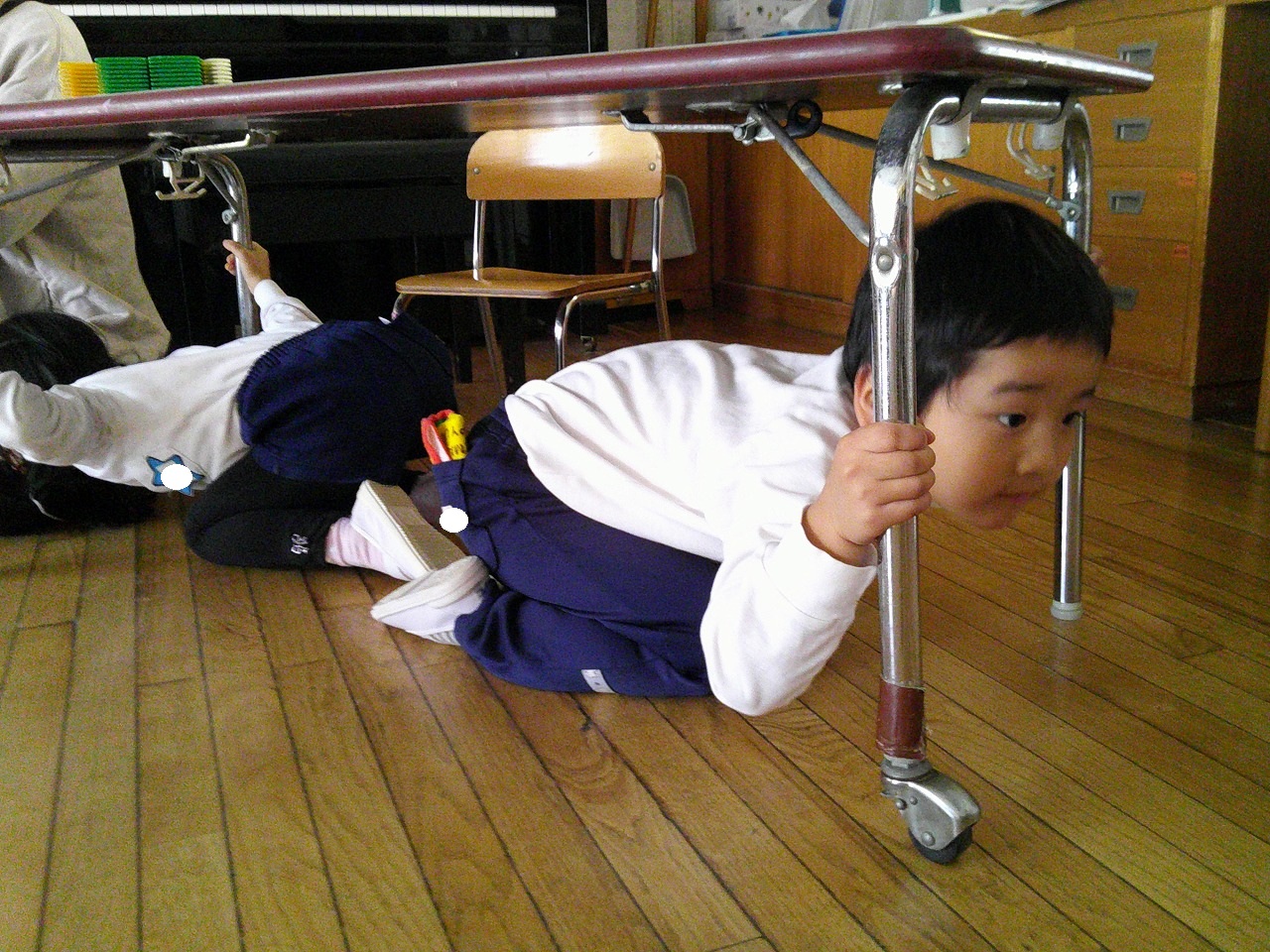 放送が聞こえると机の下には入って、身を守る行動を静かに落ち着いて行動し、その後、津波を想定した避難として2階に避難しました。その時も、座布団で頭を守って移動し、先生の話をよく聞いて避難をする様子はとても真剣でした。
