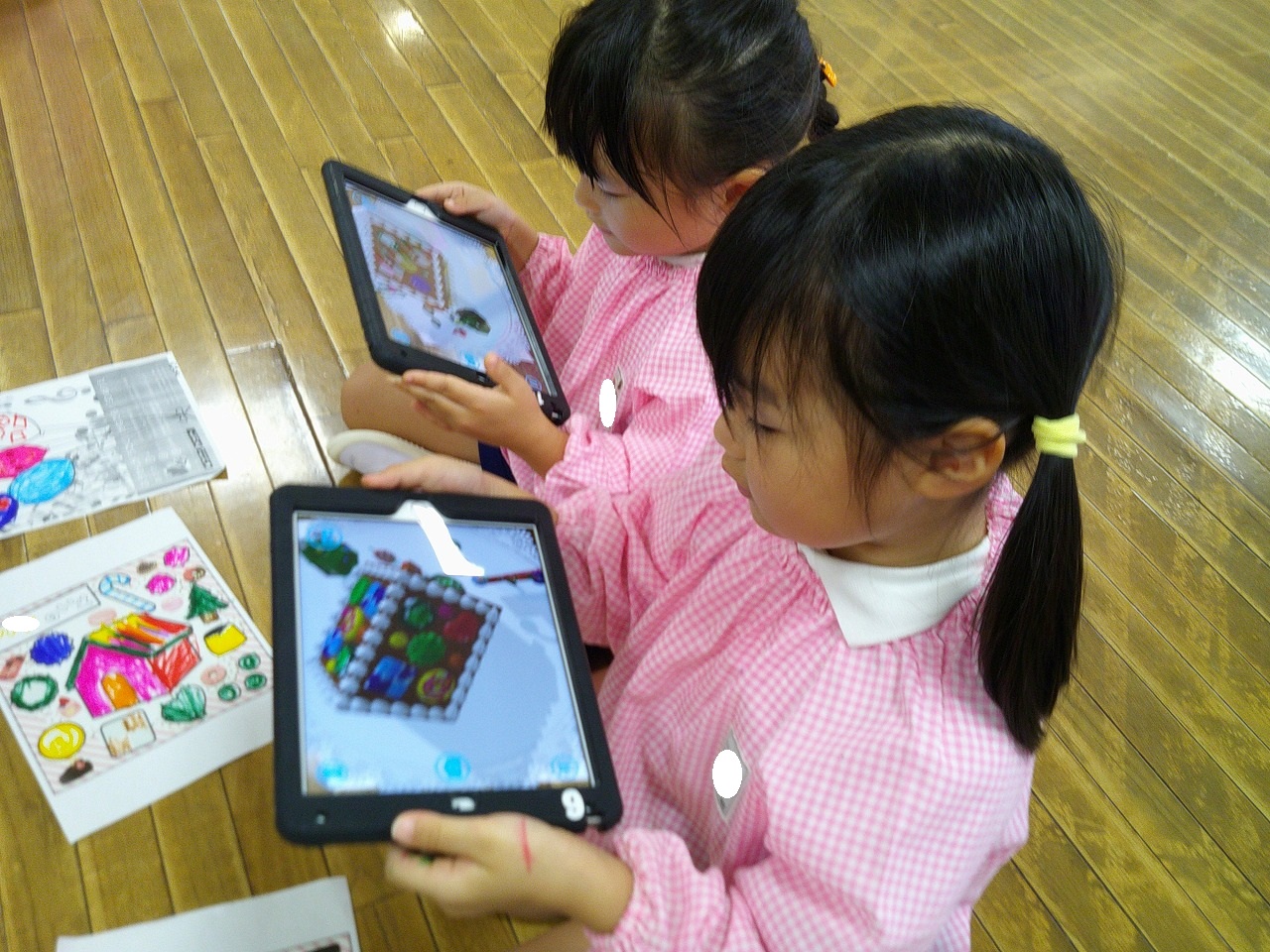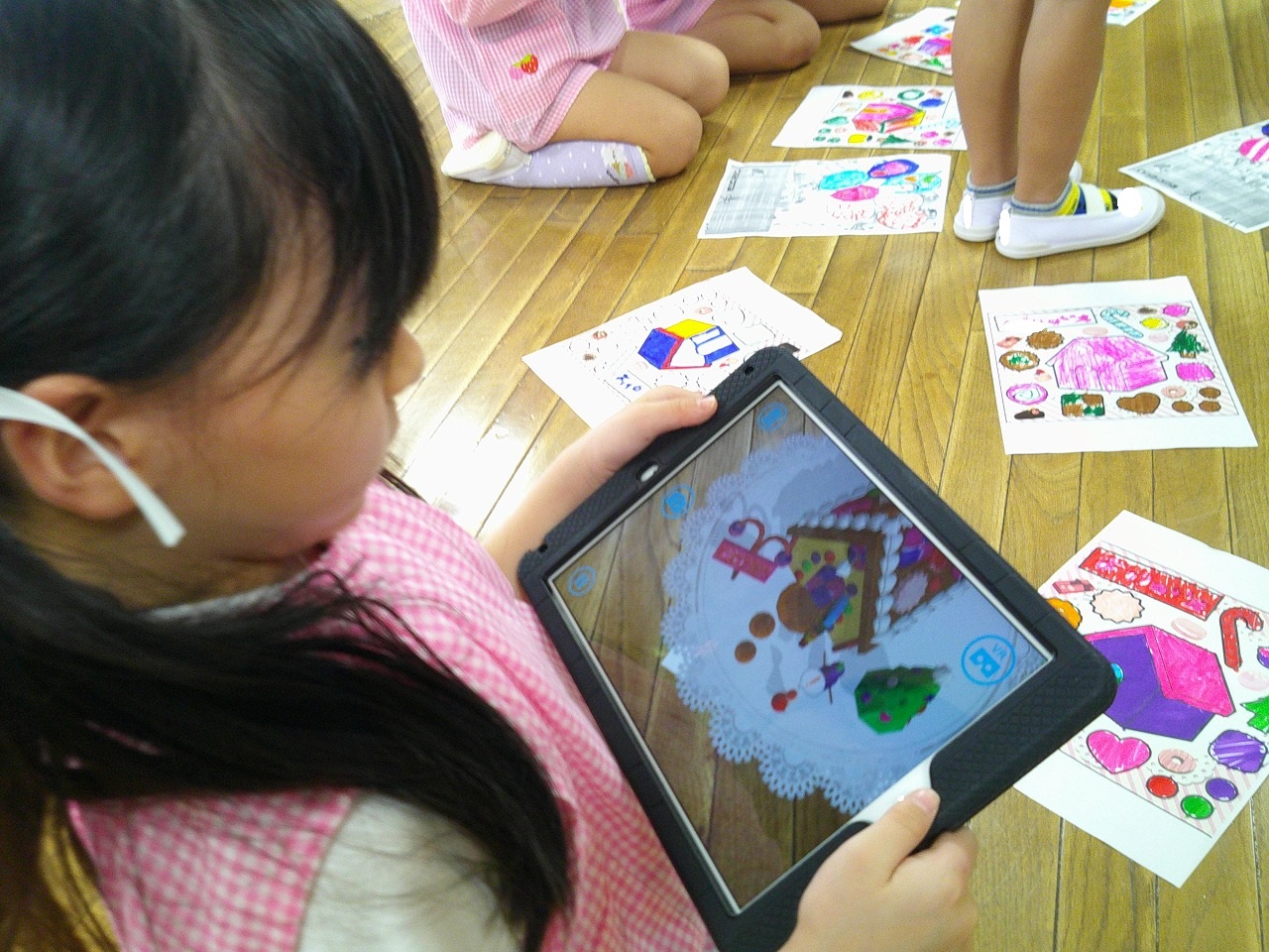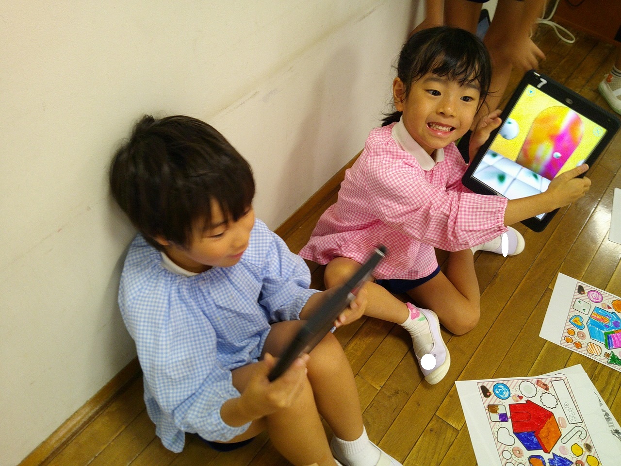 インターネットに接続できる環境を求め教室から出て玄関ホールでiPadを使った塗り絵の鑑賞を行いました。色を塗った絵をiPadでうつして見ると、平面のぬり絵がポンっと飛び出し立体になりおもしろい動きや音と一緒に楽しむことができます。ふうせんが画面から飛び出して触ると音を鳴らして割れたり、おかしの家から小人が出てきてその中に自分も入り部屋を眺めることもできます。上から見たり横からみたり画面をさわって動かしたり塗り絵をお友達の絵と交換するなどして、仲良くにぎやかに鑑賞しました。