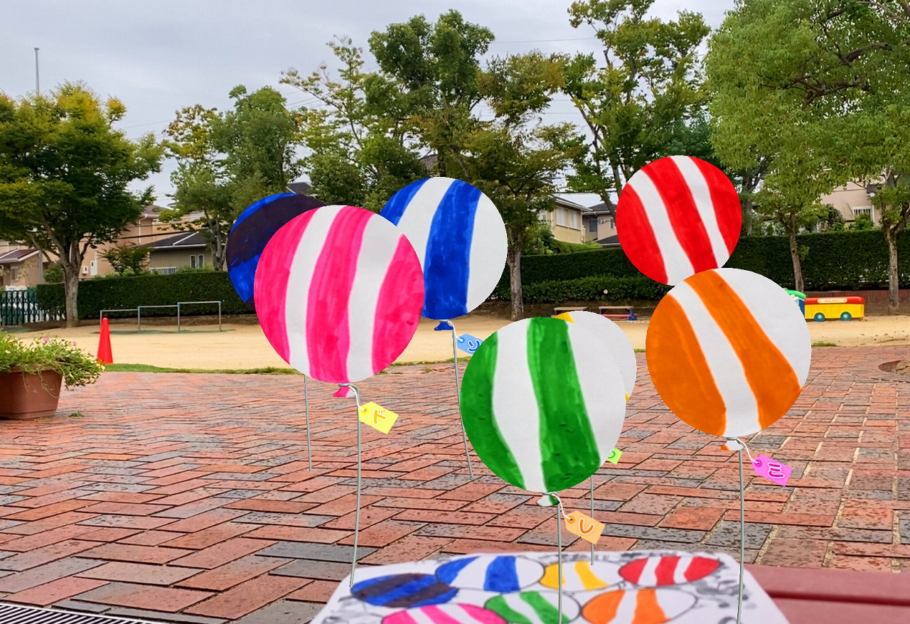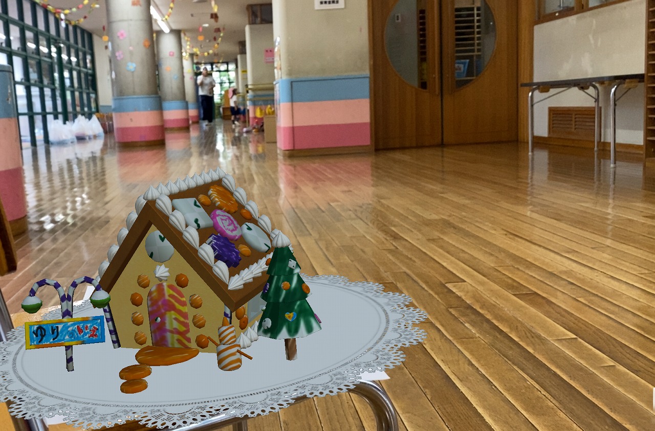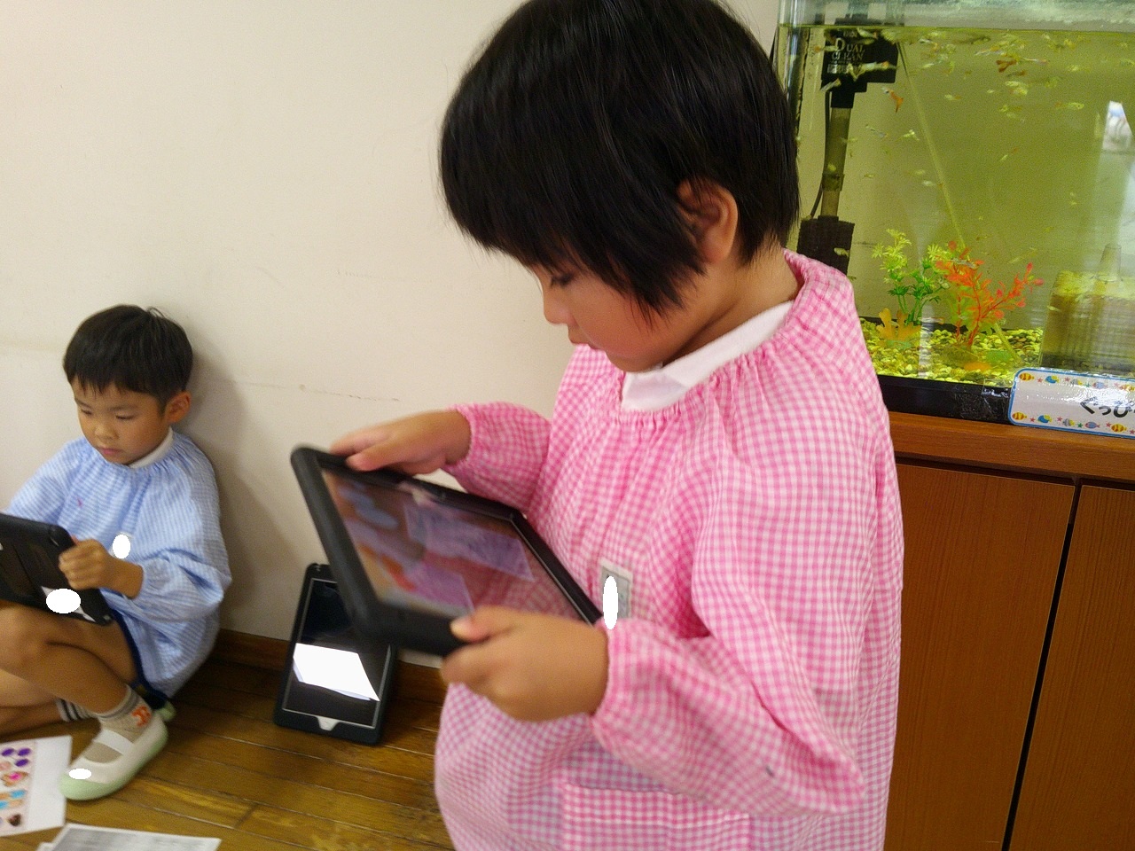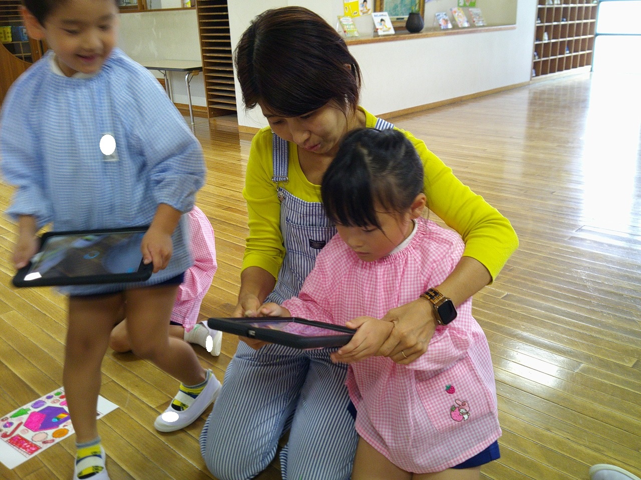 インターネットに接続できる環境を求め教室から出て玄関ホールでiPadを使った塗り絵の鑑賞を行いました。色を塗った絵をiPadでうつして見ると、平面のぬり絵がポンっと飛び出し立体になりおもしろい動きや音と一緒に楽しむことができます。ふうせんが画面から飛び出して触ると音を鳴らして割れたり、おかしの家から小人が出てきてその中に自分も入り部屋を眺めることもできます。上から見たり横からみたり画面をさわって動かしたり塗り絵をお友達の絵と交換するなどして、仲良くにぎやかに鑑賞しました。
