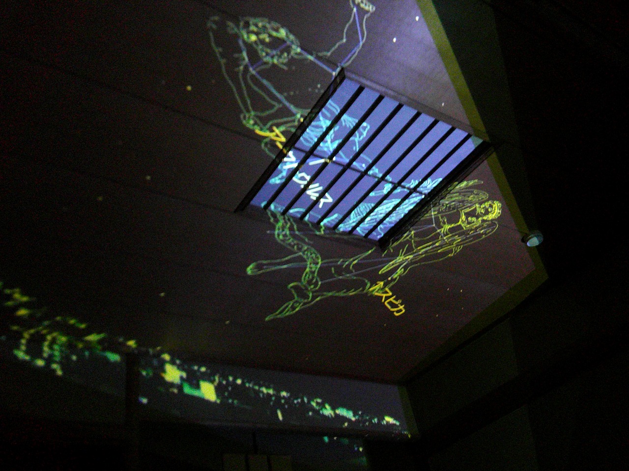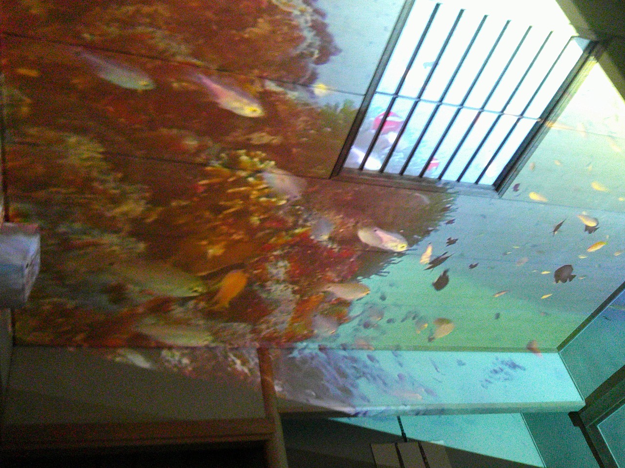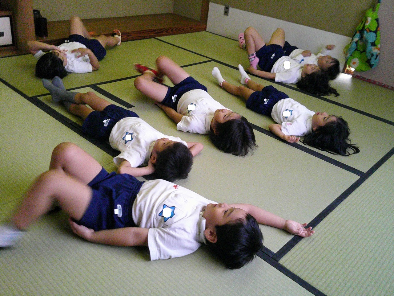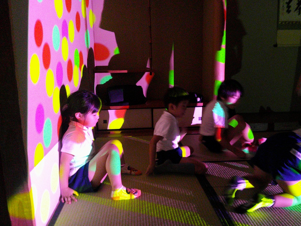 他にも、先ほ教室で描いた作品や、昨年の年長クラスの子ども達がつくったふしぎな動画、プラネタリウム、海の中の映像などを、まるで中にいるように感じ没入できるお茶室の中の小さい空間で鑑賞しました。畳の上で仰向けに寝ながら見て、楽しい気持ちや、気付いたことなどを口にだして共有しながらリラックスした良い鑑賞の時間を持つことができました。