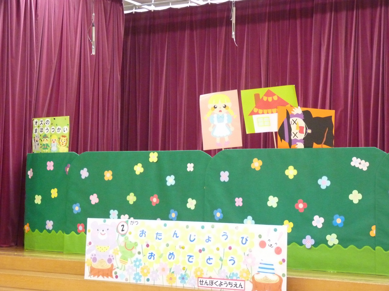 けろみちゃんもお祝いに来てくれてお祝いをしてくれたり、「クレヨンのくろくん」のお話やペープサート「ブレーメンの音楽隊」も楽しんだり、色々なお祝いで盛り上がりました。