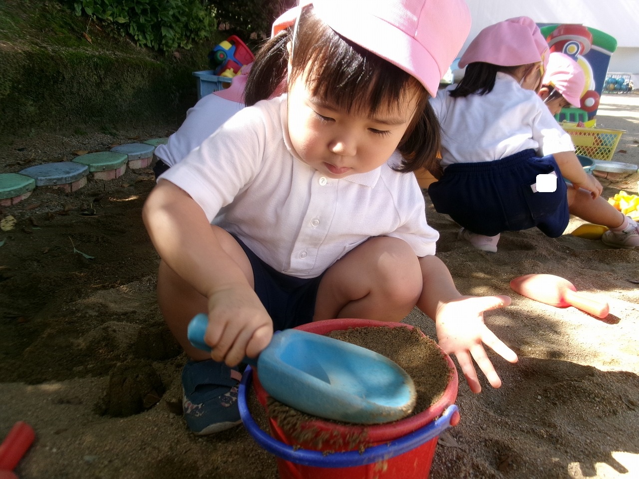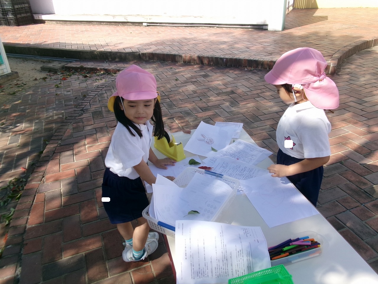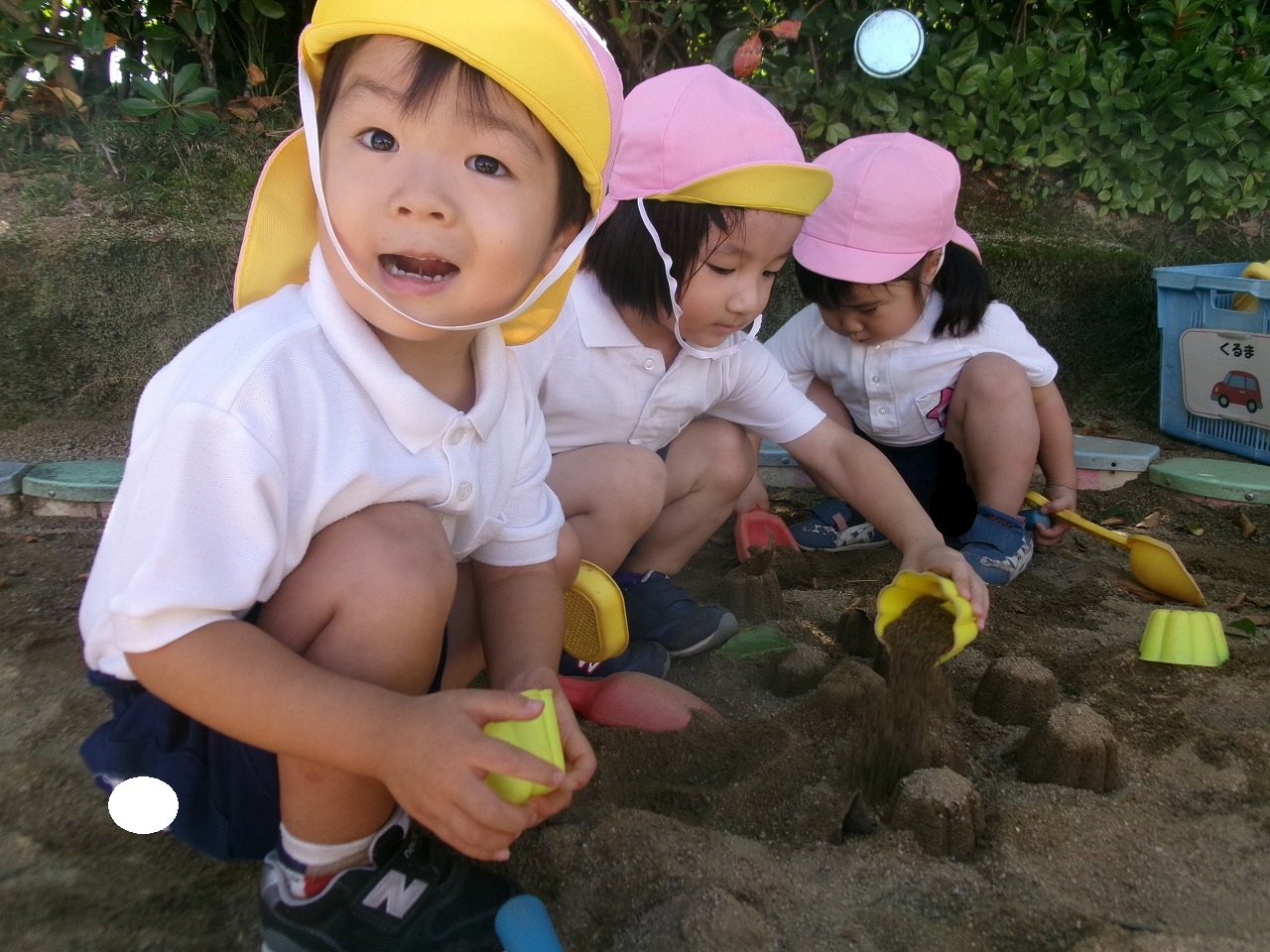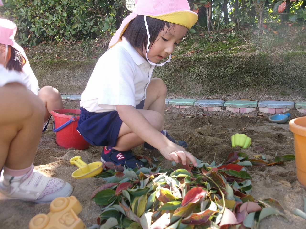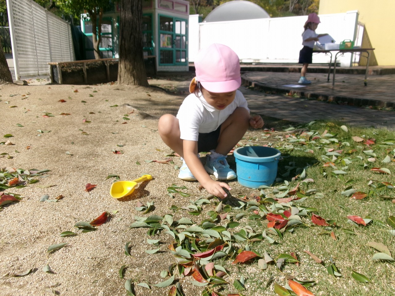 バッタやトンボを虫取り網でとったり、落ち葉を拾って紙に貼って葉っぱの耳のうさぎさんを作ったり、秋の自然を満喫しています。落ち葉を使ったお砂のケーキ作りも人気です。