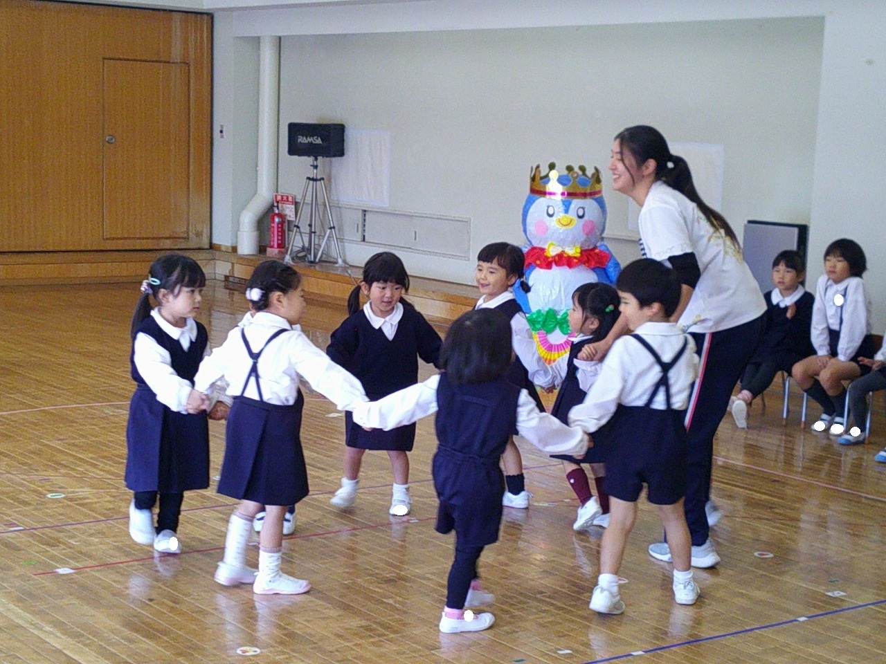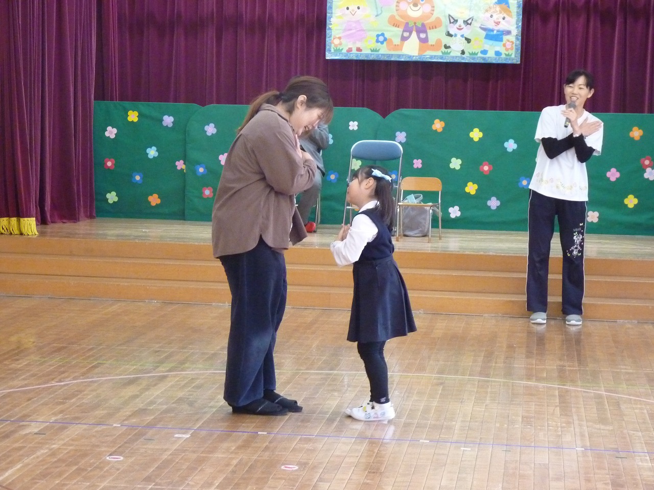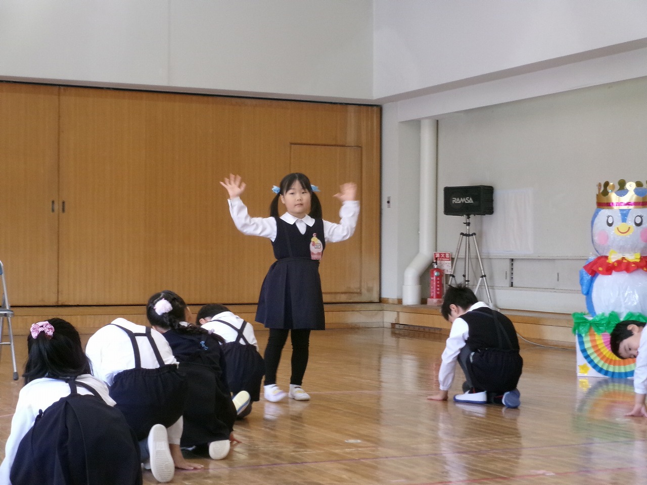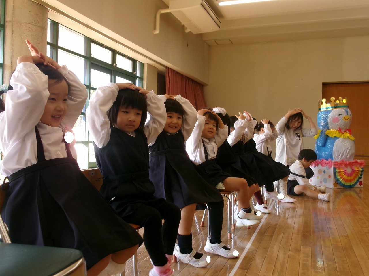 副園長の乾先生とケロミちゃんの「おちたおちた」のゲームは、みんなとても楽しんでいて、「かみなり!」でおへそをおさえたり、「ザーザー(雨の音)」で頭をおさえたり、かわいいポーズをして遊びました。