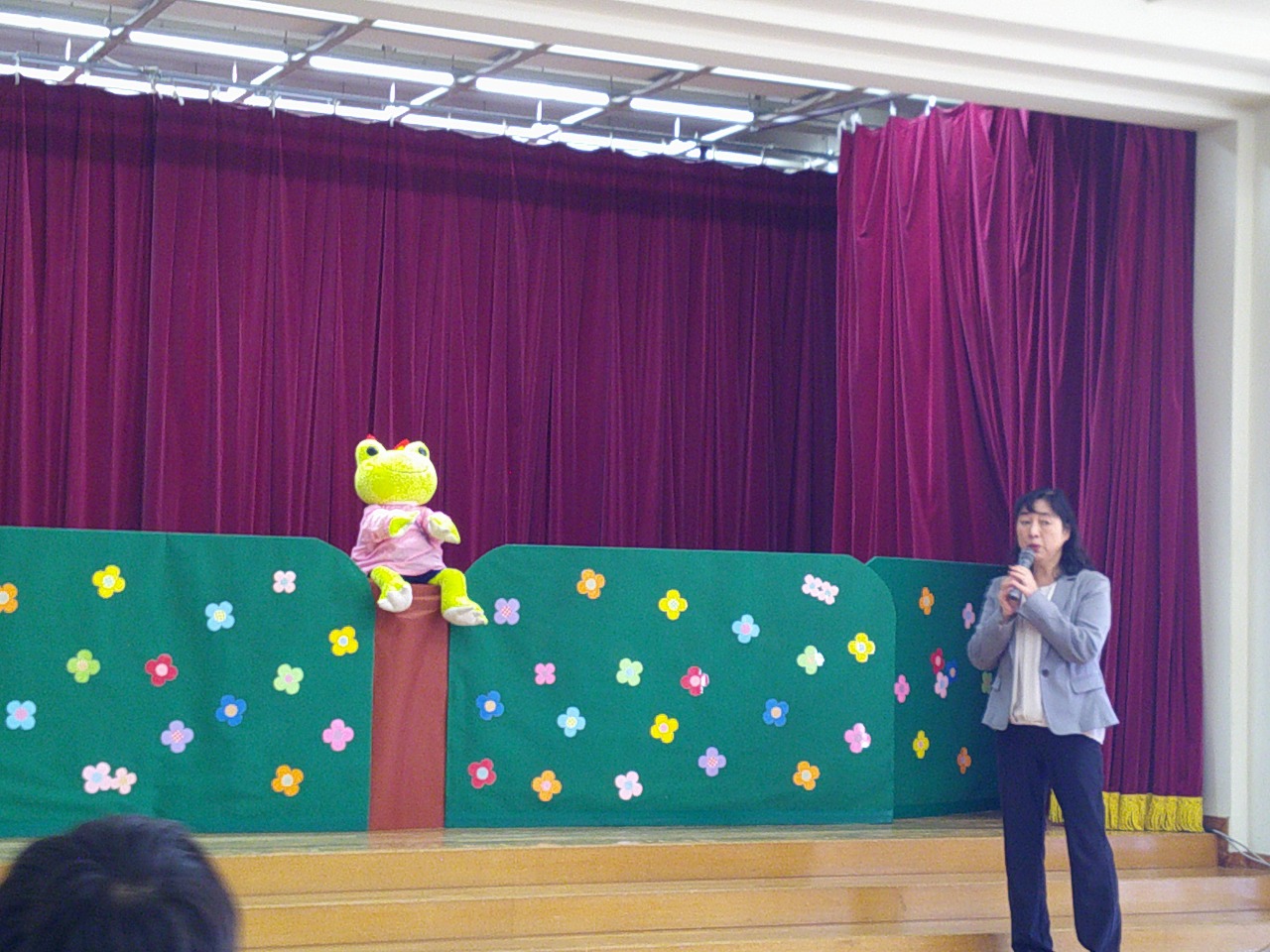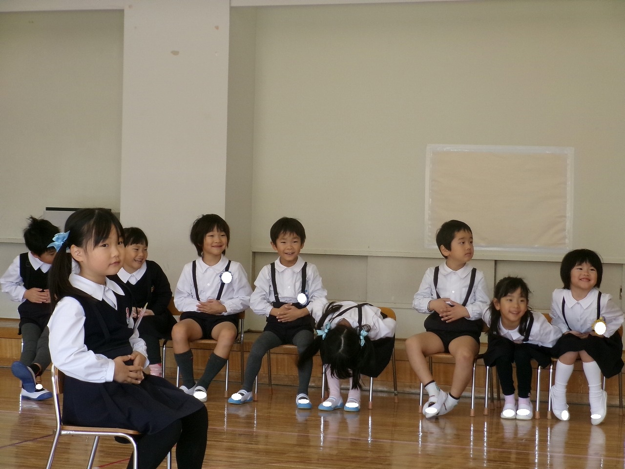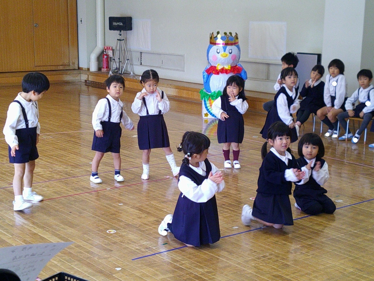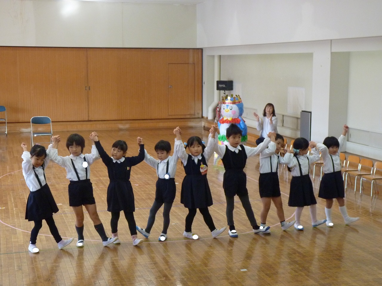 副園長の乾先生とケロミちゃんの「おちたおちた」のゲームは、みんなとても楽しんでいて、「かみなり!」でおへそをおさえたり、「ザーザー(雨の音)」で頭をおさえたり、かわいいポーズをして遊びました。