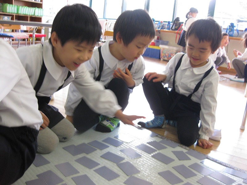 年中あやめ組さんには、製作帳「おにぎり」、「どこにあるかな」が入っています。カードに描いてあるものはどこにあるかな?探してみてね。