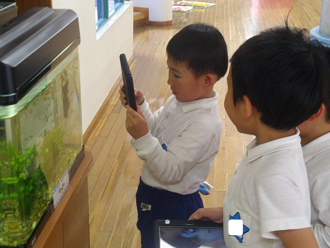 はじめにカメのおうちの中に置いたカメラで撮り続けたあさがおの成長の様子を見ました。まずは2枚の写真を比べて違う所を探します。「葉っぱが増えた」とすぐに気付き、園のどの場所かもわかったようです。毎日3時間毎に8枚ずつ自動撮影で7月から8月の1ヶ月間写真を撮り続け、一定の間隔を空けて撮影した写真をつなぎ合わせてコマ送り動画を作るライムラプスの手法で短く10秒にまとめました。並べてみると、あさがおのつると葉っぱがぐんぐん伸びて花が咲き、そして枯れる様子がよくわかります。「伸びてる」「あ、花咲いた」「植木鉢も全部なくなった」と、気付いた意見を述べながら興味深そうに見ていました。他にも、あさがおの花が開く様子や、トマト、豆などの他の植物の成長をタイムラプス動画を鑑賞しました。植物がゆらゆら揺れながら伸びる様子を見て「踊ってる」と踊りだしたり「かつおぶしみたい」と発言したり、様々な気付きがあったようです。