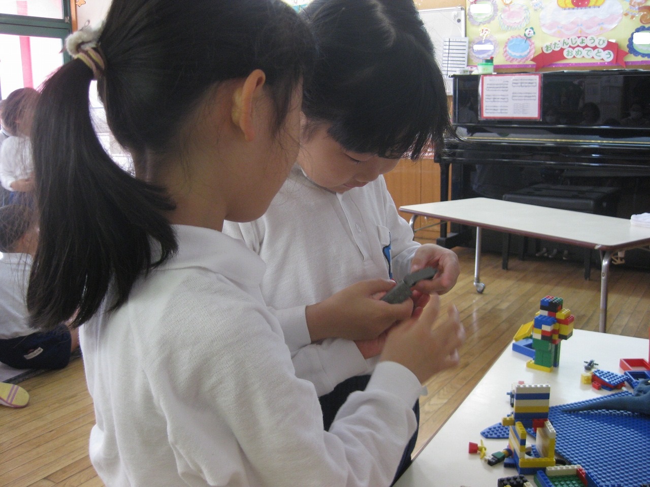 いろいろな楽器の音で演奏したり録音もできる本格的なピアノのアプリで好きな音を探し発表しました。「変な音」「ロボったみたい」「おならだー」と見つけた音を伝えあって楽しさを共有していました。最後に「タッププラス」というリズムを楽しむアプリを使いました。タイミングをあわせてボタンをタップしたり長く押したりします。曲が終わると結果発表があります。何度も挑戦してすればするほど上手くなって音と笑顔がたくさんあふれる賑やかで楽しい教室でした。 iPad担当 籔晶子