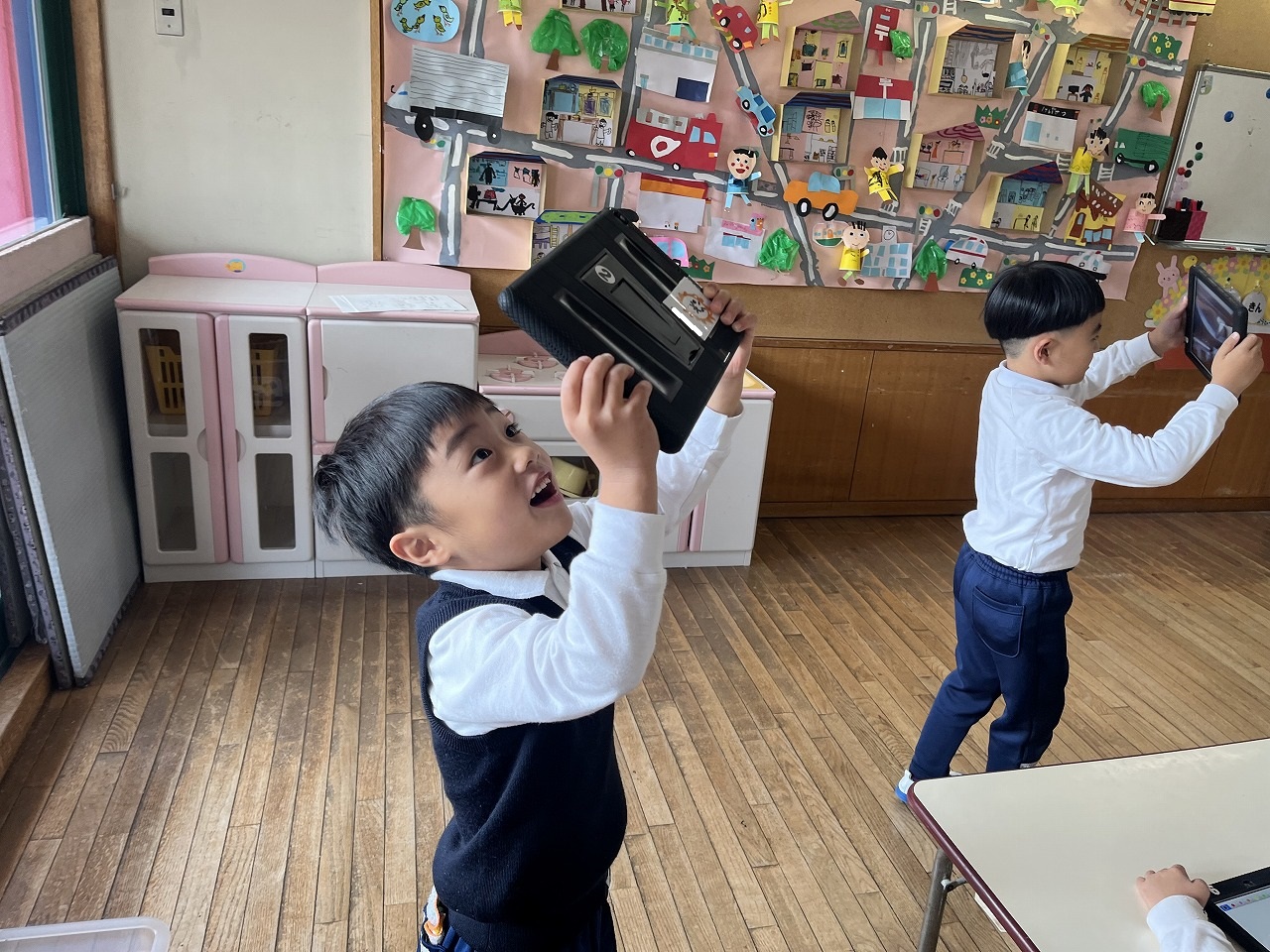副園長乾先生の「ぽんたの自動販売機」のお話をみんな真剣に聞いて、ペープサート「バナナの親子」では早口言葉の歌詞も楽しみました。