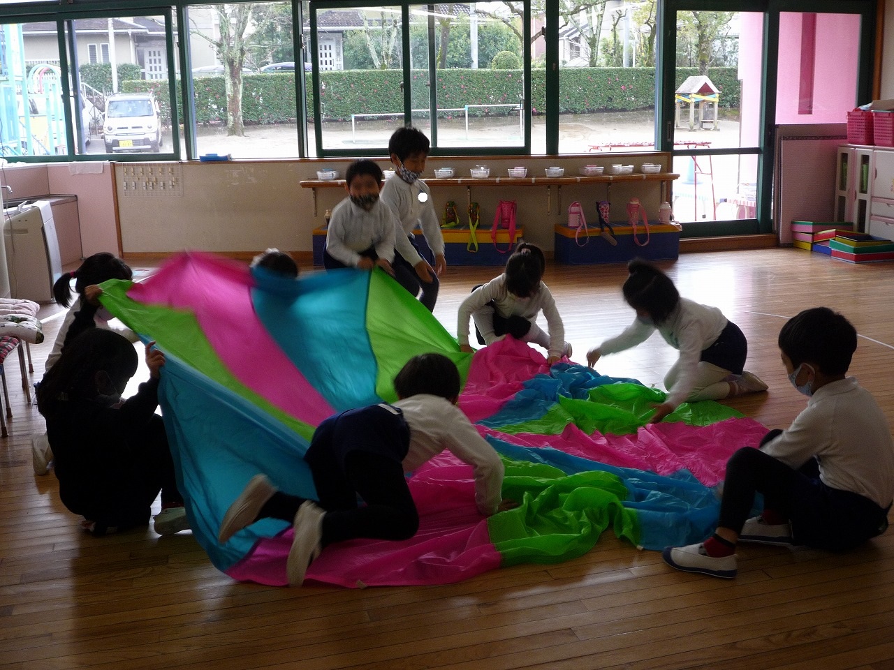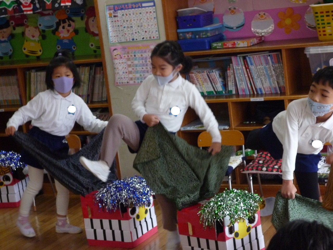 親子でふれあい遊びをしたり、もも組、あやめ組、あお組のお友だちからはおゆうぎのプレゼント、副園長からのお話「おおきなカブ」や、ペープサート「このゆびとまれ」のプレゼントがありました。