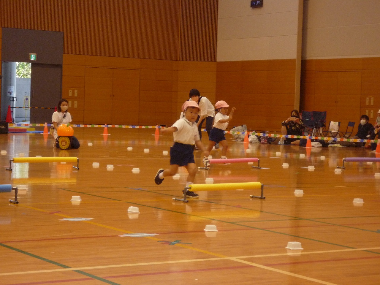 今日は、大きな畳を飛び越えることに挑戦しました。片足をかけて腕の力で登ったり、ジャンプの力を生かして畳に飛びついて乗り越えたり、奮闘しながらもみんな頑張っていました!