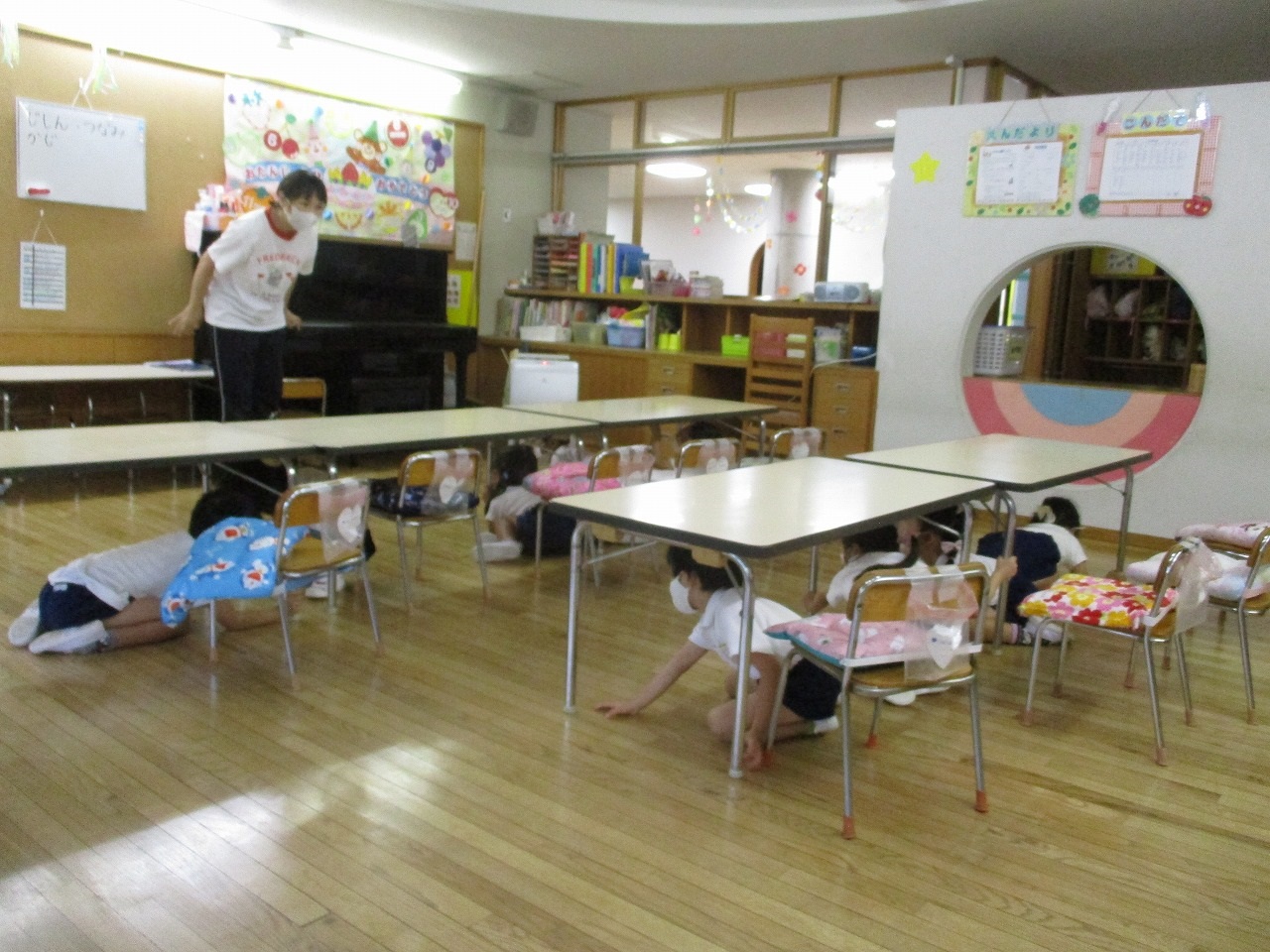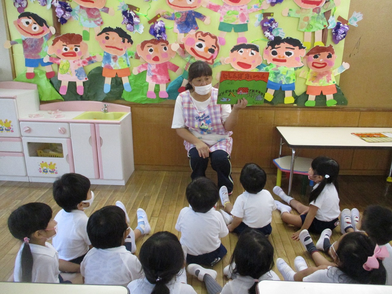 それから、みんなの大好きなケロちゃんが遊びに来てくれて、一緒に「このうたなーに?」のクイズをしました。他にも乾先生のお話「かぐやひめ」やペープサート「もしもしだいすき」を見て楽しいお誕生日会になりました。