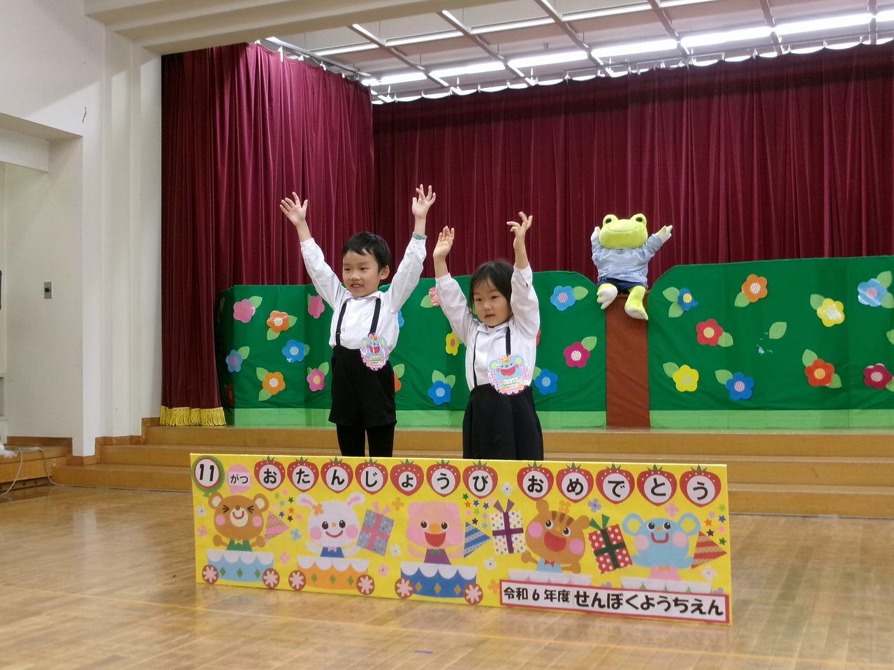リズムに合わせて動いたり、高い音や低い音を使ってうさぎさんやぞうさんになって、跳んだりかがんだりして楽しく動き回りました。