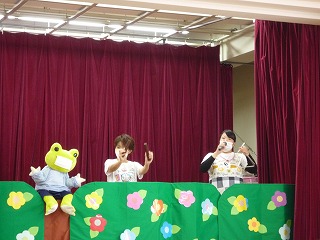 クッキーズのお姉さんによるコンサートでは、子どもたちの大好きな「虹のむこうに」や「パプリカ」そして、クリスマスの歌を歌って踊ってくれました。子どもたちも一緒にリズムに乗って歌ったり、踊ったり楽しいひと時を過ごしました。