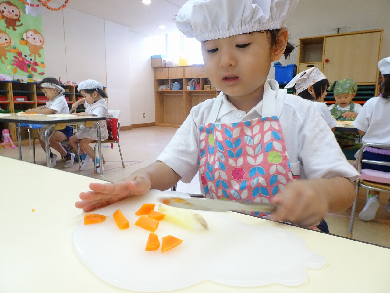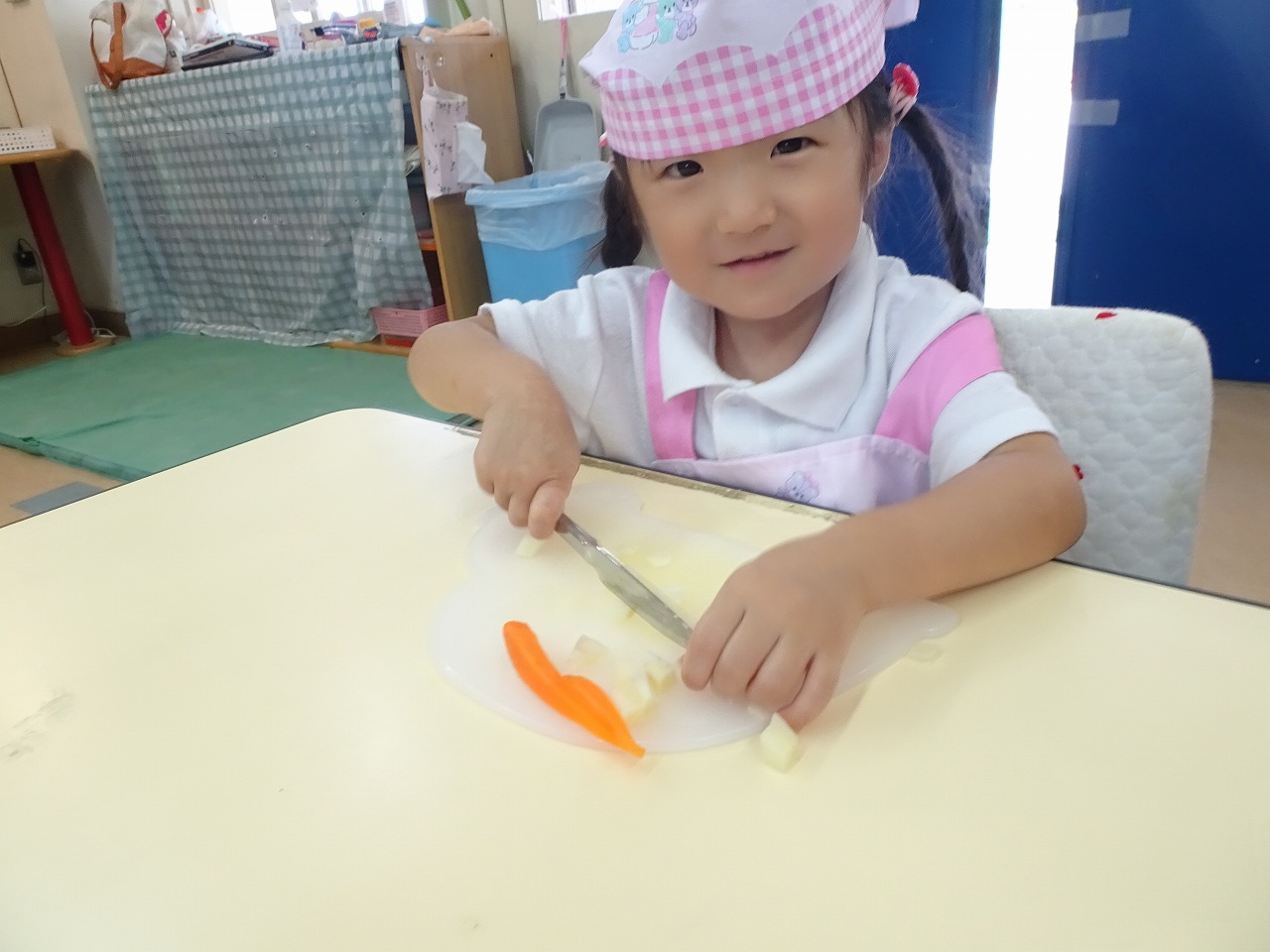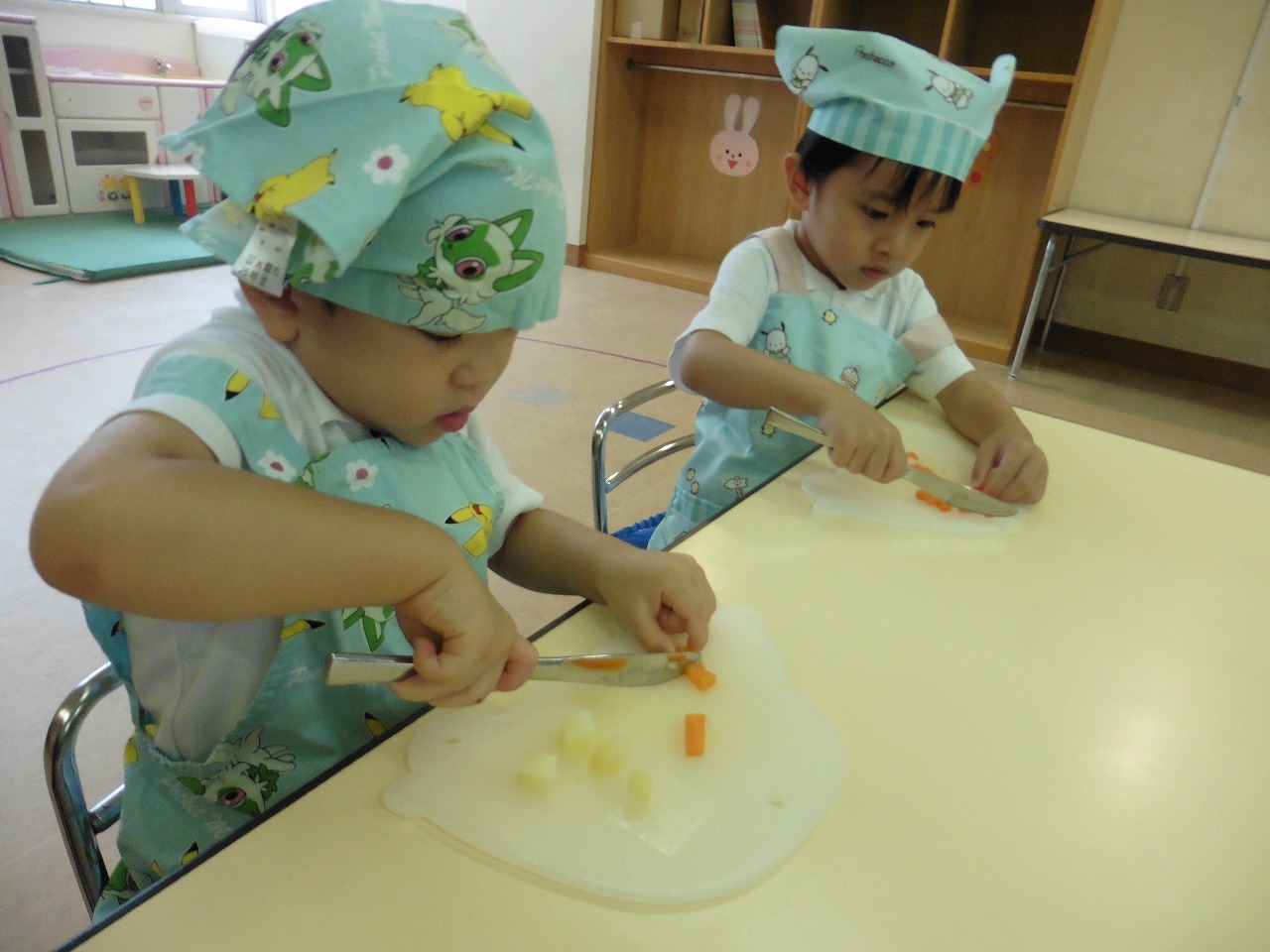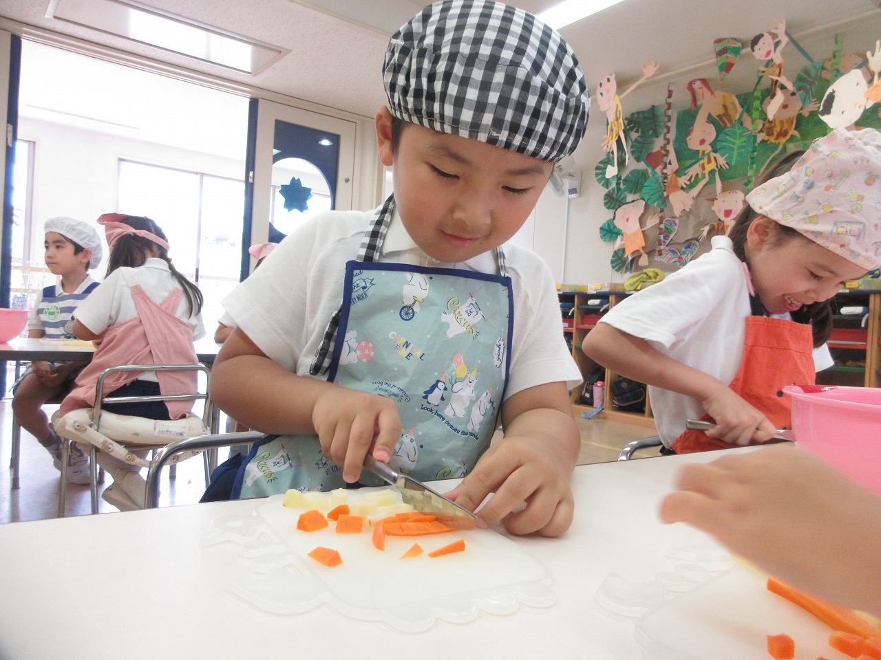 にんじんとじゃがいもを包丁で切ってクッキングを楽しみました。