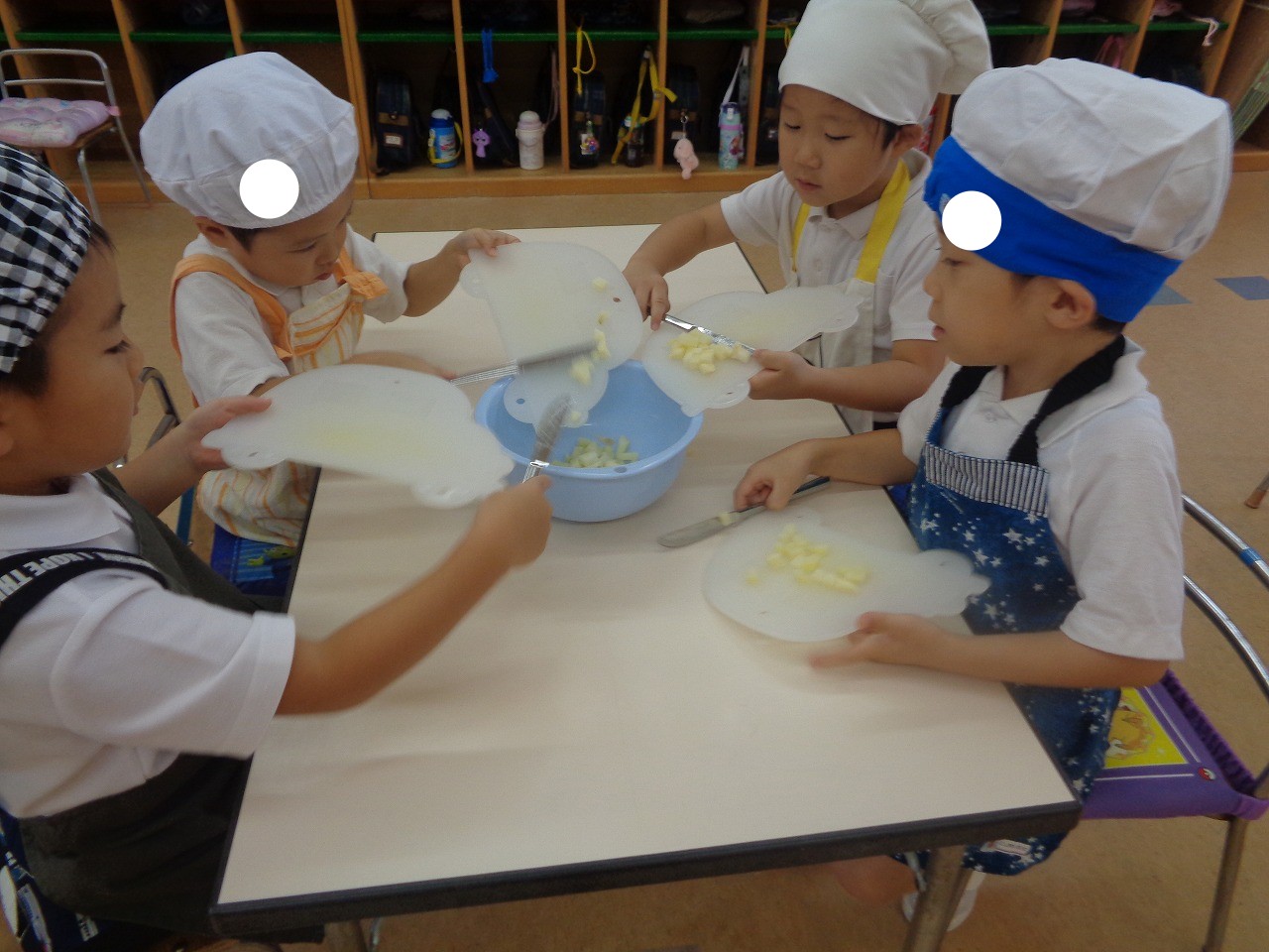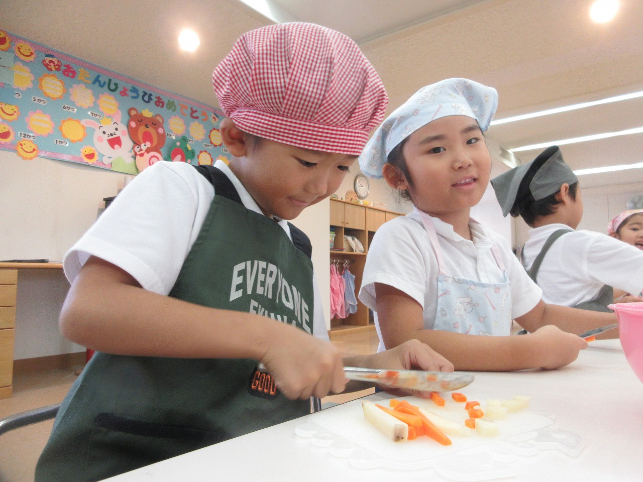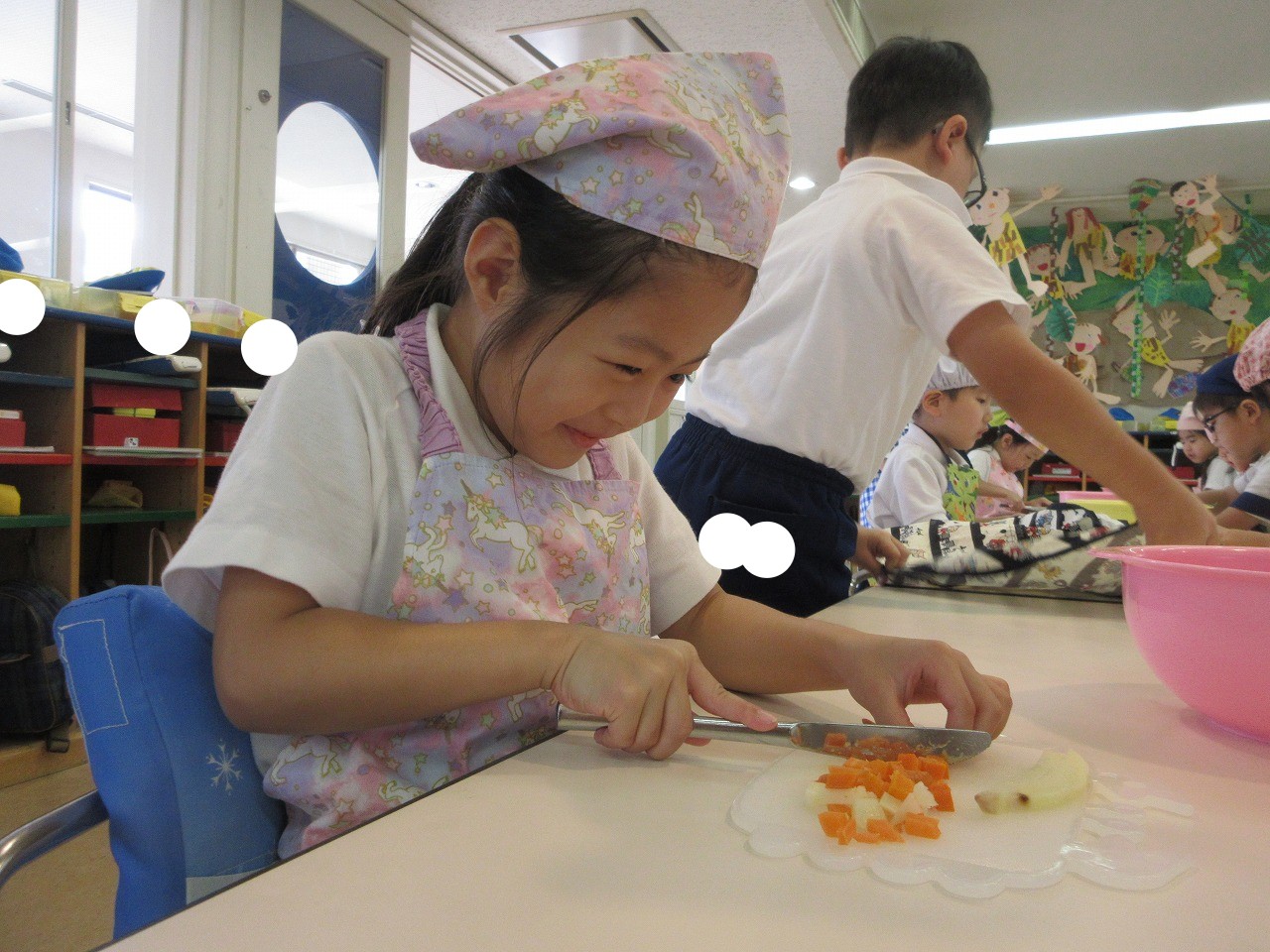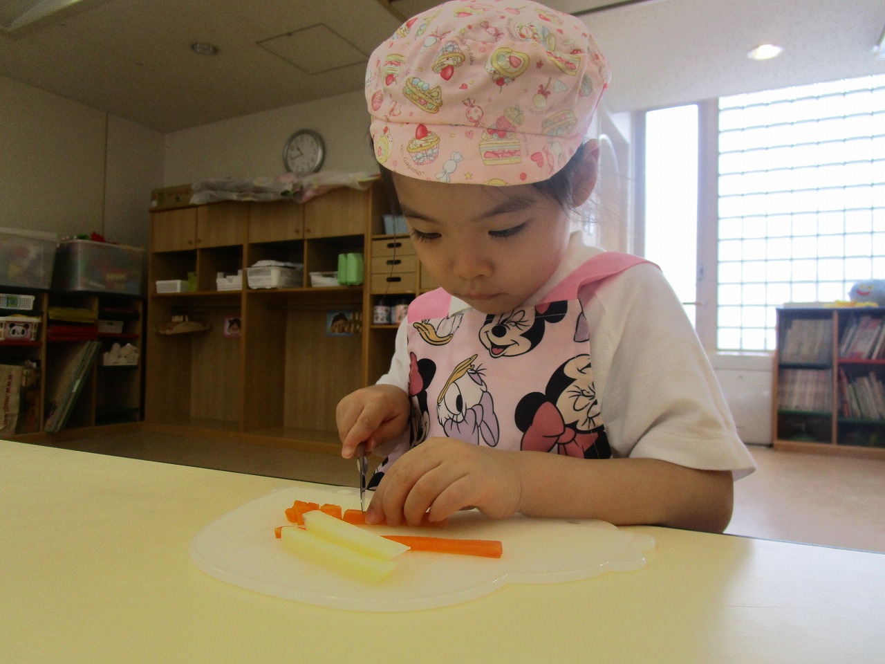 にんじんとじゃがいもを包丁で切ってクッキングを楽しみました。