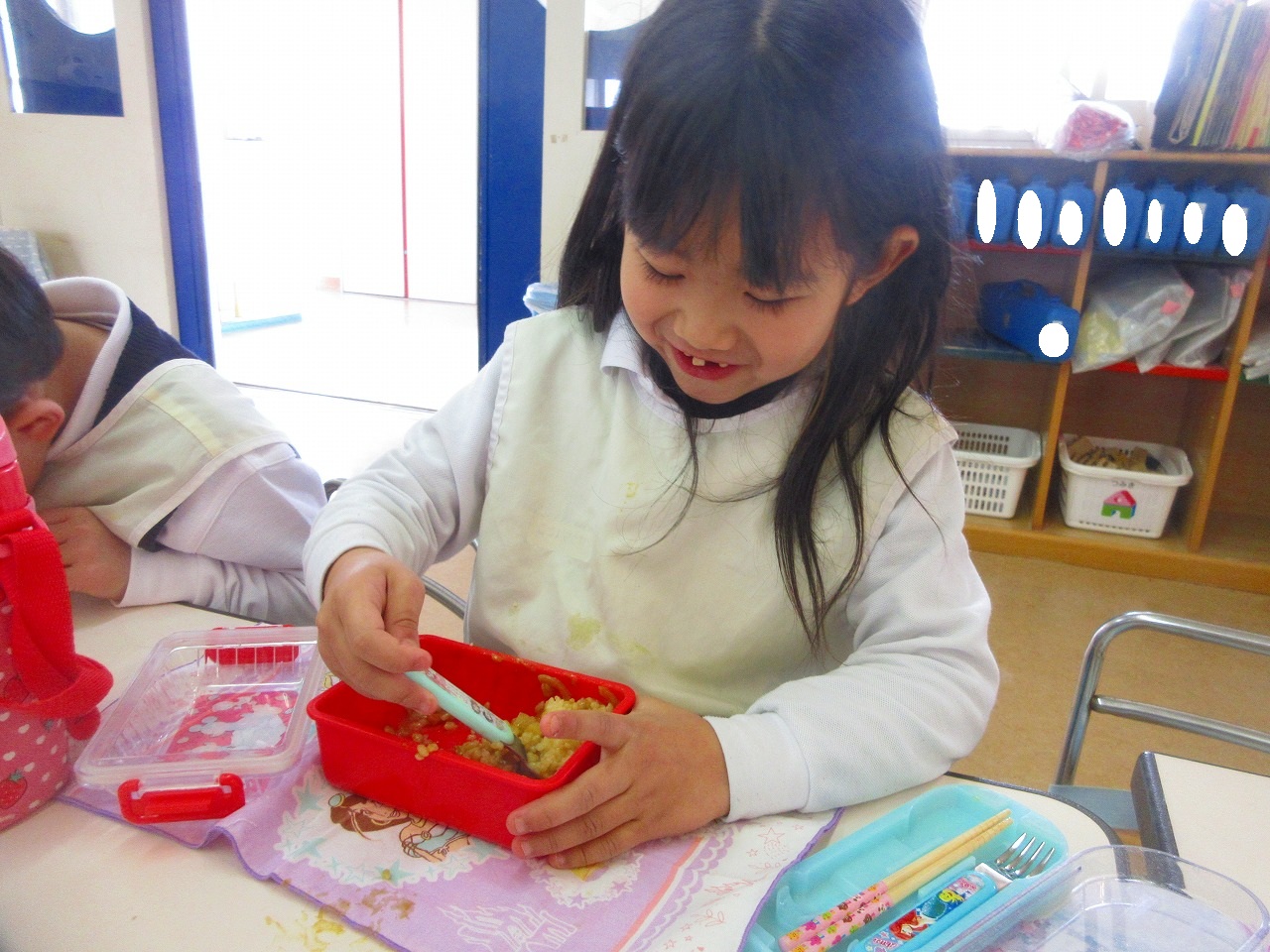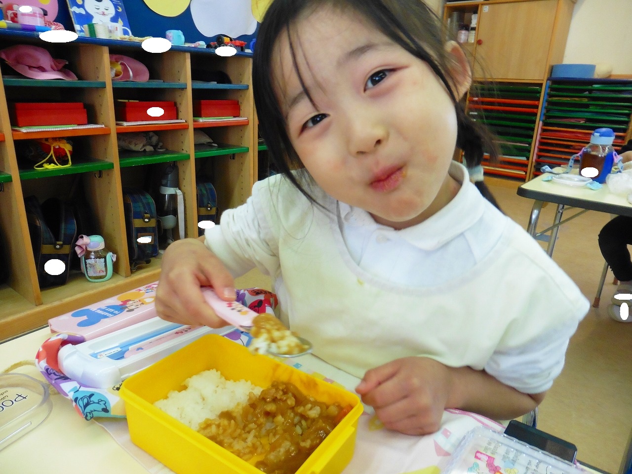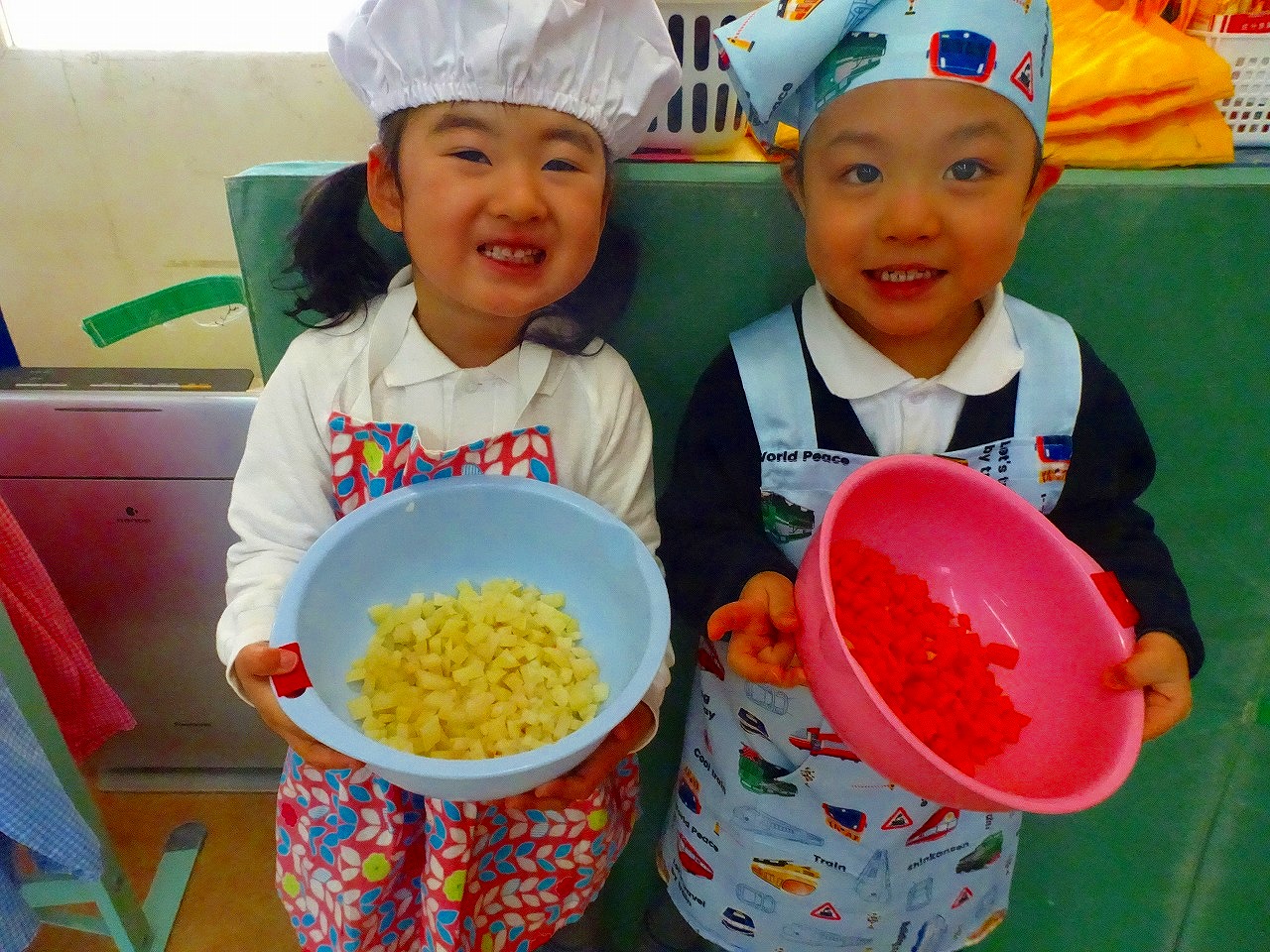 美味しく出来上がったカレーを見て「ぼくが切ったにんじんだ!」「おいしい!」と大喜びでした。