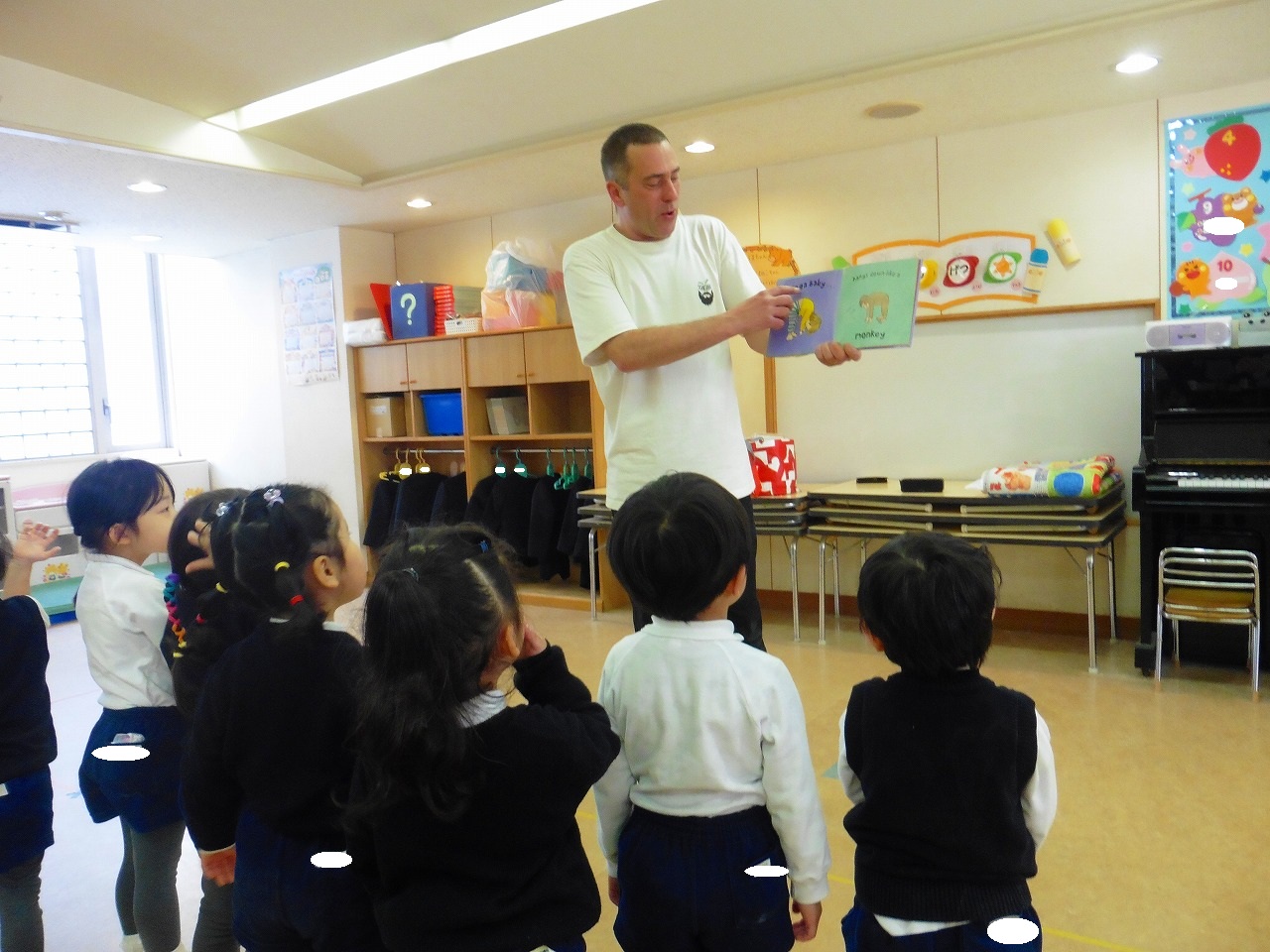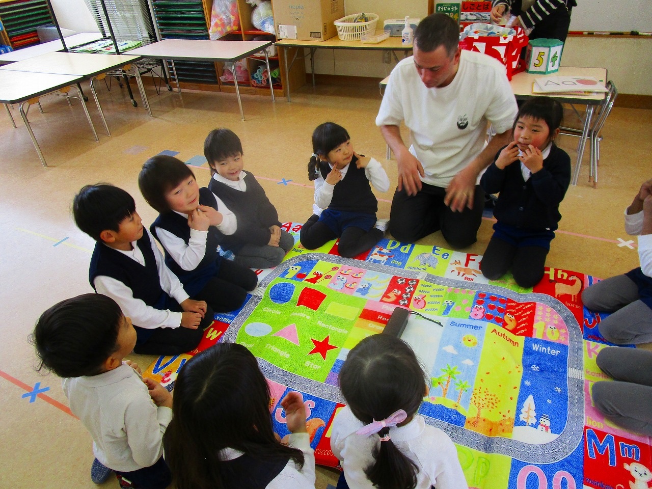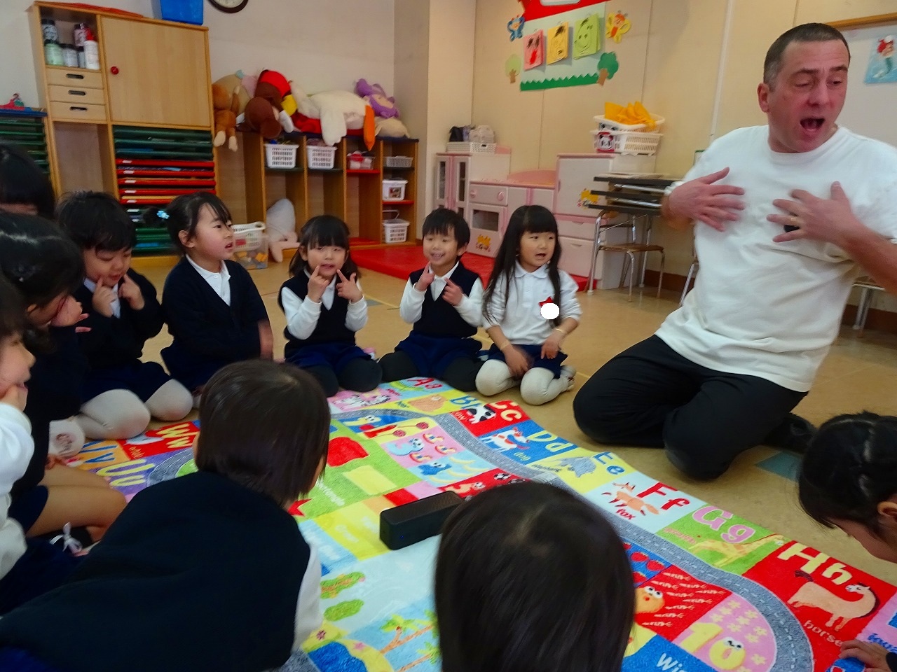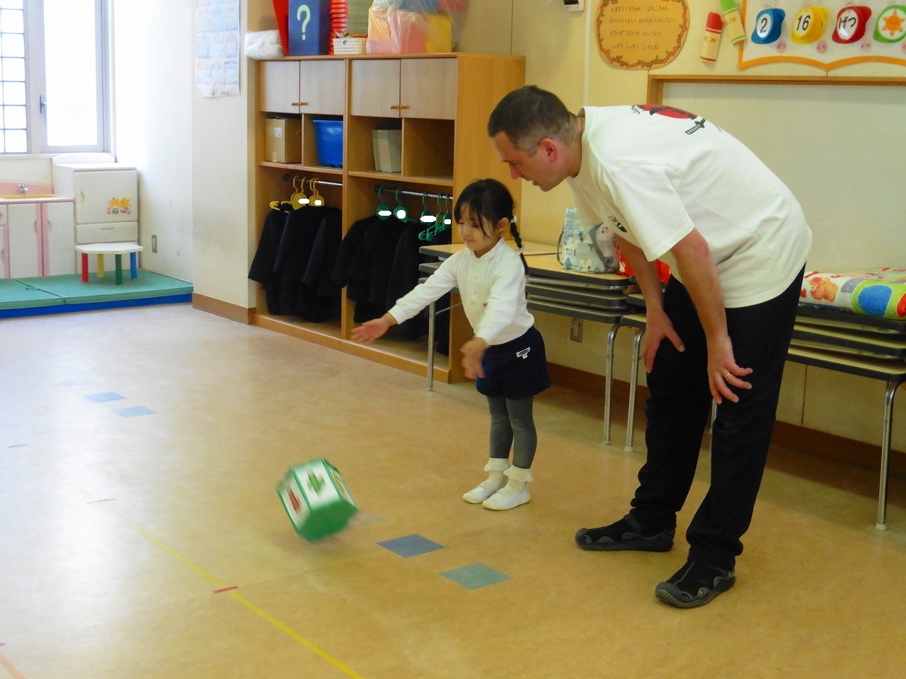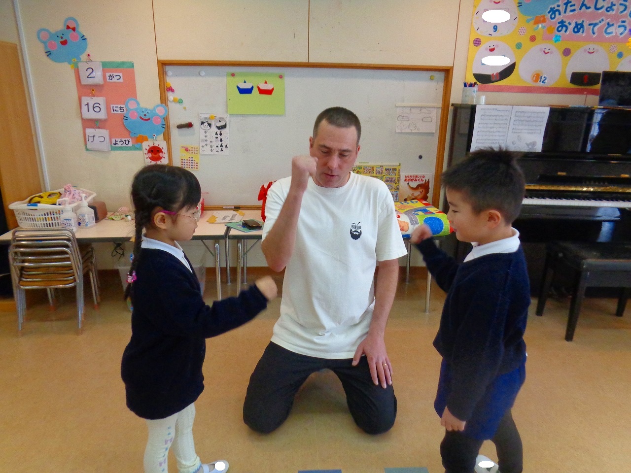 あやめ組では英語でじゃけん遊びをしたり、あお組では英語の歌に合わせて体を動かしたりして楽しく遊びました。