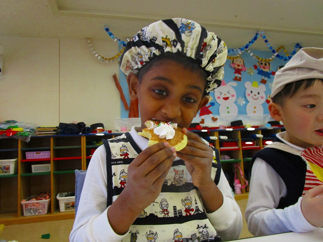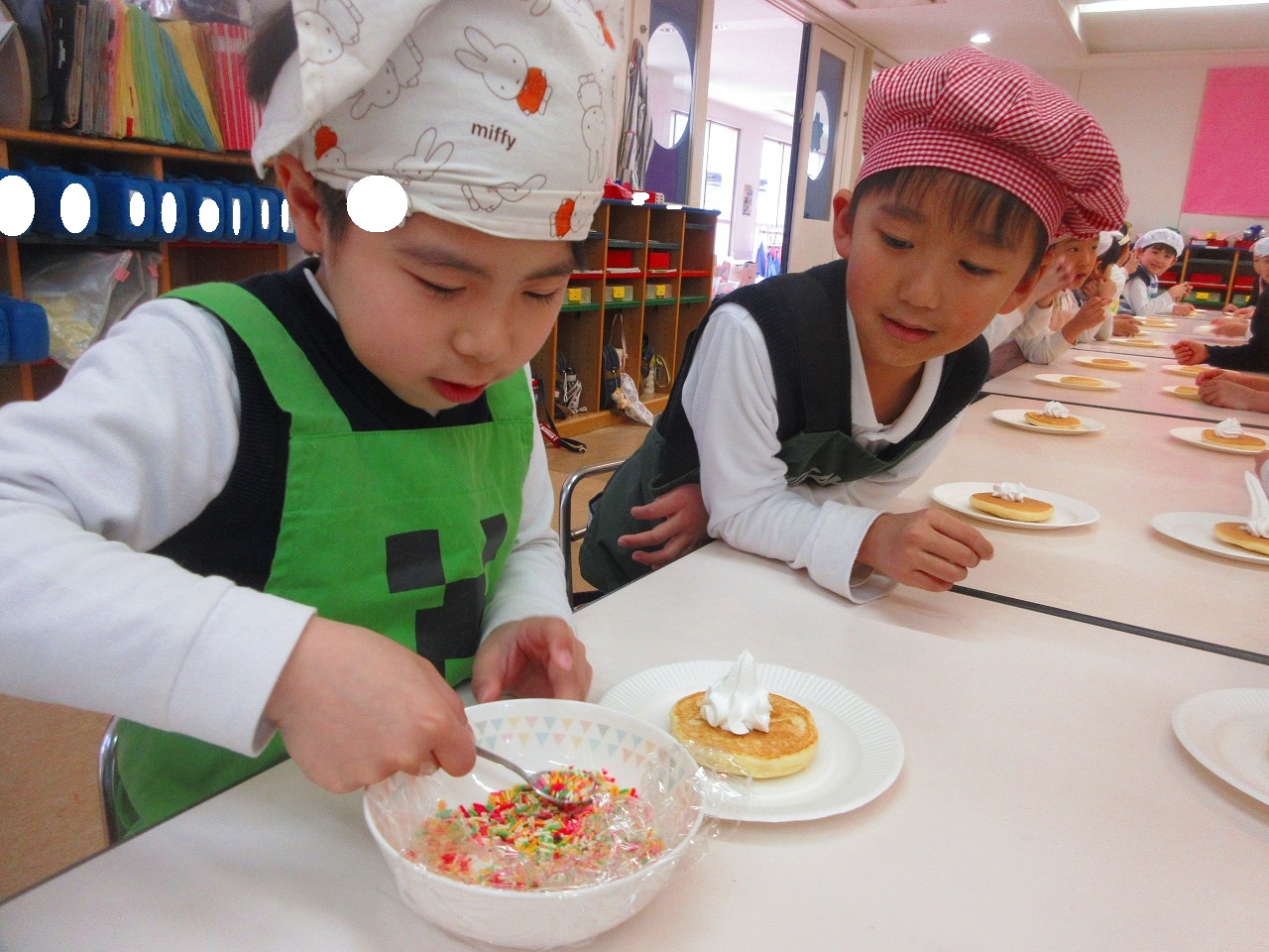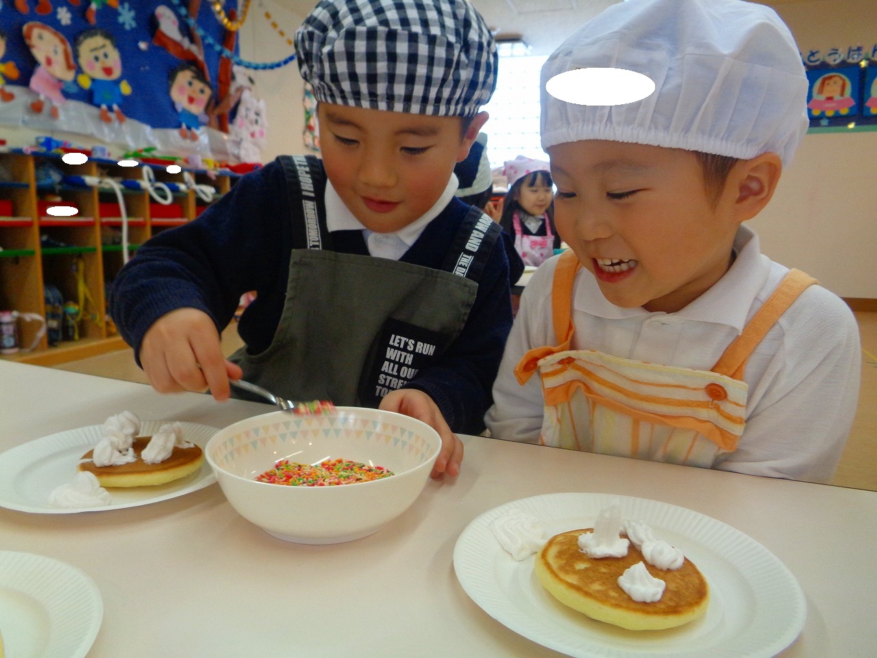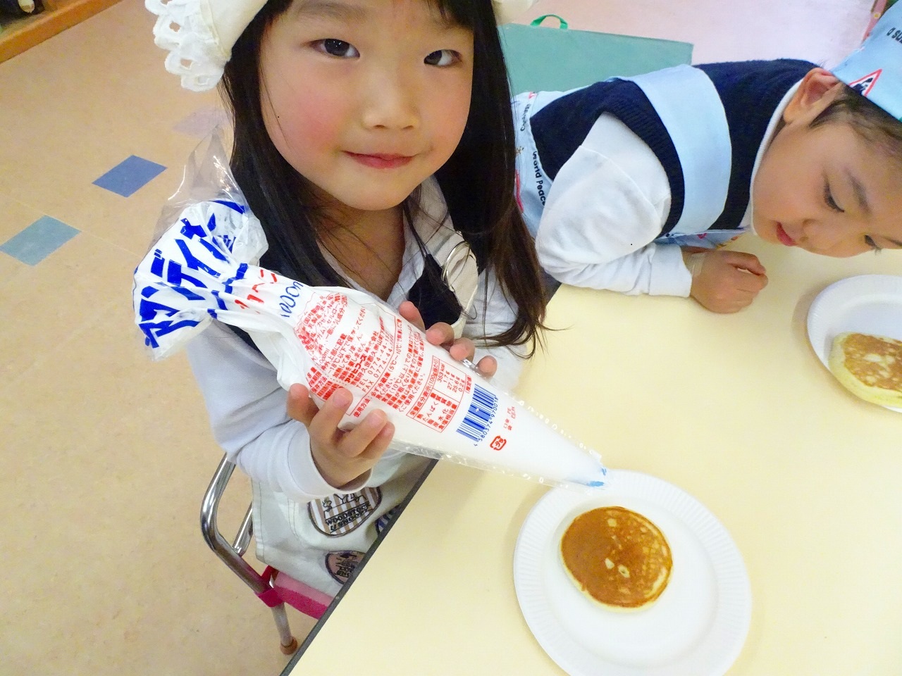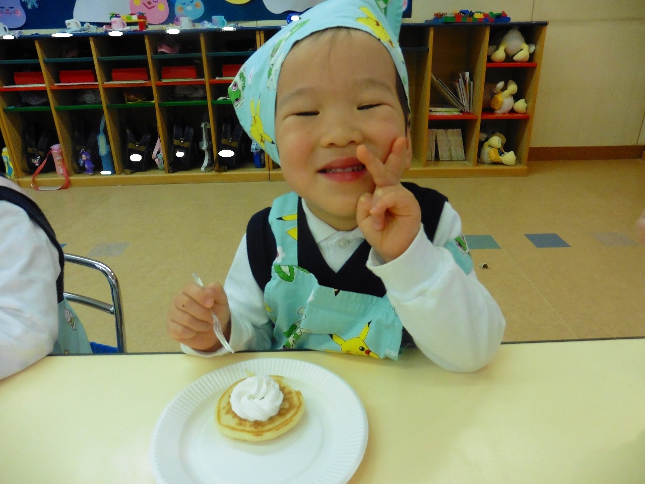 今日は子どもクッキングで、みんなでホイップホットケーキを作りました。